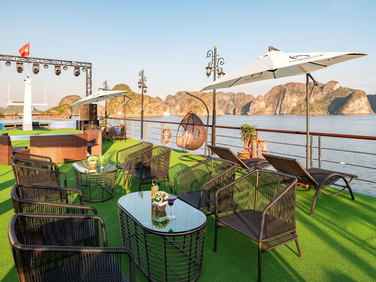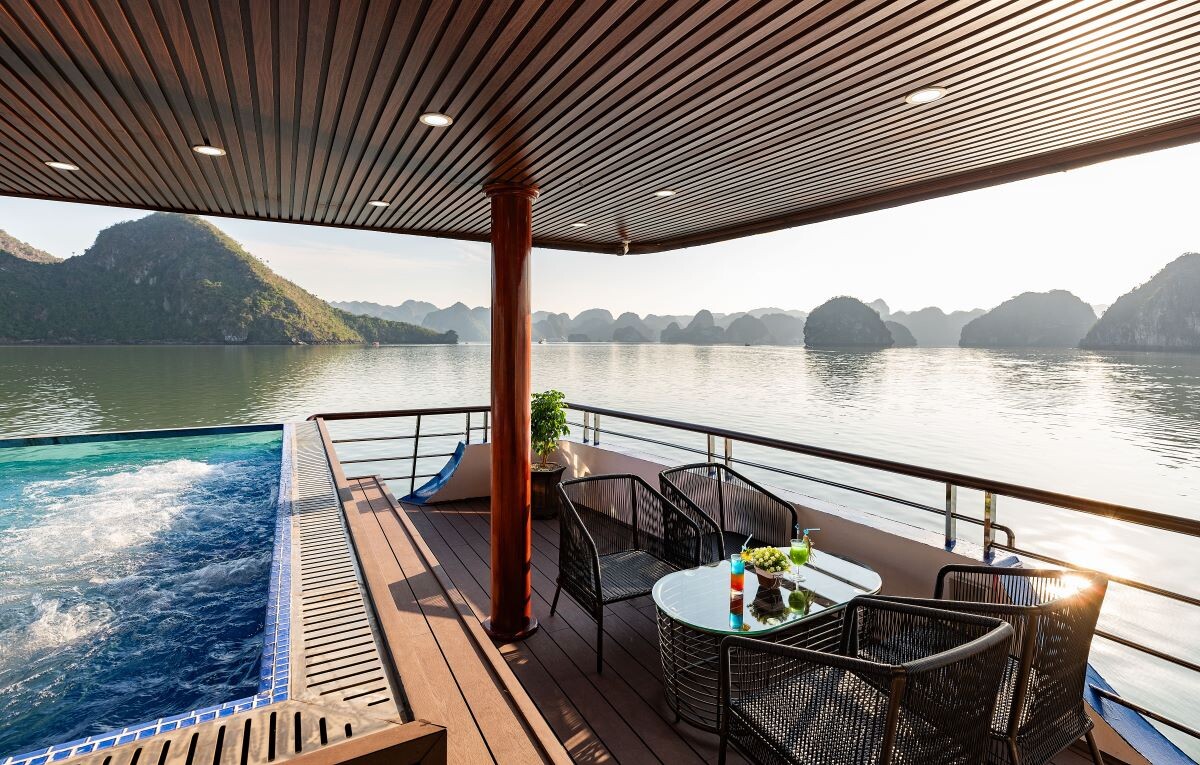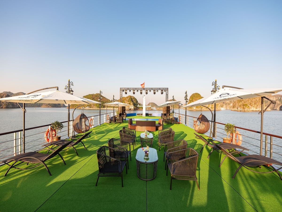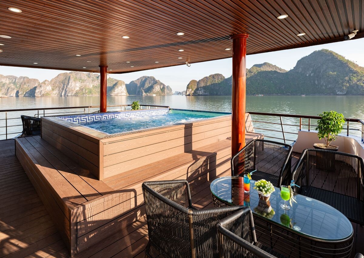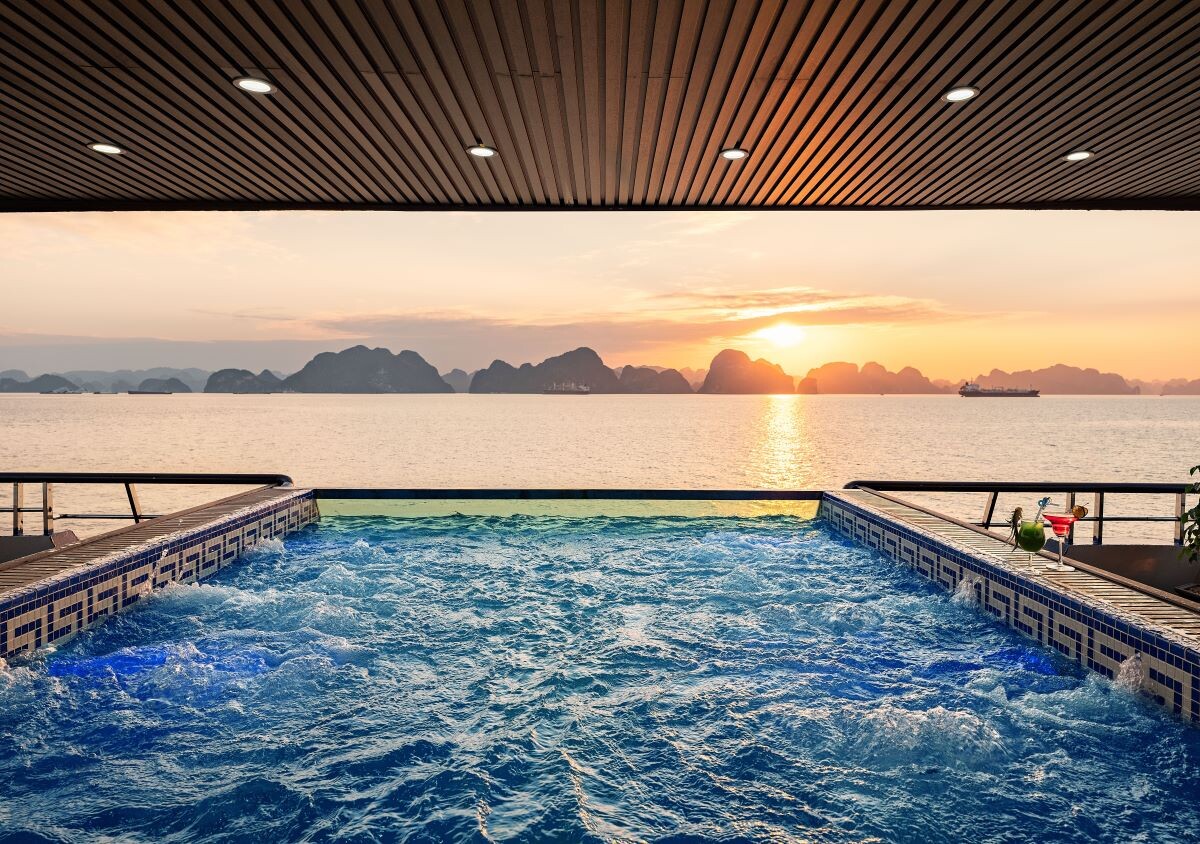 Departing from Halong Cruise Port, Ambrose Cruise follows one of the best classic Halong Bay routes, covering iconic landmarks such as Sung Sot Cave, Luon Cave, and Titop Island. The cruise features three expansive decks, including an elegant ocean-view restaurant, a large sundeck with photo backdrops, a stage for entertainment, and an infinity Jacuzzi pool available year-round.