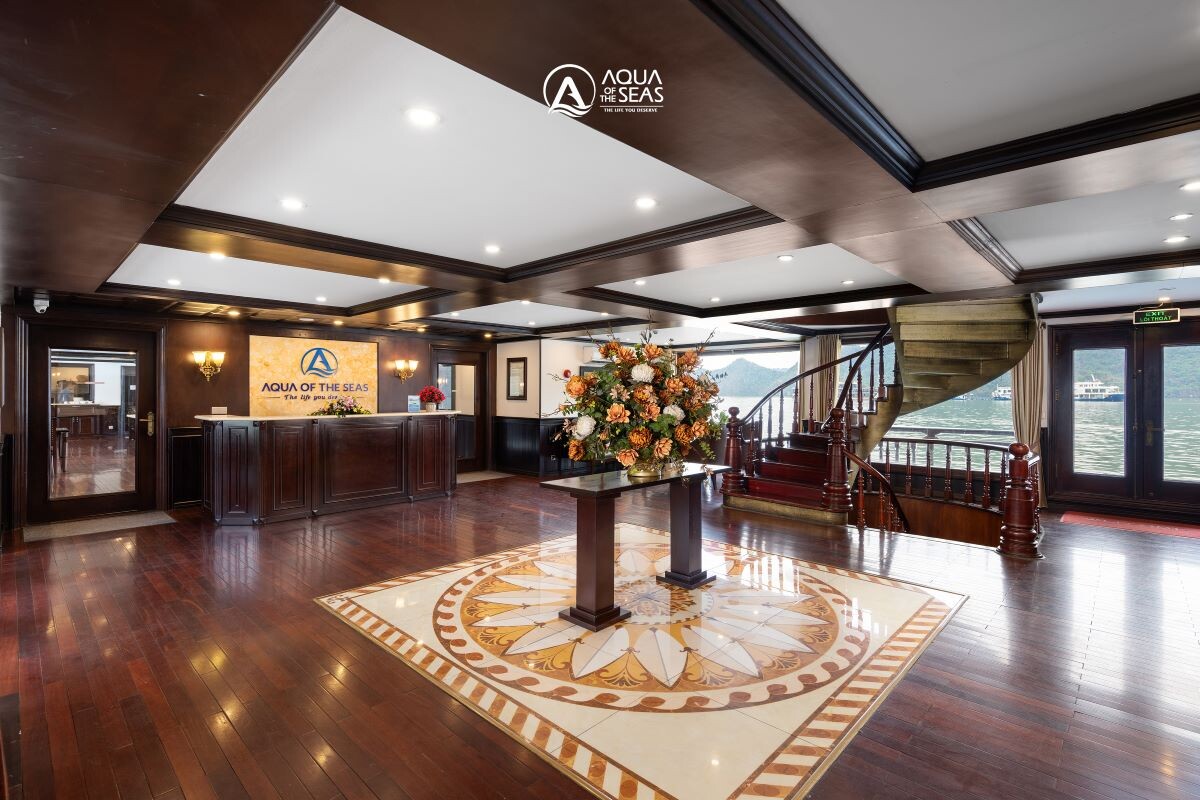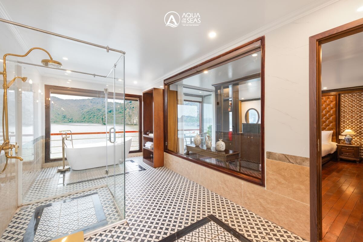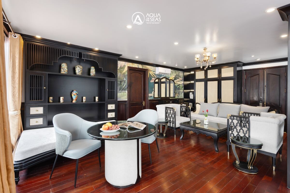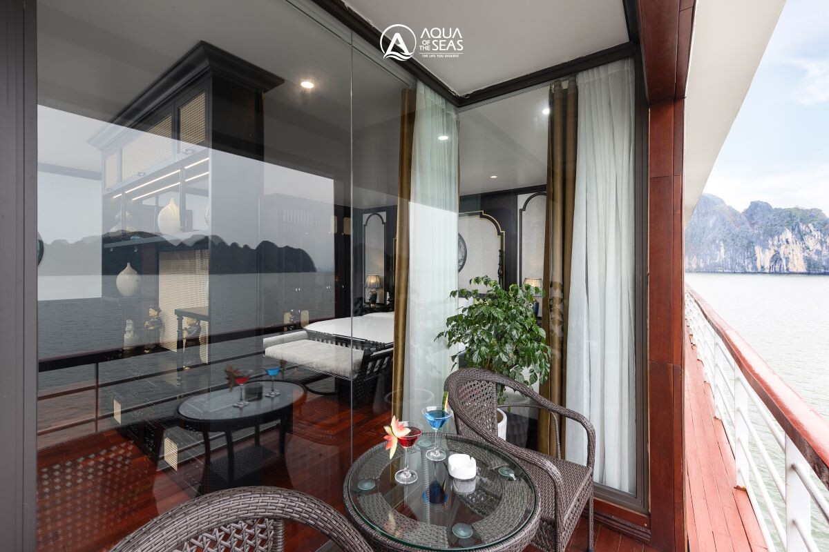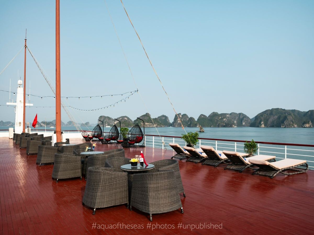 Launched in February 2023, Aqua of the Seas is a contemporary 5-star ship sailing Ha Long & Lan Ha Bay, purpose-built for space and views. All 32 suites feature a private balcony and bathtub, so every guest enjoys immersive bay panoramas in complete comfort. The vessel spans 77.68m in length across 4 decks with capacity for up to 100 guests, integrating generous public spaces without sacrificing privacy. Onboard facilities include an elegant restaurant & bar, expansive sundeck, outdoor swimming pool & jacuzzi, gym & spa, a children’s play area, and full conference/meeting capabilities, ideal for both leisure escapes and special events. Dining takes place in a 180m² restaurant seating up to 100 guests, where Vietnamese favorites and Western classics are served against sweeping bay views. For those seeking elevated indulgence, premium suites climb to 80m², crowned by a 160m² President Suite with outdoor jacuzzi and panorama views.