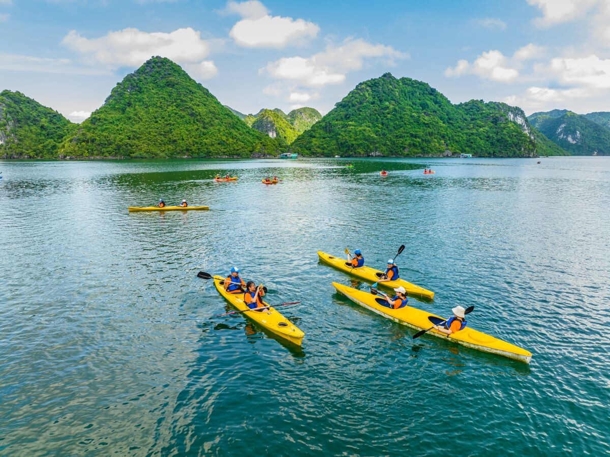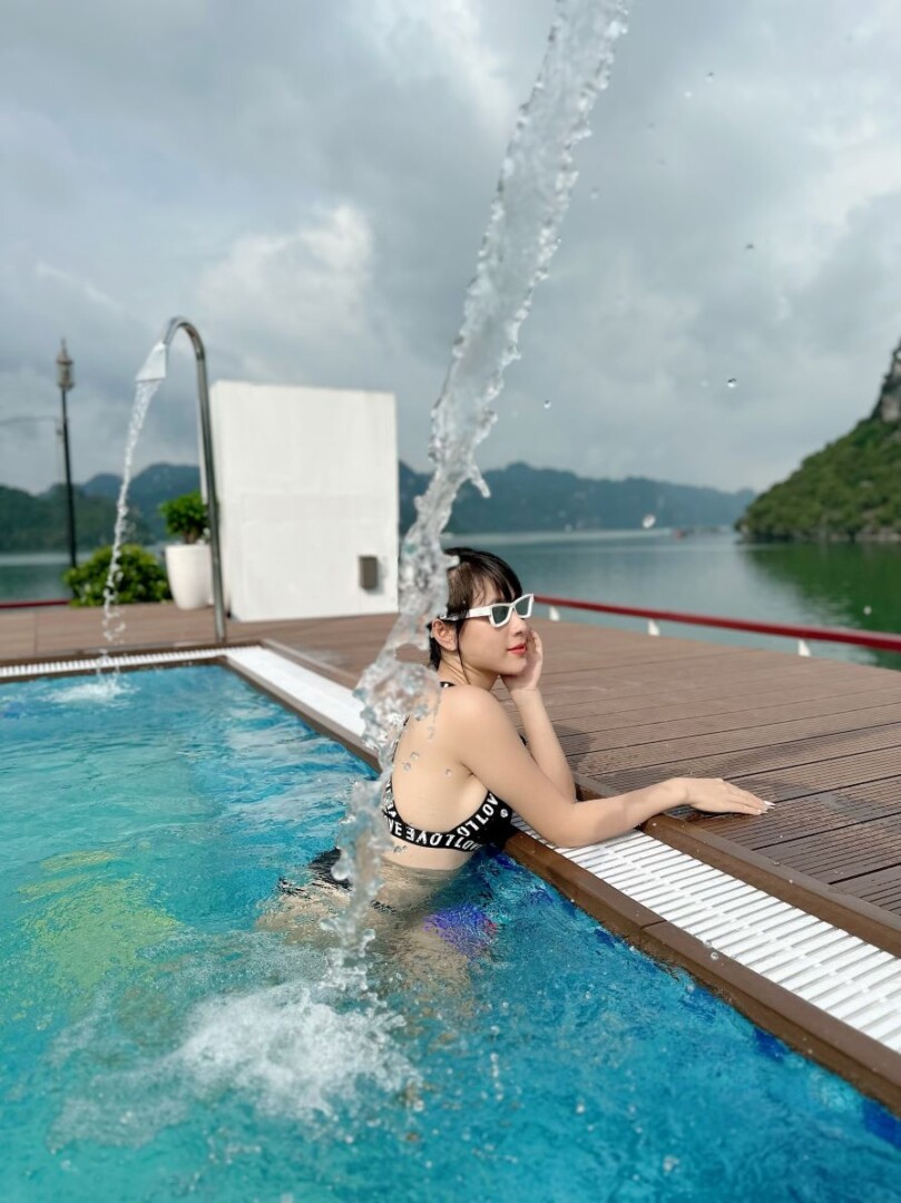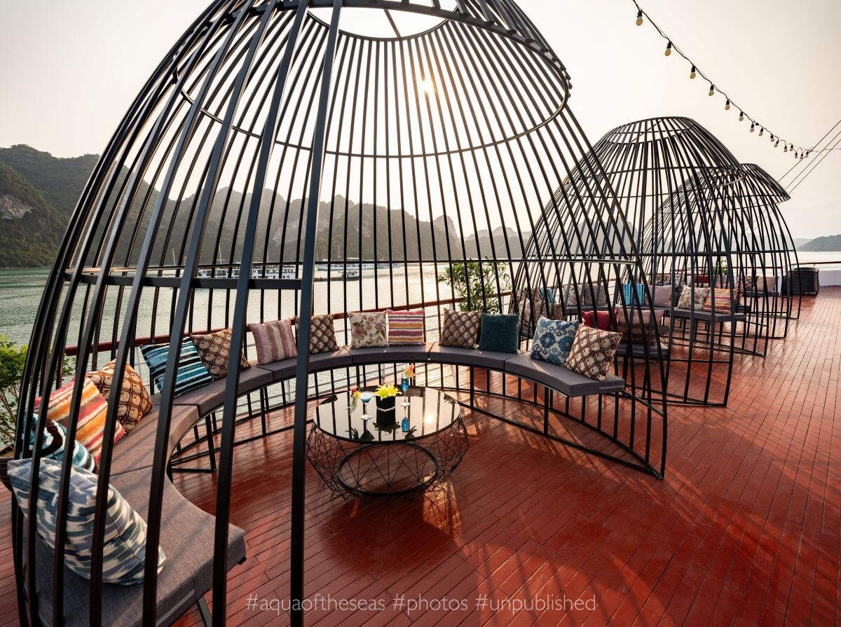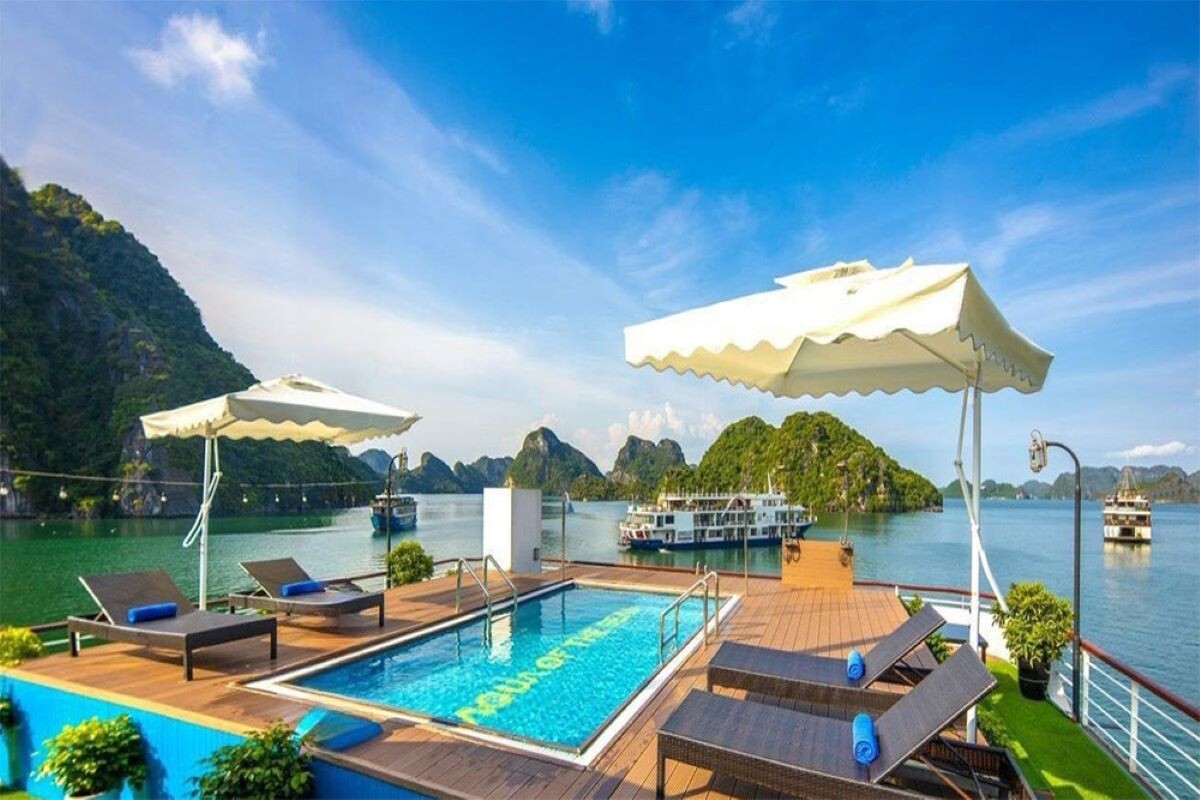 Launched in February 2023, Aqua of the Seas is a contemporary 5-star ship sailing Ha Long & Lan Ha Bay, purpose-built for space and views. All 32 suites feature a private balcony and bathtub, so every guest enjoys immersive bay panoramas in complete comfort. The vessel spans 77.68m in length across 4 decks with capacity for up to 100 guests, integrating generous public spaces without sacrificing privacy. Onboard facilities include an elegant restaurant & bar, expansive sundeck, outdoor swimming pool & jacuzzi, gym & spa, a children’s play area, and full conference/meeting capabilities, ideal for both leisure escapes and special events. Dining takes place in a 180m² restaurant seating up to 100 guests, where Vietnamese favorites and Western classics are served against sweeping bay views. For those seeking elevated indulgence, premium suites climb to 80m², crowned by a 160m² President Suite with outdoor jacuzzi and panorama views.
