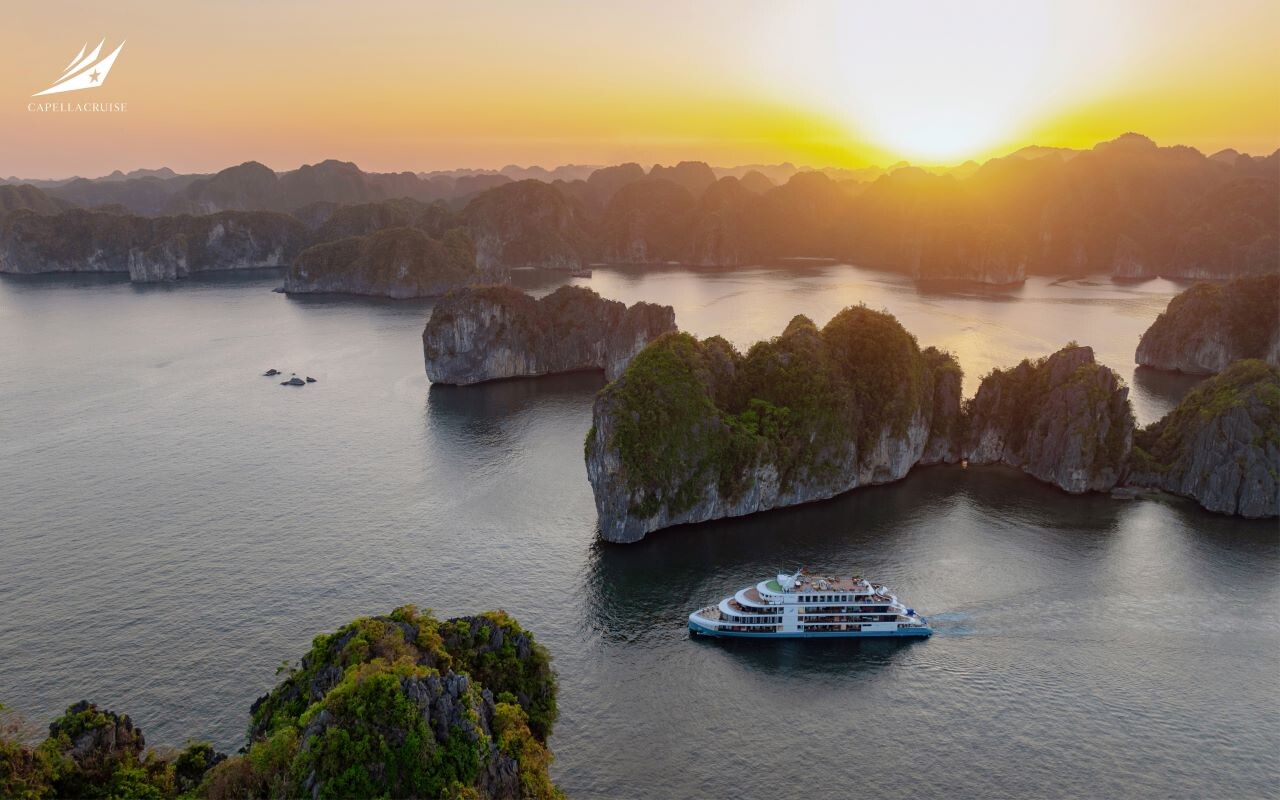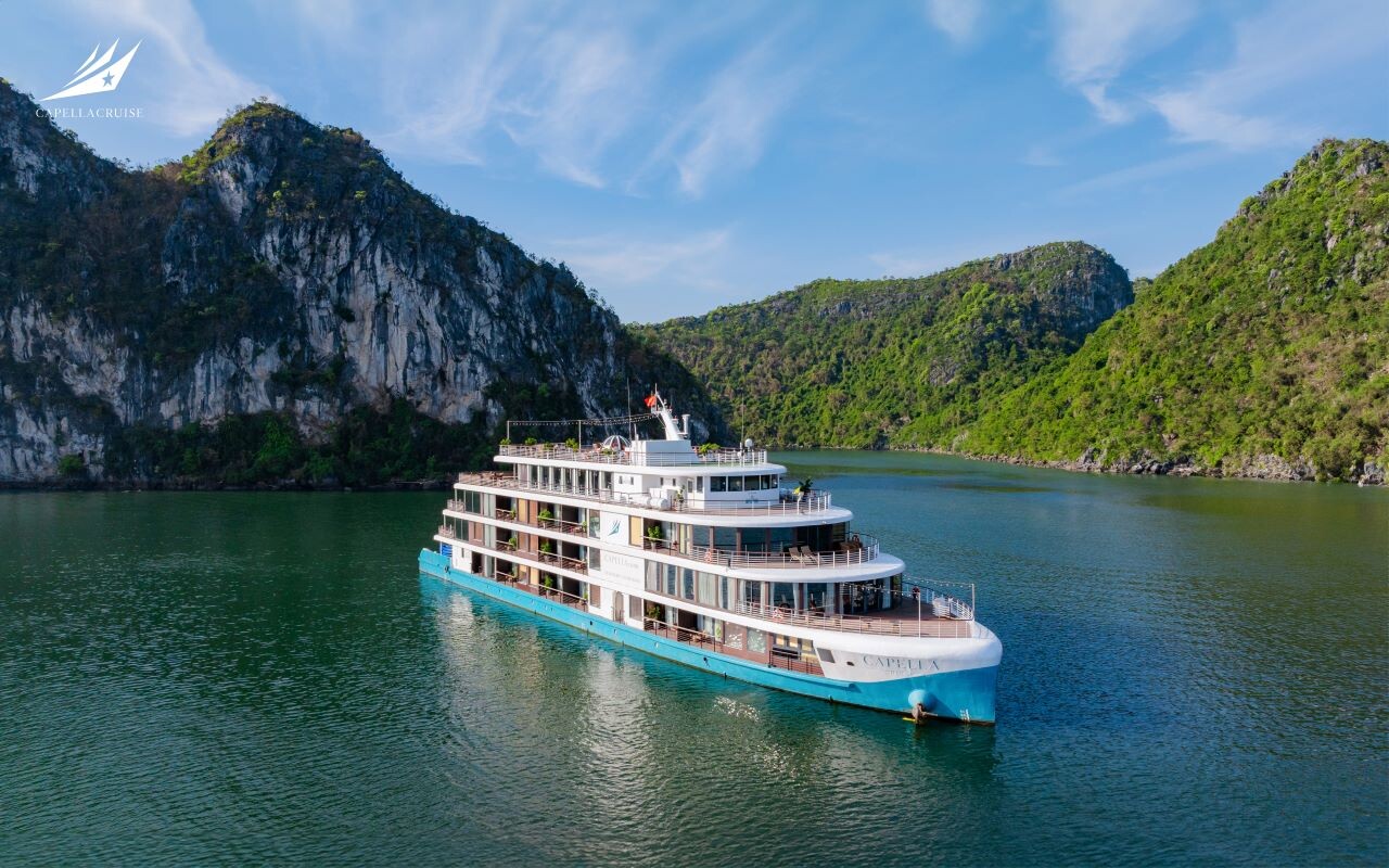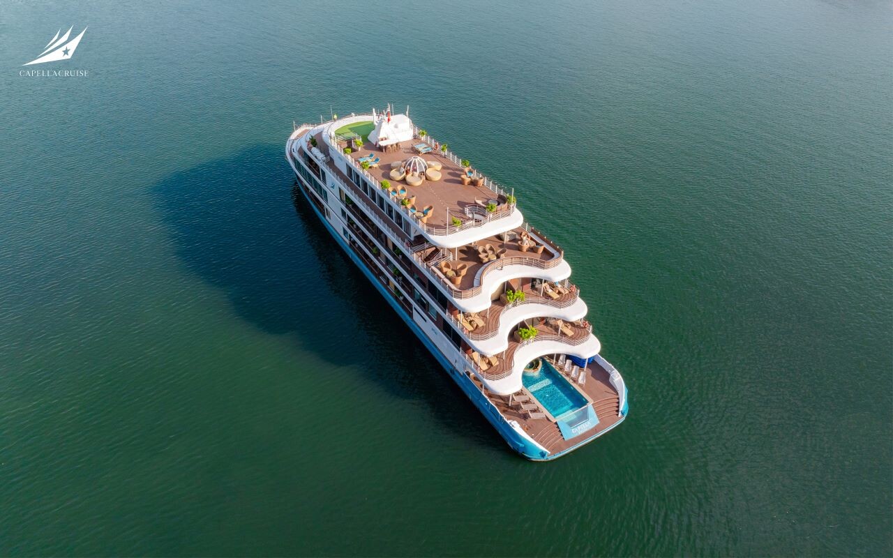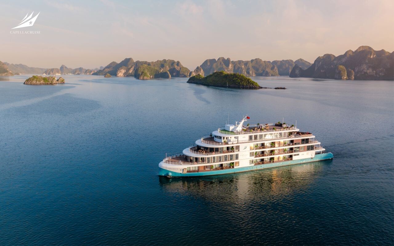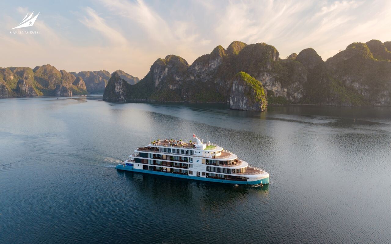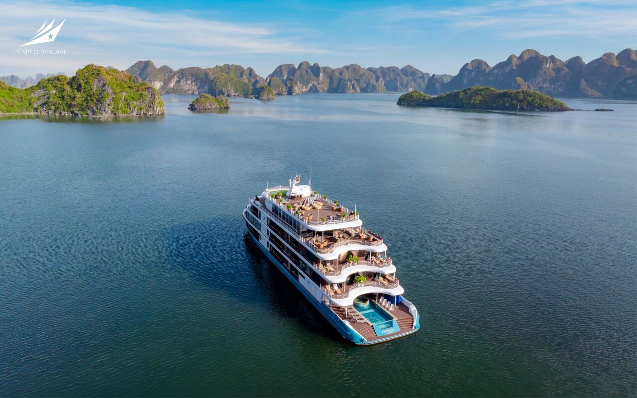 Launched in August 2020, Capella Cruise is a standout 5-star steel yacht sailing through the serene waters of Lan Ha Bay and Halong Bay. Departing from Tuan Chau Marina, this boutique vessel blends sleek superyacht styling with elegant Indochine design across 30 luxurious cabins. Every cabin includes panoramic views, private balconies, bathtubs, and thoughtful amenities. Capella stands out with unrivaled onboard facilities, a heated Oasis Pool & Jacuzzi, a floating ocean pool, inflatable waterslide, mini golf, Cigar & Poker Club, Sea Memory Spa, and a theater lounge. The ship’s name pays homage to the brightest star in the Auriga constellation, aspiring to shine among the finest cruise experiences on the Gulf of Tonkin. Whether you seek family fun, island exploration, or quiet luxury, Capella Cruise delivers with warm service, enriching activities, fine dining, and immersive routes through hidden coves, caves, and vibrant floating villages.