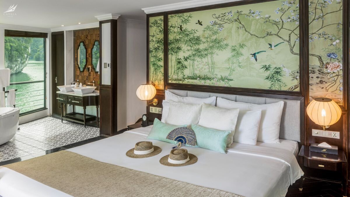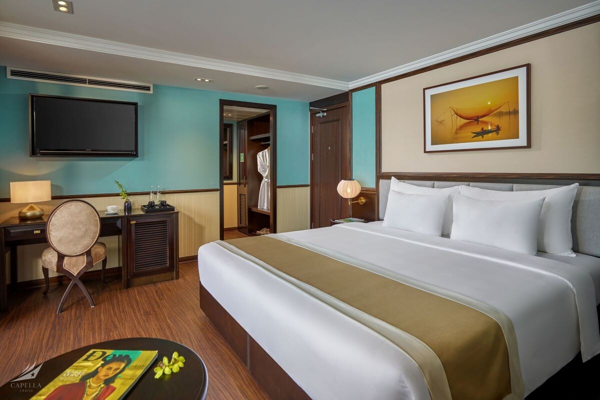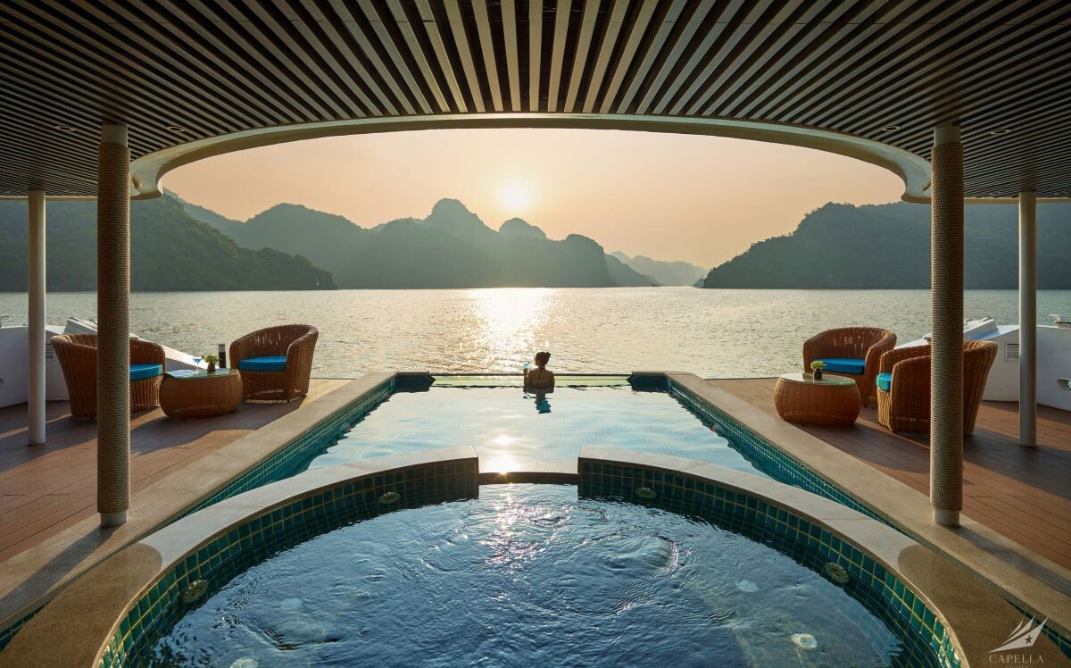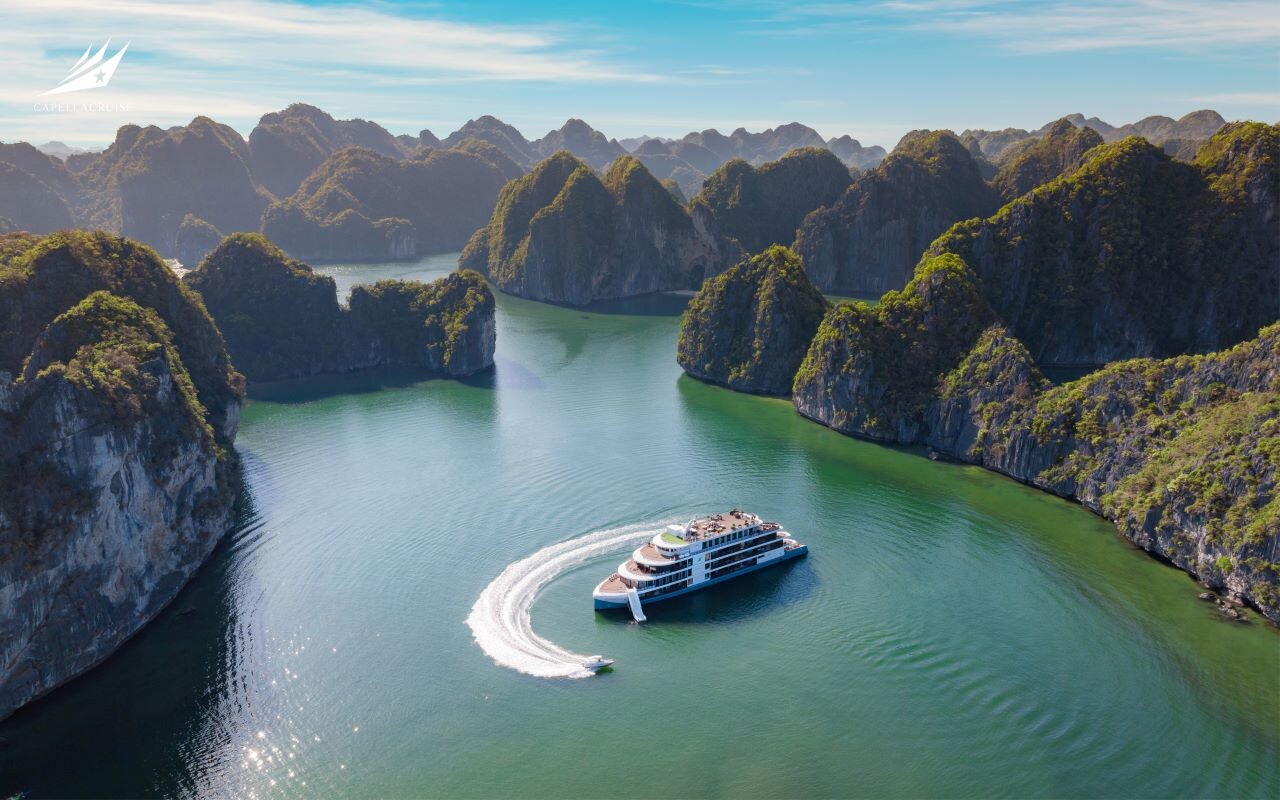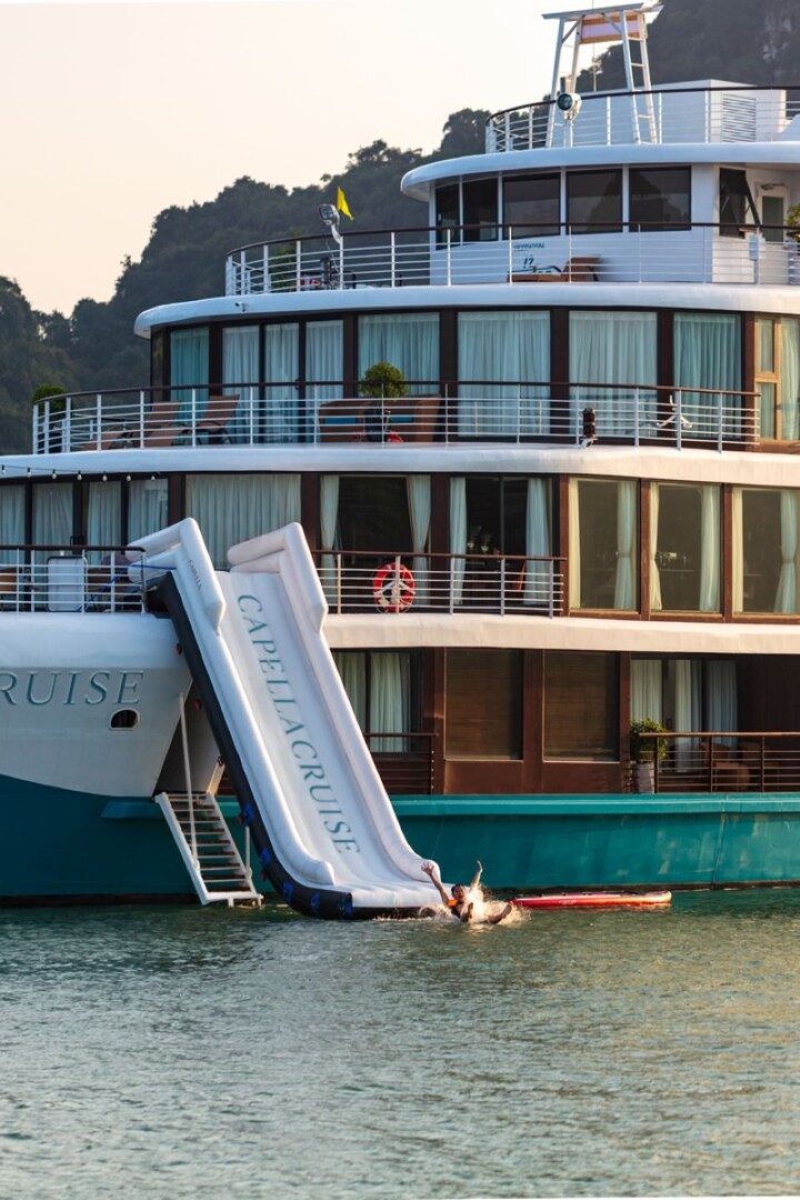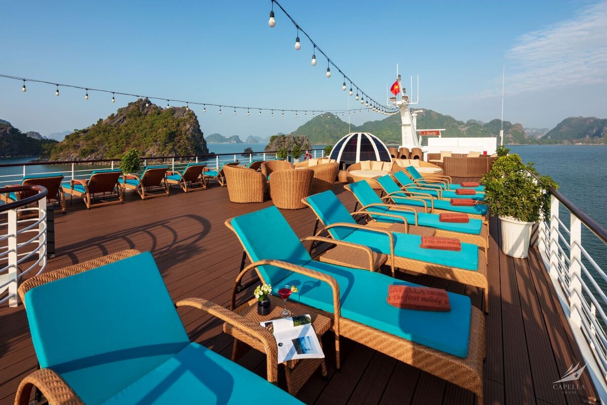 Launched in August 2020, Capella Cruise is a standout 5-star steel yacht sailing through the serene waters of Lan Ha Bay and Halong Bay. Departing from Tuan Chau Marina, this boutique vessel blends sleek superyacht styling with elegant Indochine design across 30 luxurious cabins. Every cabin includes panoramic views, private balconies, bathtubs, and thoughtful amenities. Capella stands out with unrivaled onboard facilities, a heated Oasis Pool & Jacuzzi, a floating ocean pool, inflatable waterslide, mini golf, Cigar & Poker Club, Sea Memory Spa, and a theater lounge. The ship’s name pays homage to the brightest star in the Auriga constellation, aspiring to shine among the finest cruise experiences on the Gulf of Tonkin. Whether you seek family fun, island exploration, or quiet luxury, Capella Cruise delivers with warm service, enriching activities, fine dining, and immersive routes through hidden coves, caves, and vibrant floating villages.