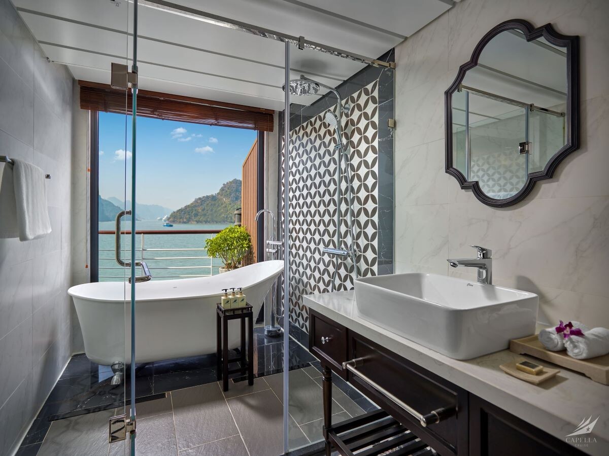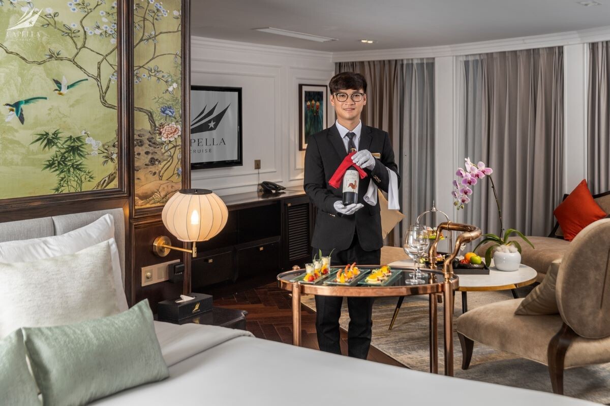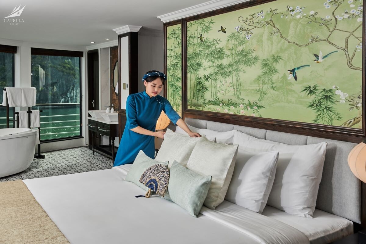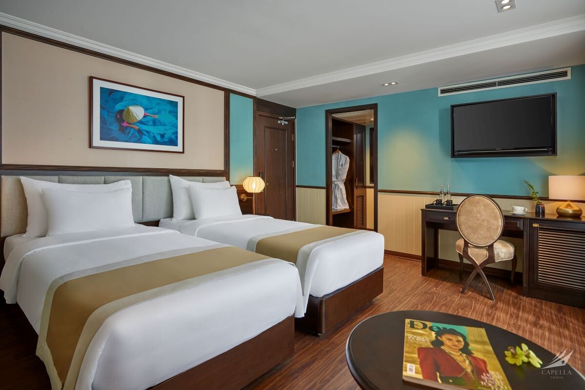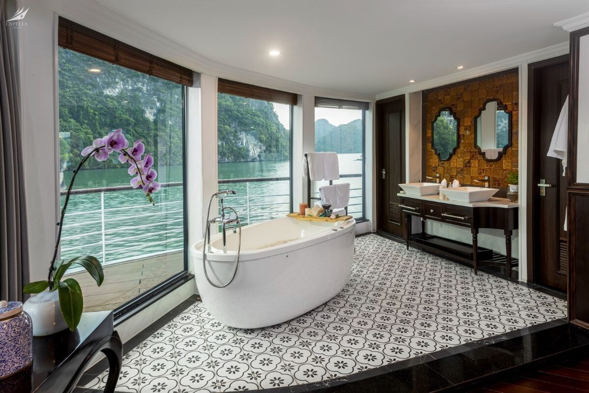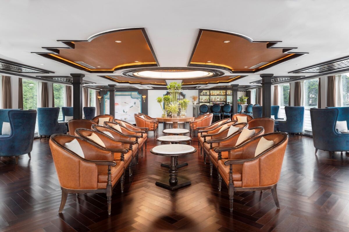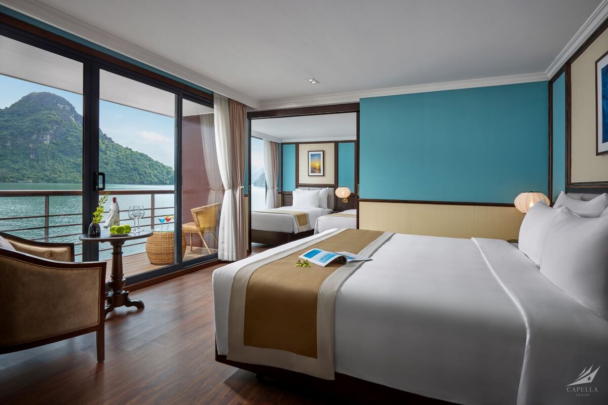Launched in August 2020, Capella Cruise is a standout 5-star steel yacht sailing through the serene waters of Lan Ha Bay and Halong Bay. Departing from Tuan Chau Marina, this boutique vessel blends sleek superyacht styling with elegant Indochine design across 30 luxurious cabins. Every cabin includes panoramic views, private balconies, bathtubs, and thoughtful amenities. Capella stands out with unrivaled onboard facilities, a heated Oasis Pool & Jacuzzi, a floating ocean pool, inflatable waterslide, mini golf, Cigar & Poker Club, Sea Memory Spa, and a theater lounge. The ship’s name pays homage to the brightest star in the Auriga constellation, aspiring to shine among the finest cruise experiences on the Gulf of Tonkin. Whether you seek family fun, island exploration, or quiet luxury, Capella Cruise delivers with warm service, enriching activities, fine dining, and immersive routes through hidden coves, caves, and vibrant floating villages.