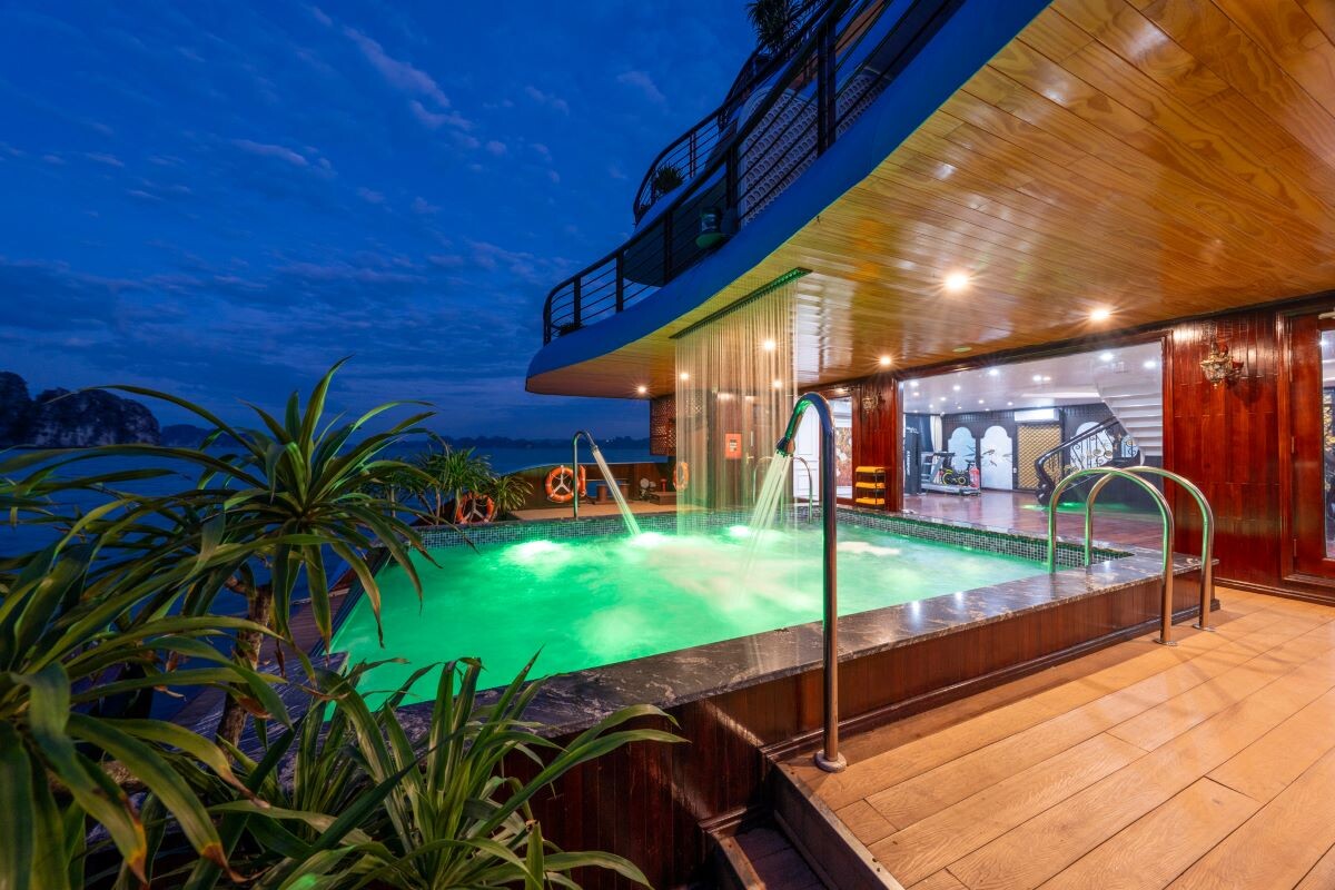 Launched in 2025, the Cycad Cruise is the newest addition to luxury cruising in Bai Tu Long Bay. Measuring 56m in length and 14m in width, this 4-deck vessel offers 24 suites, accommodating up to 56 adults and 24 children overnight, or 89 passengers including day visitors. Designed with a blend of modern comfort and safety, the cruise ensures an exceptional sailing experience with premium facilities such as a swimming pool, a spacious lounge, a fine-dining restaurant, and a rooftop Breeze Bar.