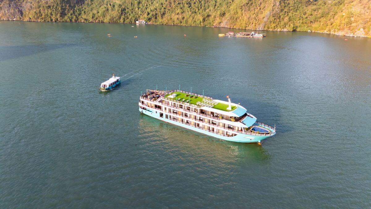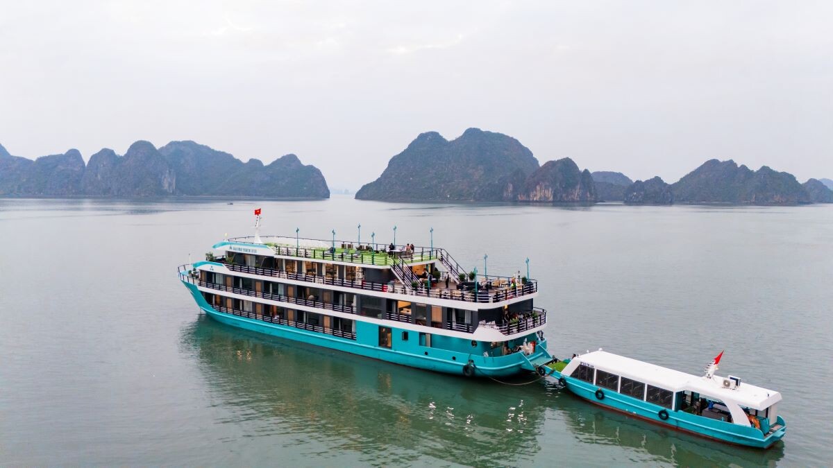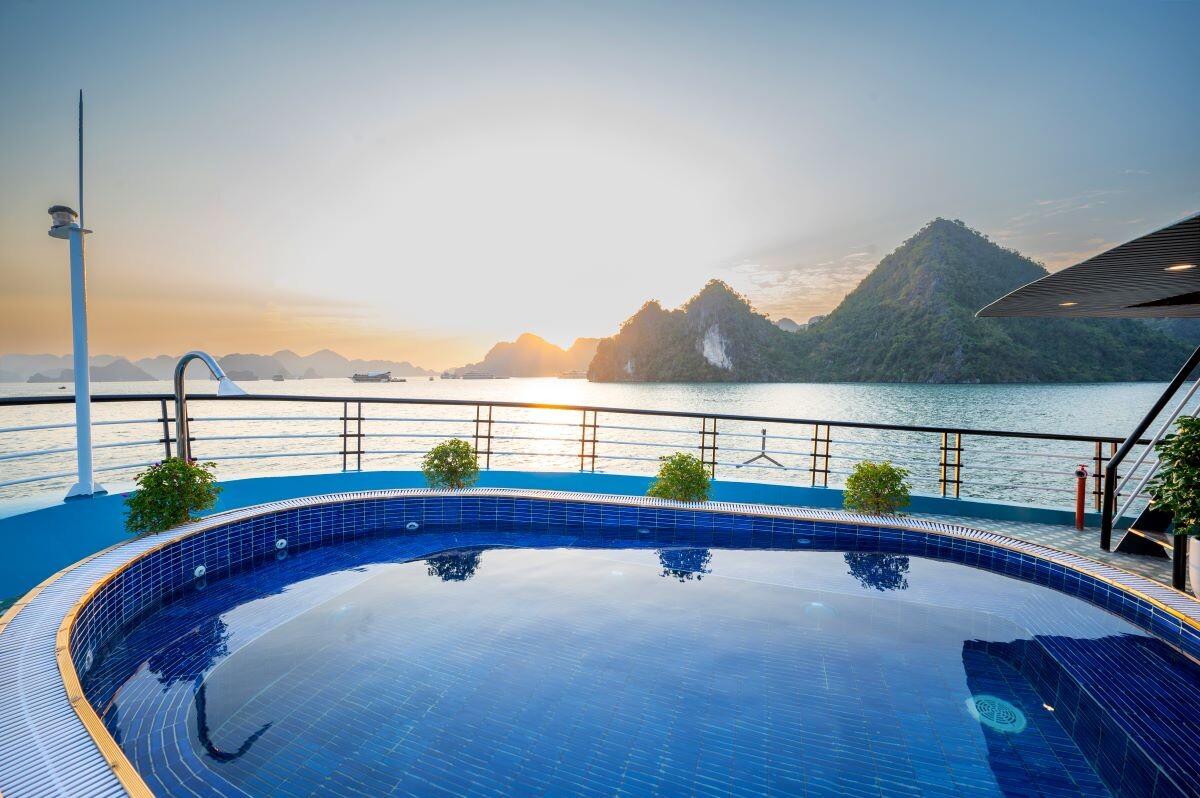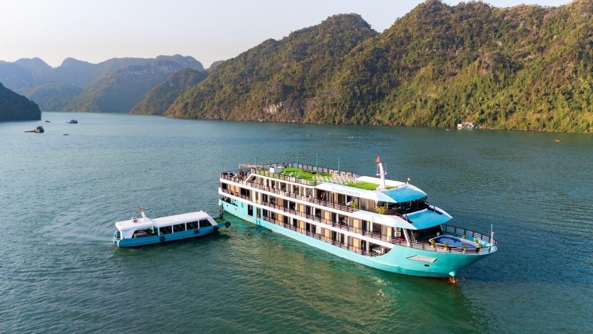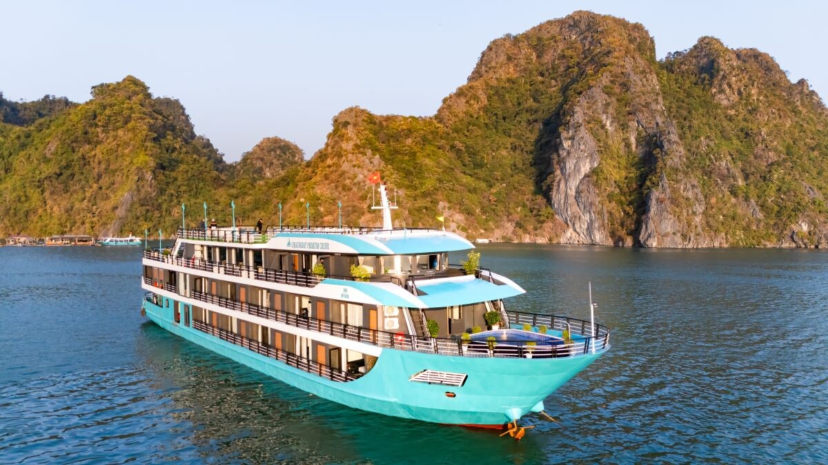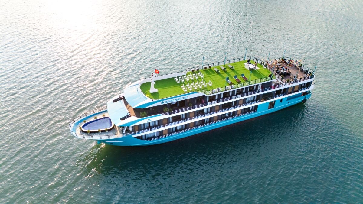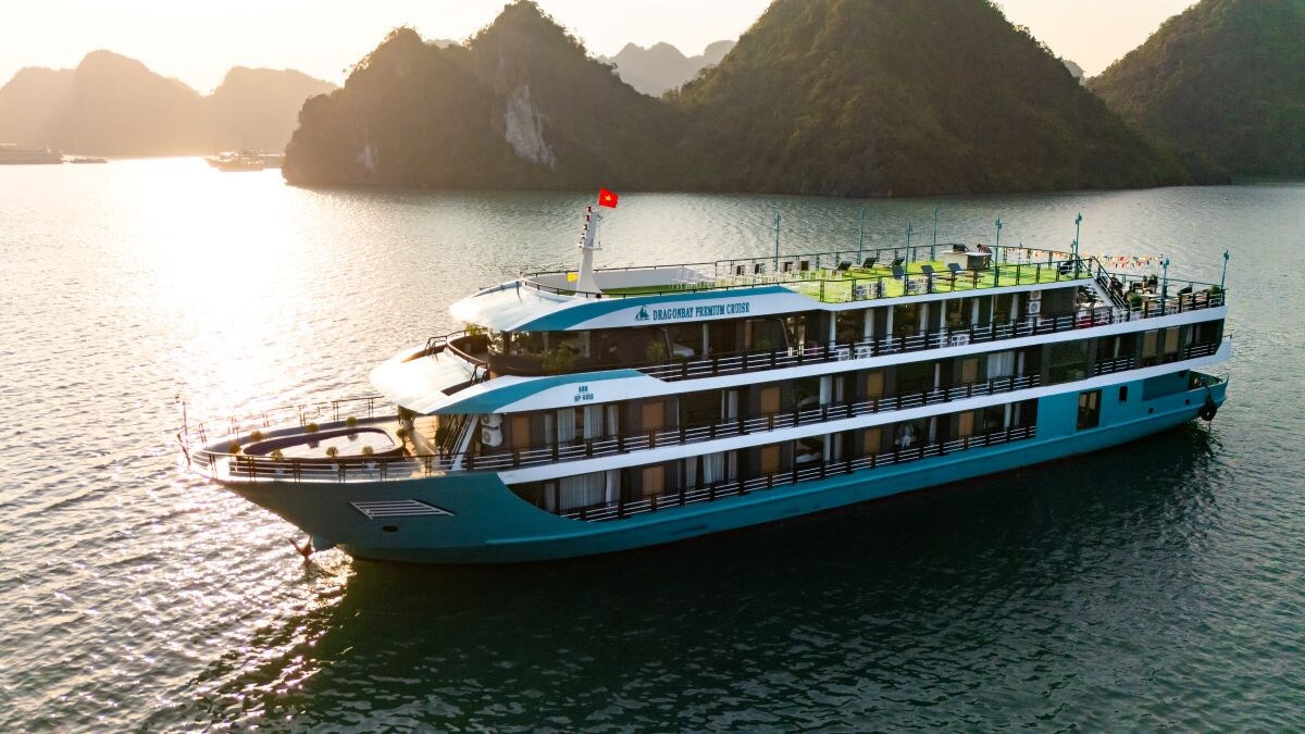 Launched in 2023, Dragon Bay Premium Cruise is a new-generation steel vessel that combines Vietnamese craftsmanship with modern luxury. Operated by a professional team experienced in Halong and Lan Ha Bay cruising, the ship redefines boutique sailing with elegance and comfort. Featuring 26 spacious cabins and suites ranging from 32m² to 64m², each equipped with a private balcony or terrace, Dragon Bay Premium Cruise ensures panoramic views and a refined onboard ambiance. Guests can enjoy premium facilities such as a mini pool on the sundeck, tea ceremony area, spa and massage service, sky bar, and outdoor dining space. Departing from Tuan Chau Marina, the cruise sails through the serene waters of Lan Ha Bay, visiting iconic spots such as the Dark & Bright Cave, the peaceful Tra Bau area, and the charming Viet Hai Village on Cat Ba Island. It’s an ideal choice for travelers seeking both relaxation and discovery within Vietnam’s most tranquil bay.