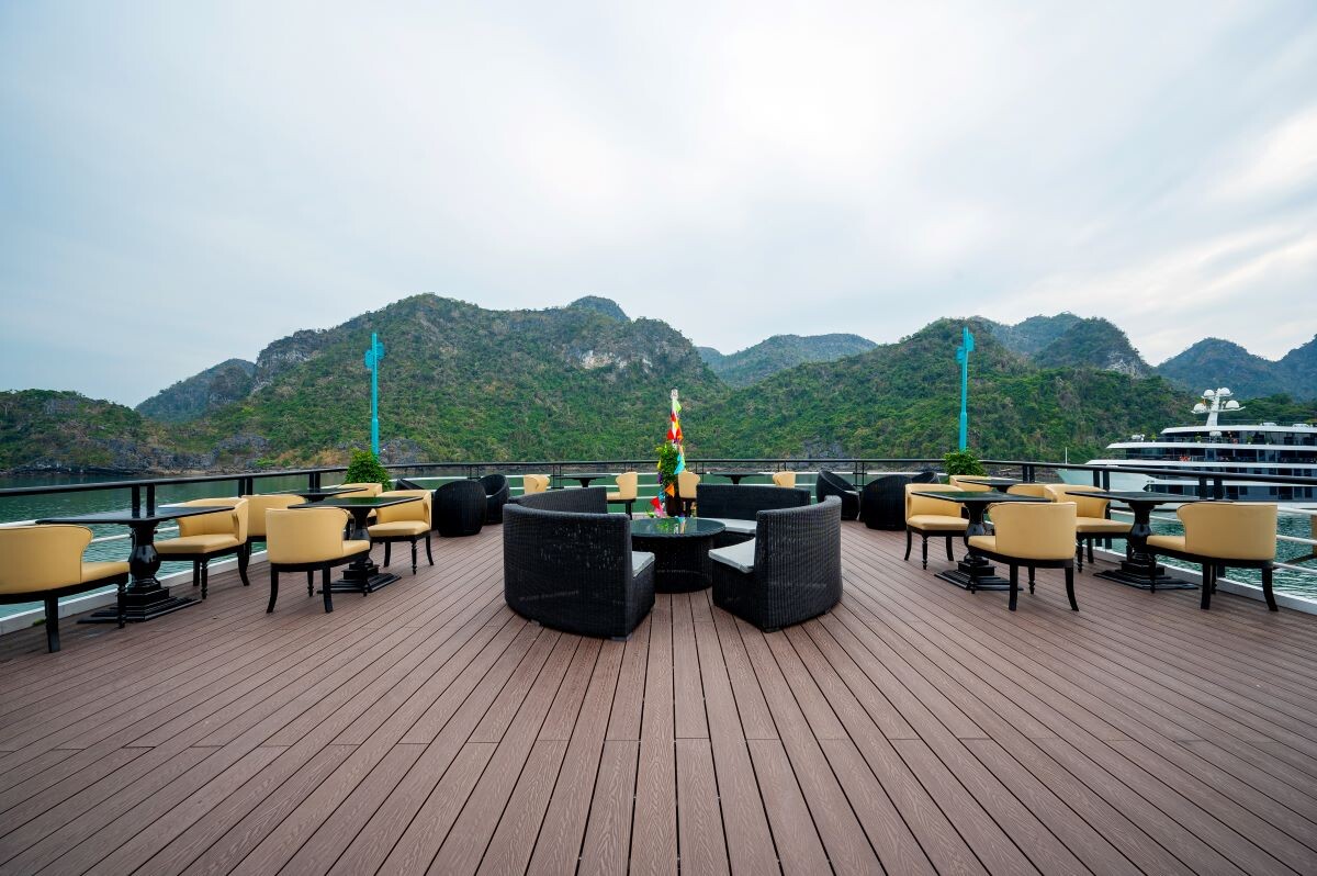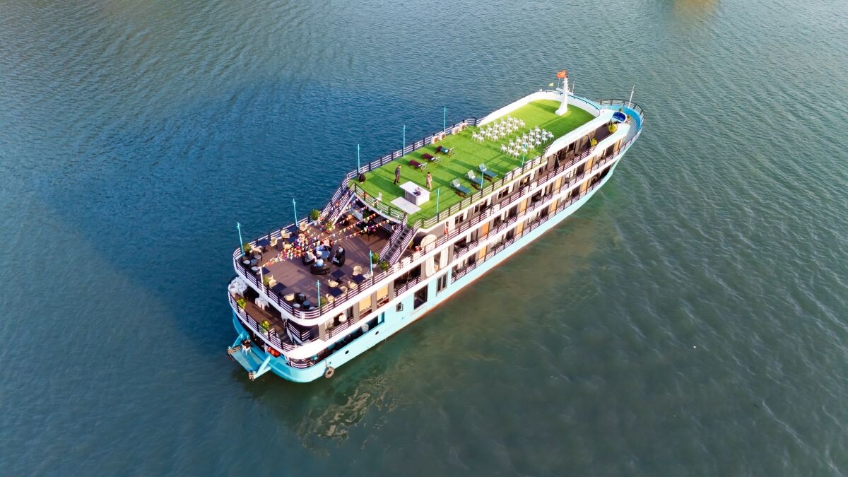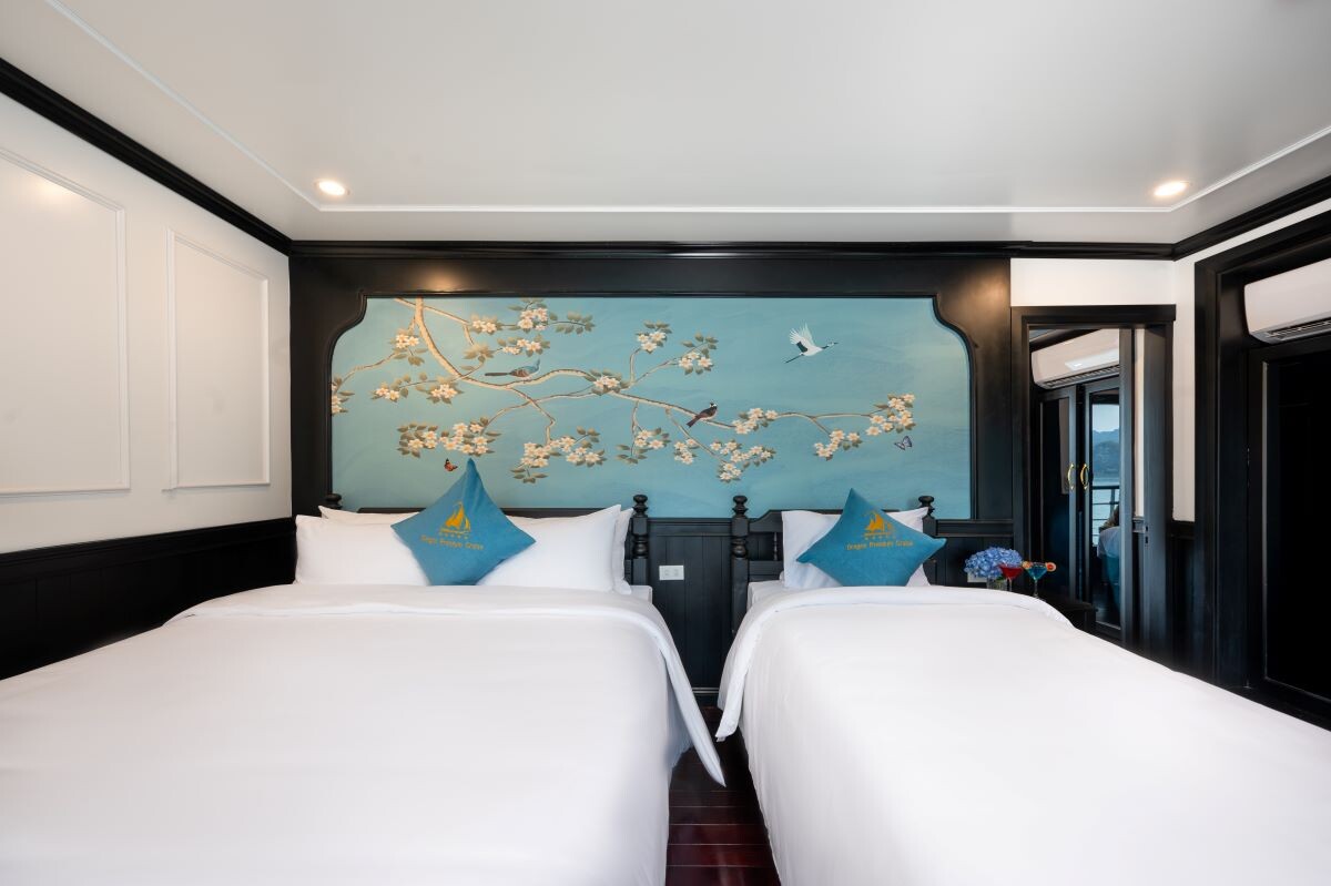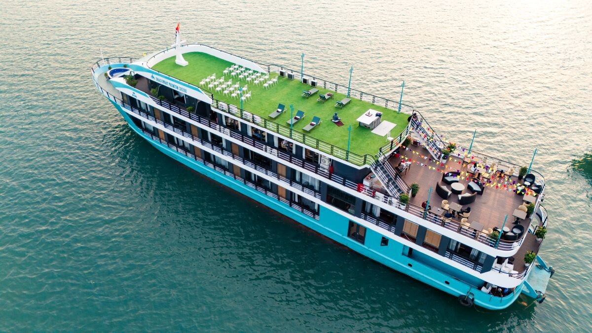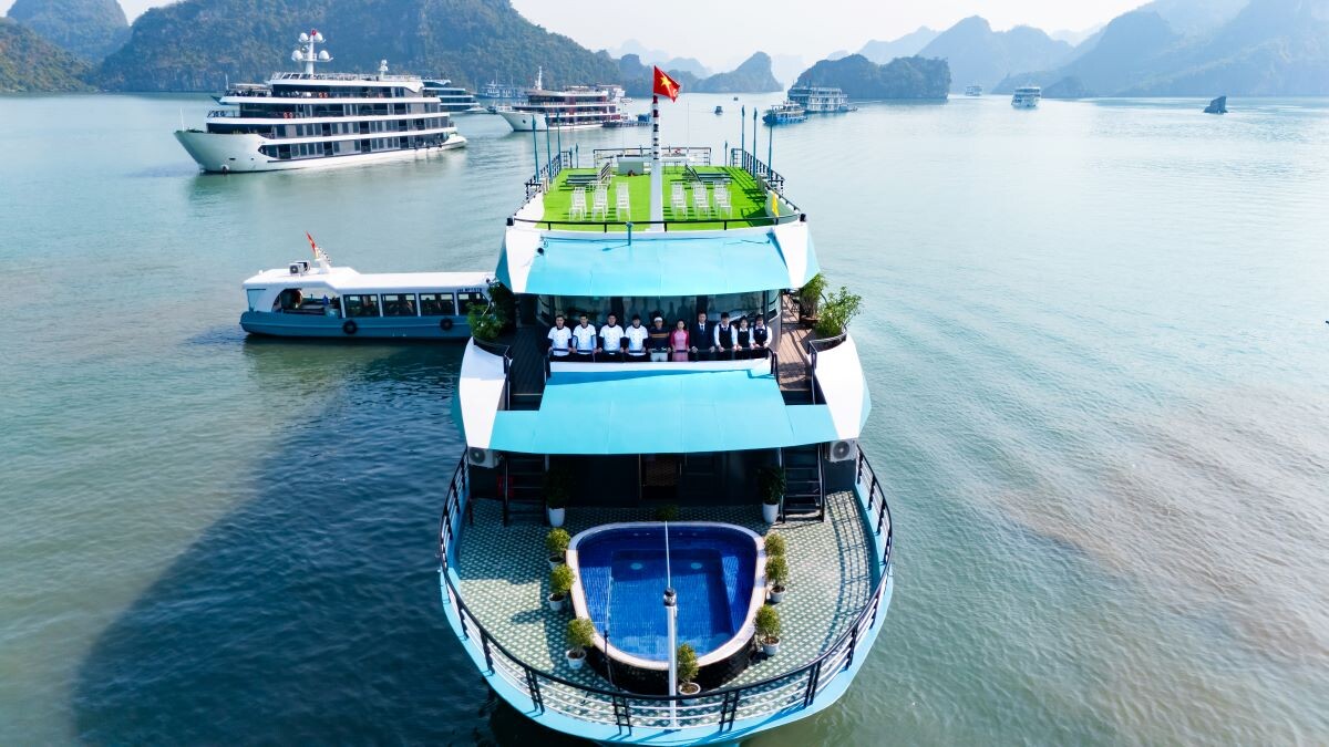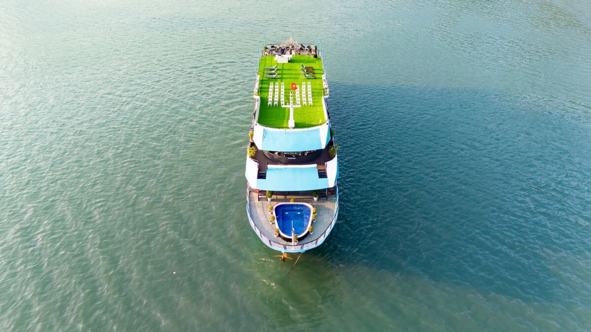 Launched in 2023, Dragon Bay Premium Cruise is a new-generation steel vessel that combines Vietnamese craftsmanship with modern luxury. Operated by a professional team experienced in Halong and Lan Ha Bay cruising, the ship redefines boutique sailing with elegance and comfort. Featuring 26 spacious cabins and suites ranging from 32m² to 64m², each equipped with a private balcony or terrace, Dragon Bay Premium Cruise ensures panoramic views and a refined onboard ambiance. Guests can enjoy premium facilities such as a mini pool on the sundeck, tea ceremony area, spa and massage service, sky bar, and outdoor dining space. Departing from Tuan Chau Marina, the cruise sails through the serene waters of Lan Ha Bay, visiting iconic spots such as the Dark & Bright Cave, the peaceful Tra Bau area, and the charming Viet Hai Village on Cat Ba Island. It’s an ideal choice for travelers seeking both relaxation and discovery within Vietnam’s most tranquil bay.