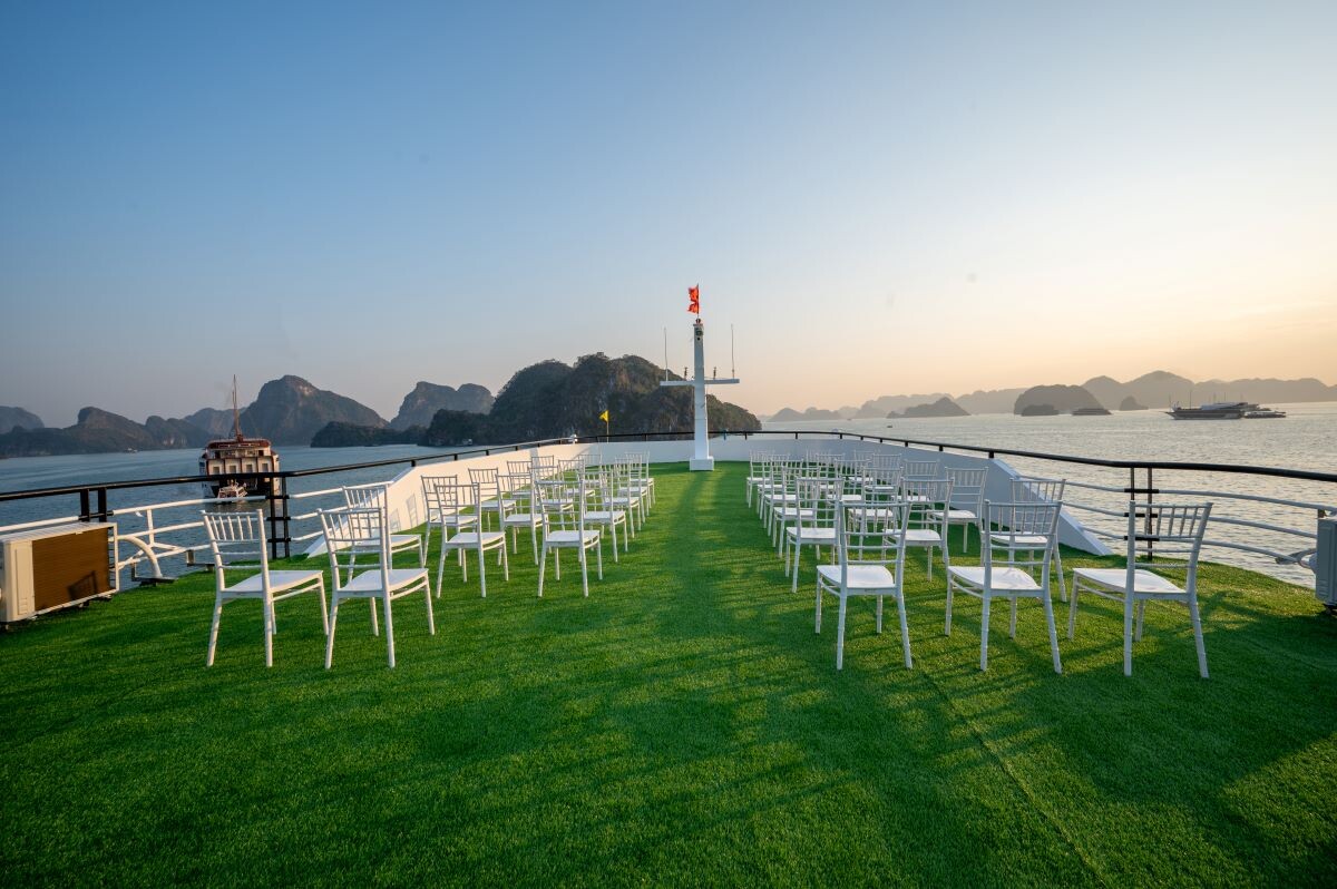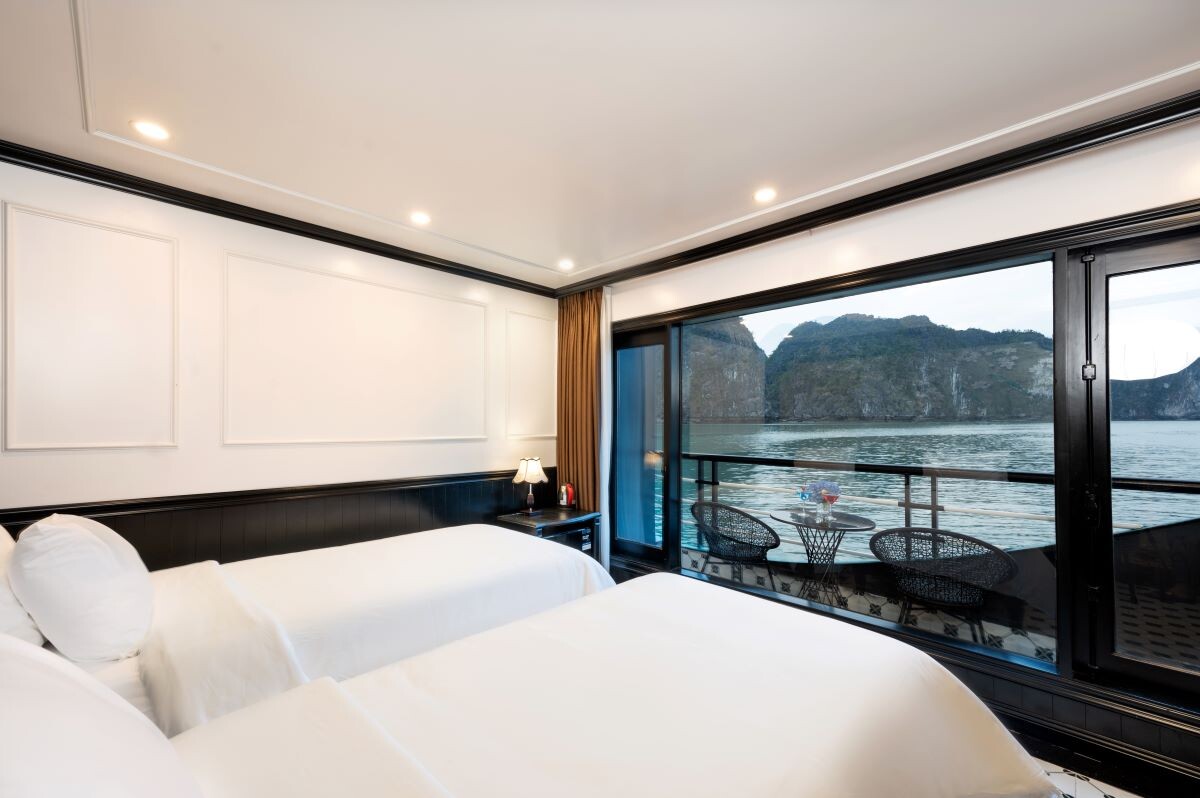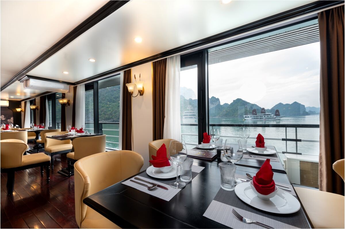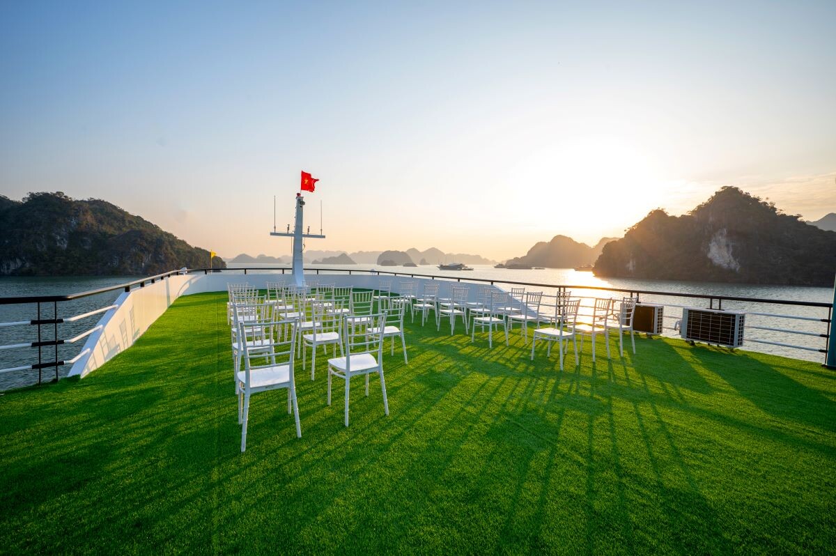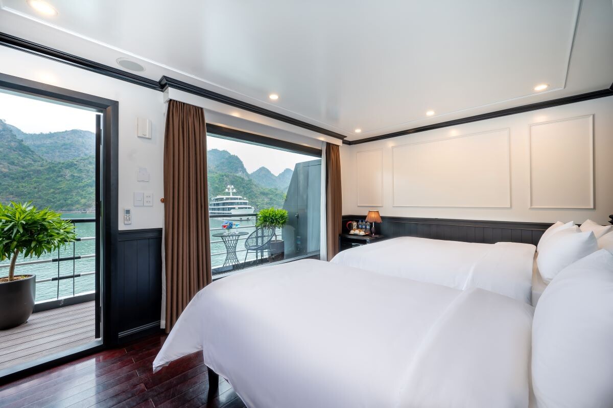 Launched in 2023, Dragon Bay Premium Cruise is a new-generation steel vessel that combines Vietnamese craftsmanship with modern luxury. Operated by a professional team experienced in Halong and Lan Ha Bay cruising, the ship redefines boutique sailing with elegance and comfort. Featuring 26 spacious cabins and suites ranging from 32m² to 64m², each equipped with a private balcony or terrace, Dragon Bay Premium Cruise ensures panoramic views and a refined onboard ambiance. Guests can enjoy premium facilities such as a mini pool on the sundeck, tea ceremony area, spa and massage service, sky bar, and outdoor dining space. Departing from Tuan Chau Marina, the cruise sails through the serene waters of Lan Ha Bay, visiting iconic spots such as the Dark & Bright Cave, the peaceful Tra Bau area, and the charming Viet Hai Village on Cat Ba Island. It’s an ideal choice for travelers seeking both relaxation and discovery within Vietnam’s most tranquil bay.