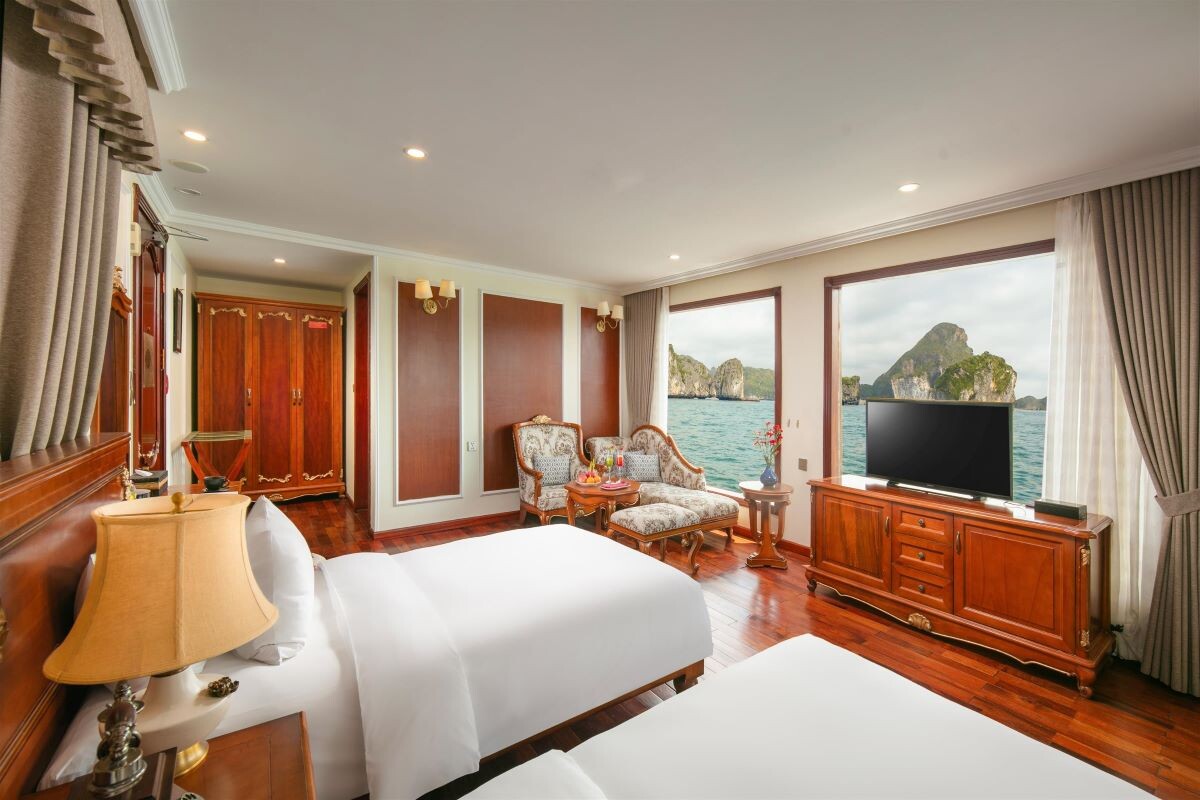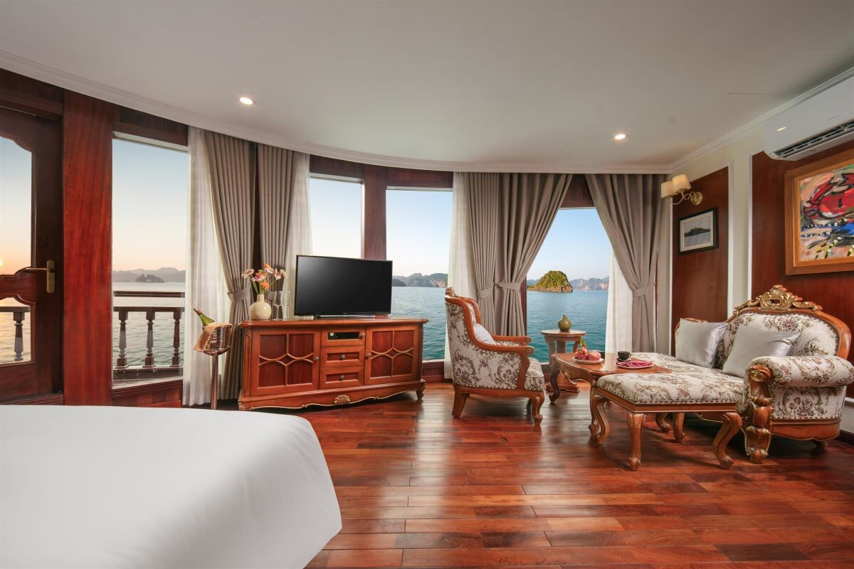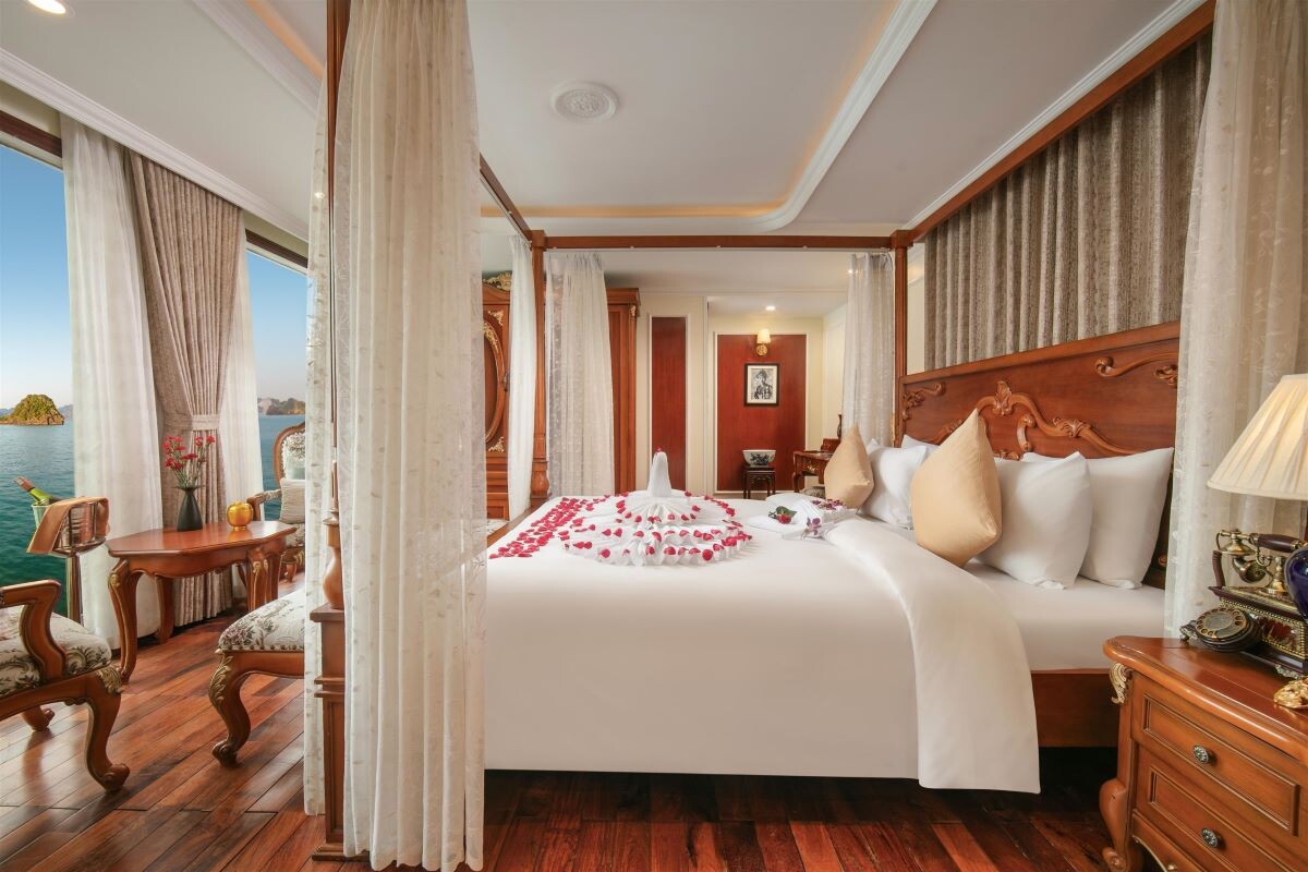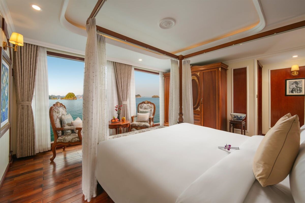 Step aboard the Emperor Cruise - Vietnam’s first boutique cruise line, and experience a masterpiece of royal elegance on the waters of Halong Bay. Launched in 2017 and inspired by the lavish lifestyle of Emperor Bao Dai, Vietnam’s last monarch, this ultra-luxury vessel blends 1930s Indochine glamour with modern sophistication. With only 10 opulent suites ranging from 35m² to 70m², each offering full ocean views, private balconies, and Jacuzzi bathtubs, the cruise ensures unmatched privacy and exclusivity for a maximum of 30 guests. From embarkation at Tuan Chau International Marina, every detail is tailored for a truly all-inclusive royal experience, complete with personal butler service, 24-hour room service, and world-class cuisine. The ship itself is a floating work of art, featuring elegant restaurants, a fine art library, the Heritage Spa, and expansive sundecks for panoramic views. Each suite is uniquely designed to tell its own story, blending Vietnamese culture, history, and artistry. Guests can enjoy curated excursions, from kayaking and cultural explorations to sunset dining and indulgent spa treatments. Whether savoring afternoon tea, practicing Vovinam, or simply relaxing in your suite’s luxurious ambiance, every moment aboard the Emperor Cruise is designed to be extraordinary.