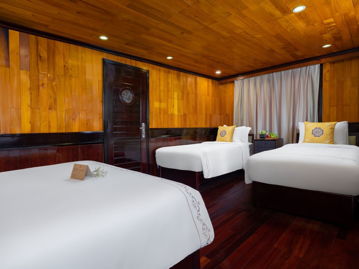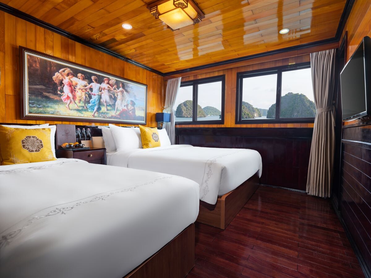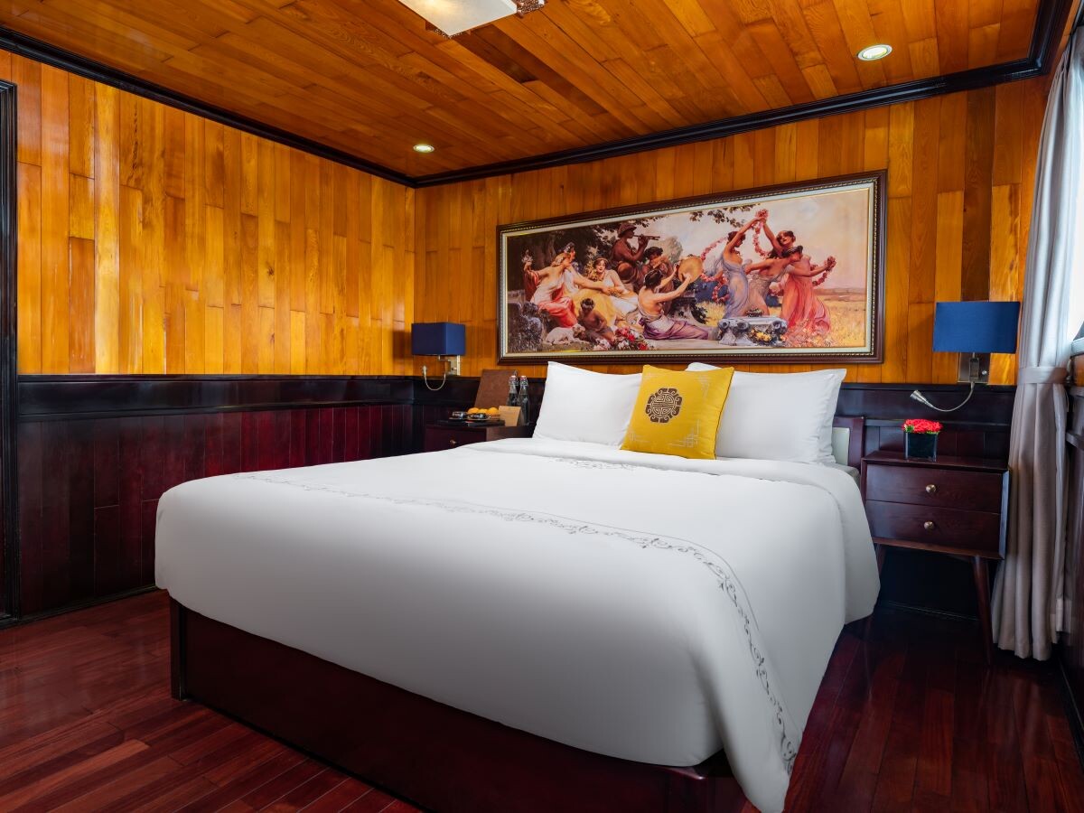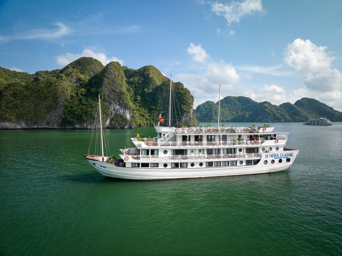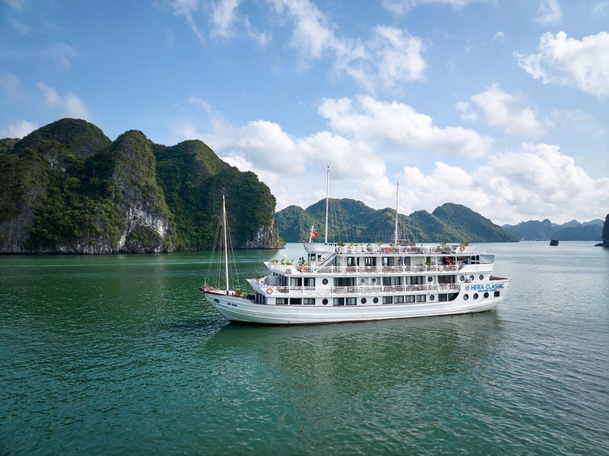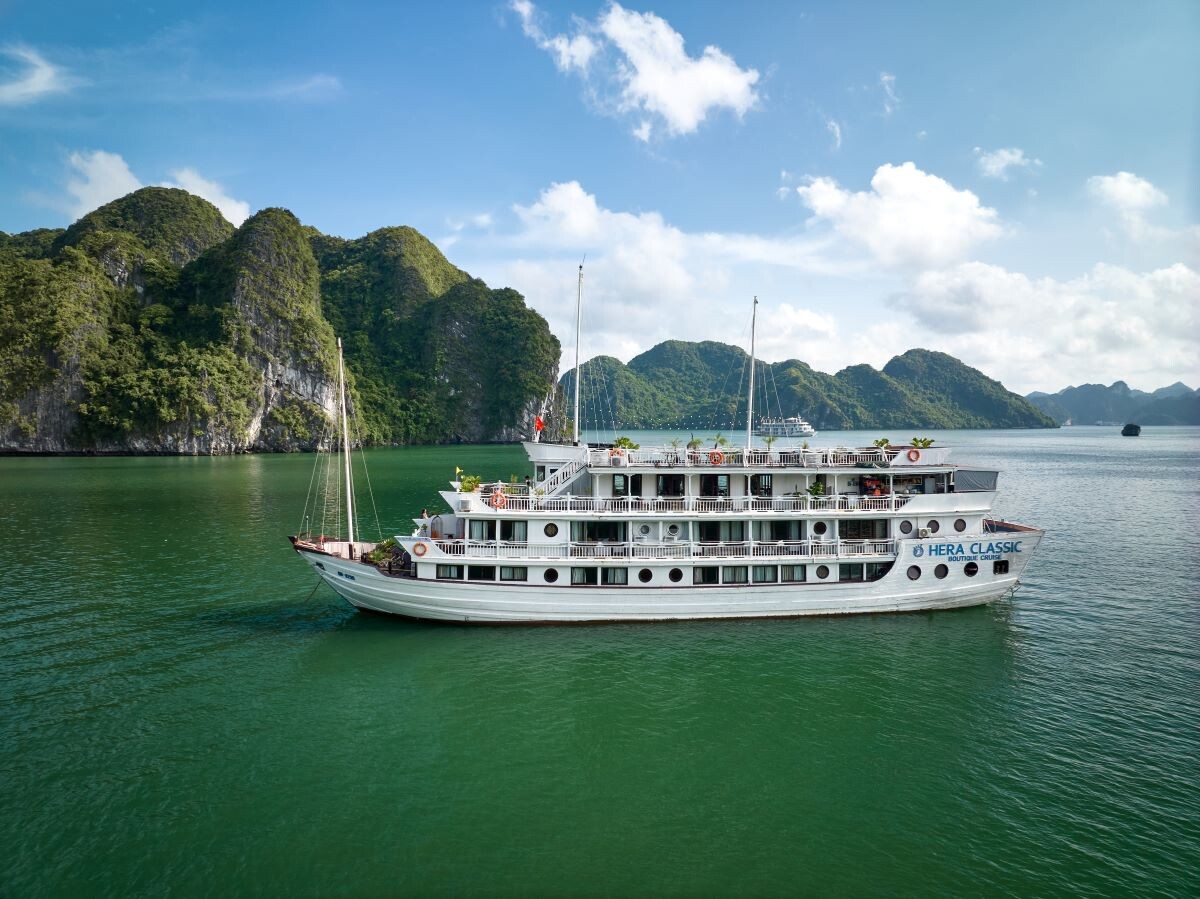 Launched in 2017, Hera Classic Boutique Cruise offers an intimate and elegant way to explore Halong Bay, perfectly suited to groups of up to 45 overnight guests. With 19 thoughtfully designed cabins ranging from 20 m² to 45 m², guests enjoy serene comfort in an elegant boutique setting. Each cabin is appointed with polished wood décor, spacious windows, and select suites featuring private terraces-all crafted for relaxation. Departing from Tuan Chau Marina, the cruise journey blends cultural touches, like traditional costume fashion shows, herbal foot baths, and floating rice cake cooking classes, with leisure activities such as sunset parties and Tai Chi on the sundeck. Meals are served in a large third-floor restaurant that frames Halong Bay views. Whether you're enjoying a Gala Dinner on deck or unwinding in your cozy cabin, Hera Classic Boutique Cruise delivers a boutique, culturally rich escape for those seeking both intimacy and discovery.