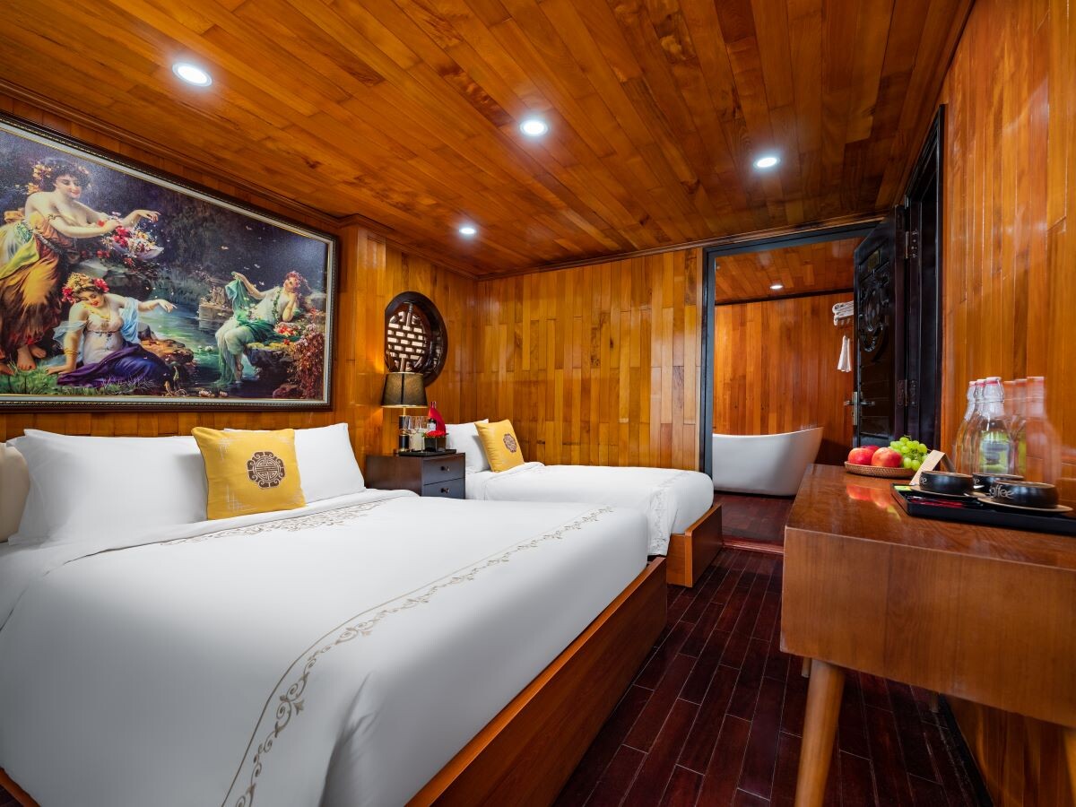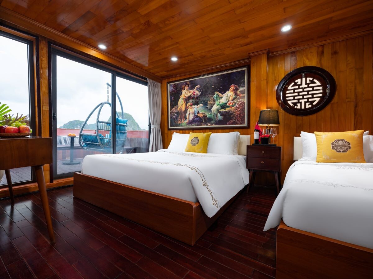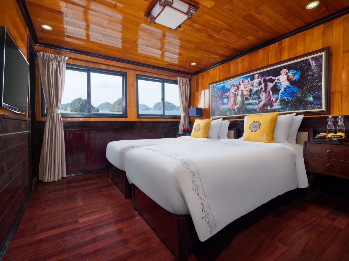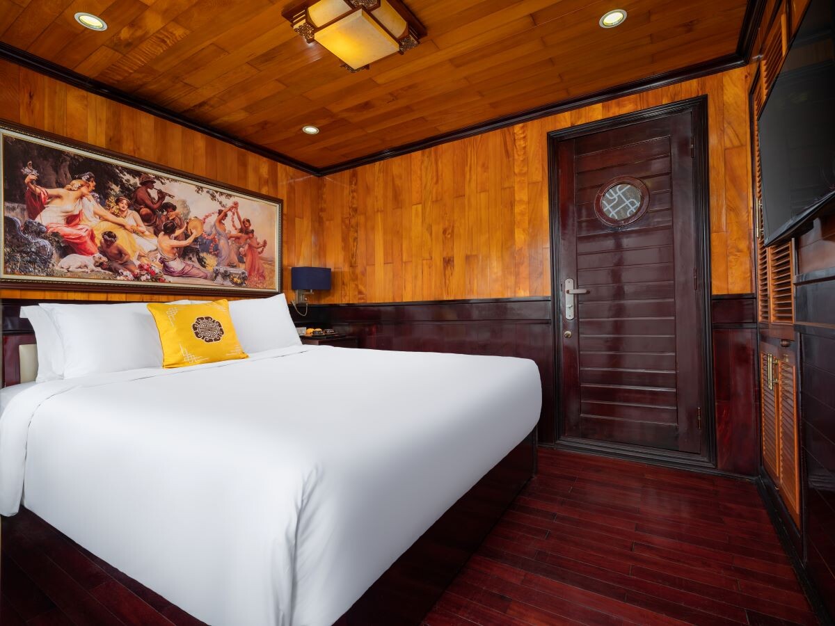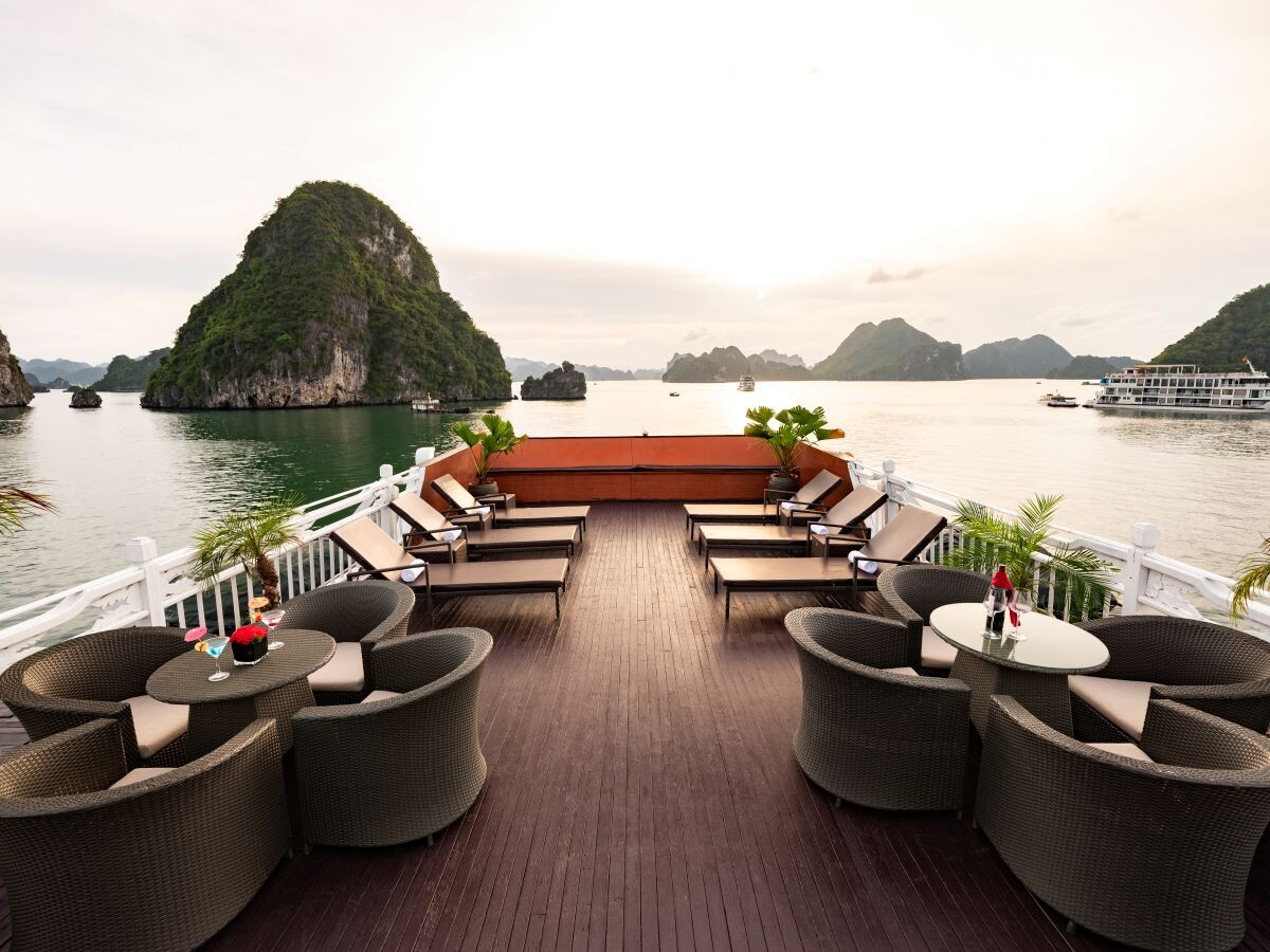 Launched in 2017, Hera Classic Boutique Cruise offers an intimate and elegant way to explore Halong Bay, perfectly suited to groups of up to 45 overnight guests. With 19 thoughtfully designed cabins ranging from 20 m² to 45 m², guests enjoy serene comfort in an elegant boutique setting. Each cabin is appointed with polished wood décor, spacious windows, and select suites featuring private terraces-all crafted for relaxation. Departing from Tuan Chau Marina, the cruise journey blends cultural touches, like traditional costume fashion shows, herbal foot baths, and floating rice cake cooking classes, with leisure activities such as sunset parties and Tai Chi on the sundeck. Meals are served in a large third-floor restaurant that frames Halong Bay views. Whether you're enjoying a Gala Dinner on deck or unwinding in your cozy cabin, Hera Classic Boutique Cruise delivers a boutique, culturally rich escape for those seeking both intimacy and discovery.