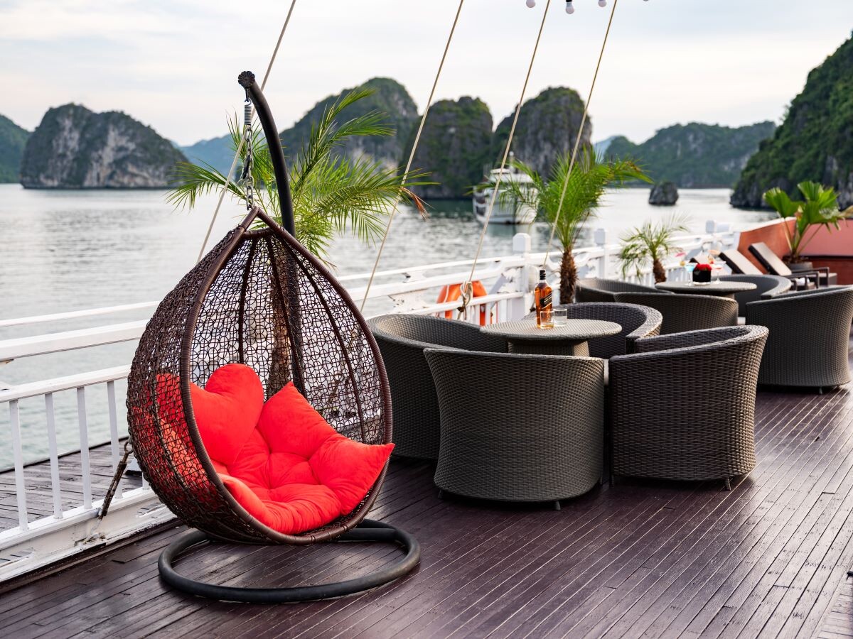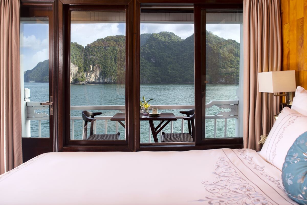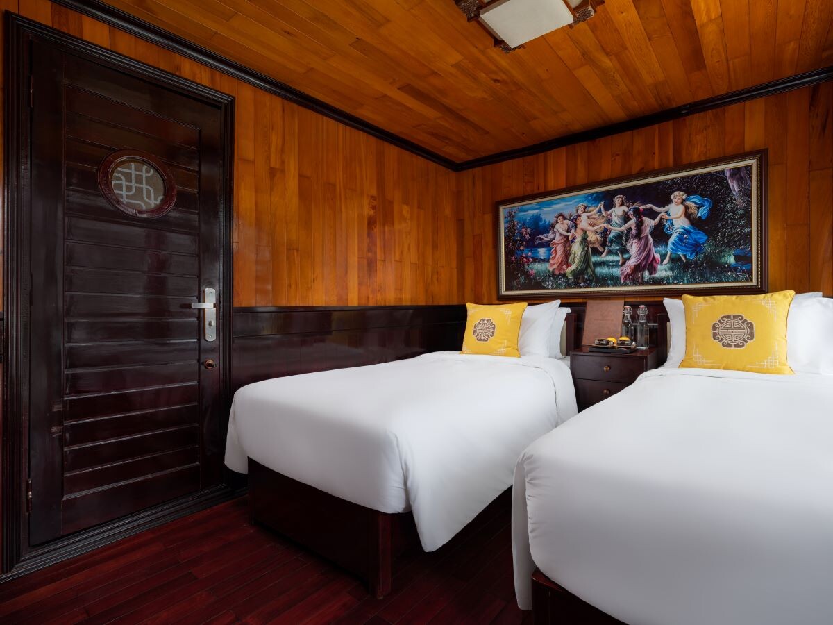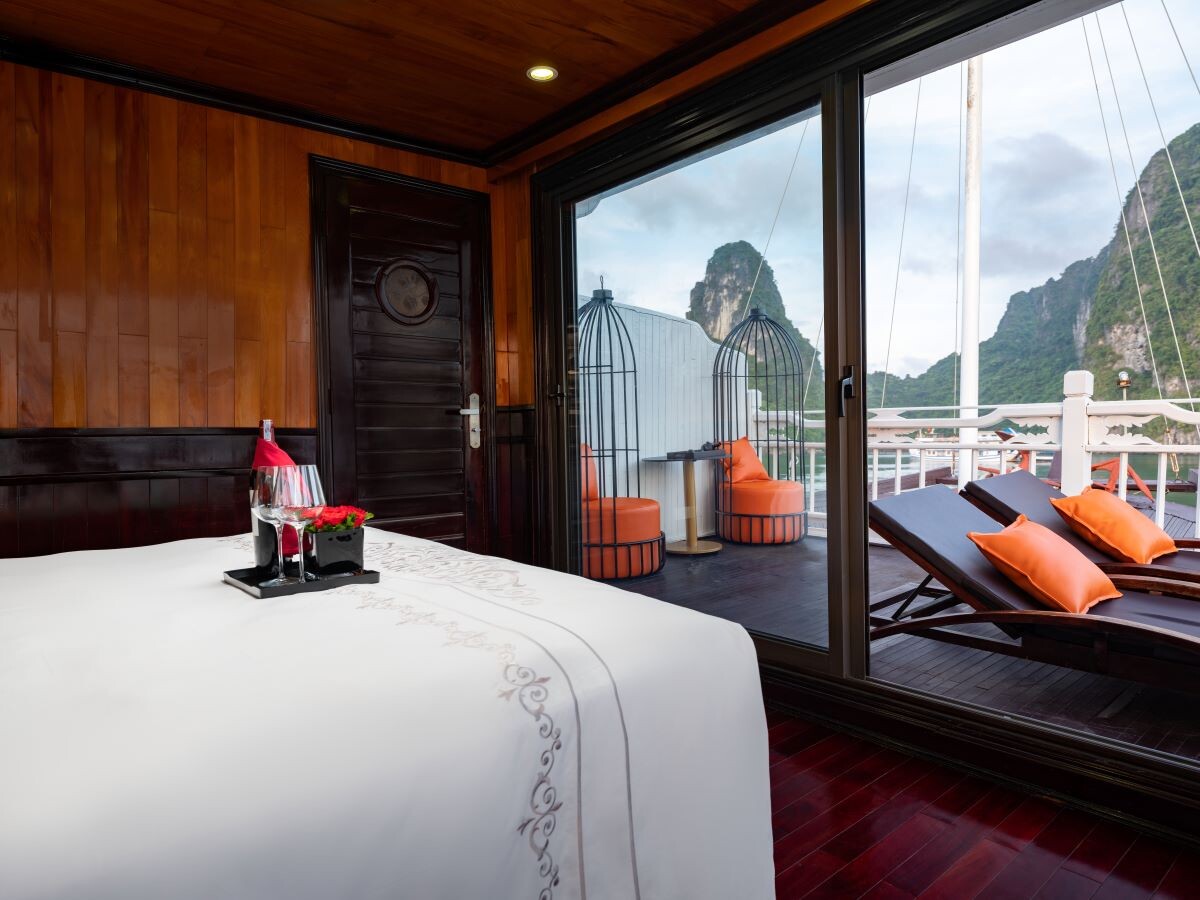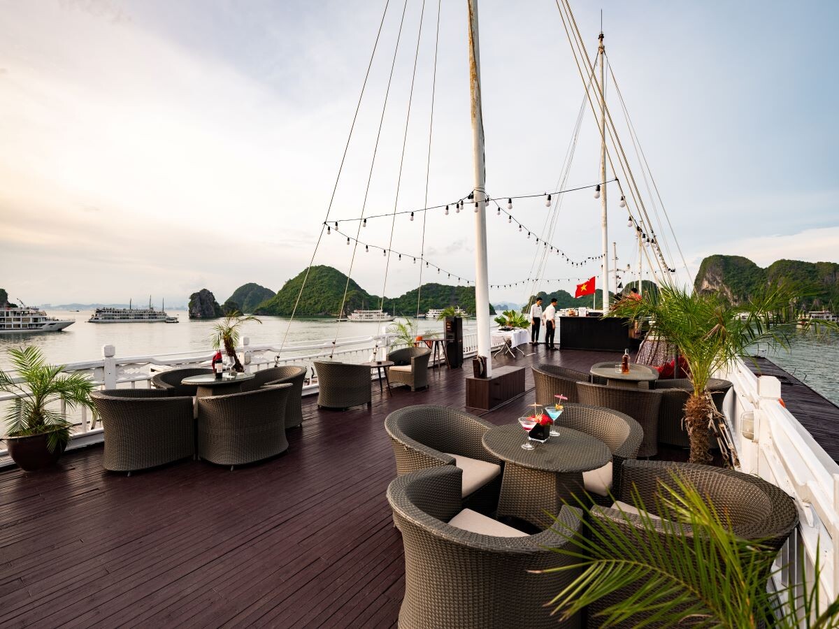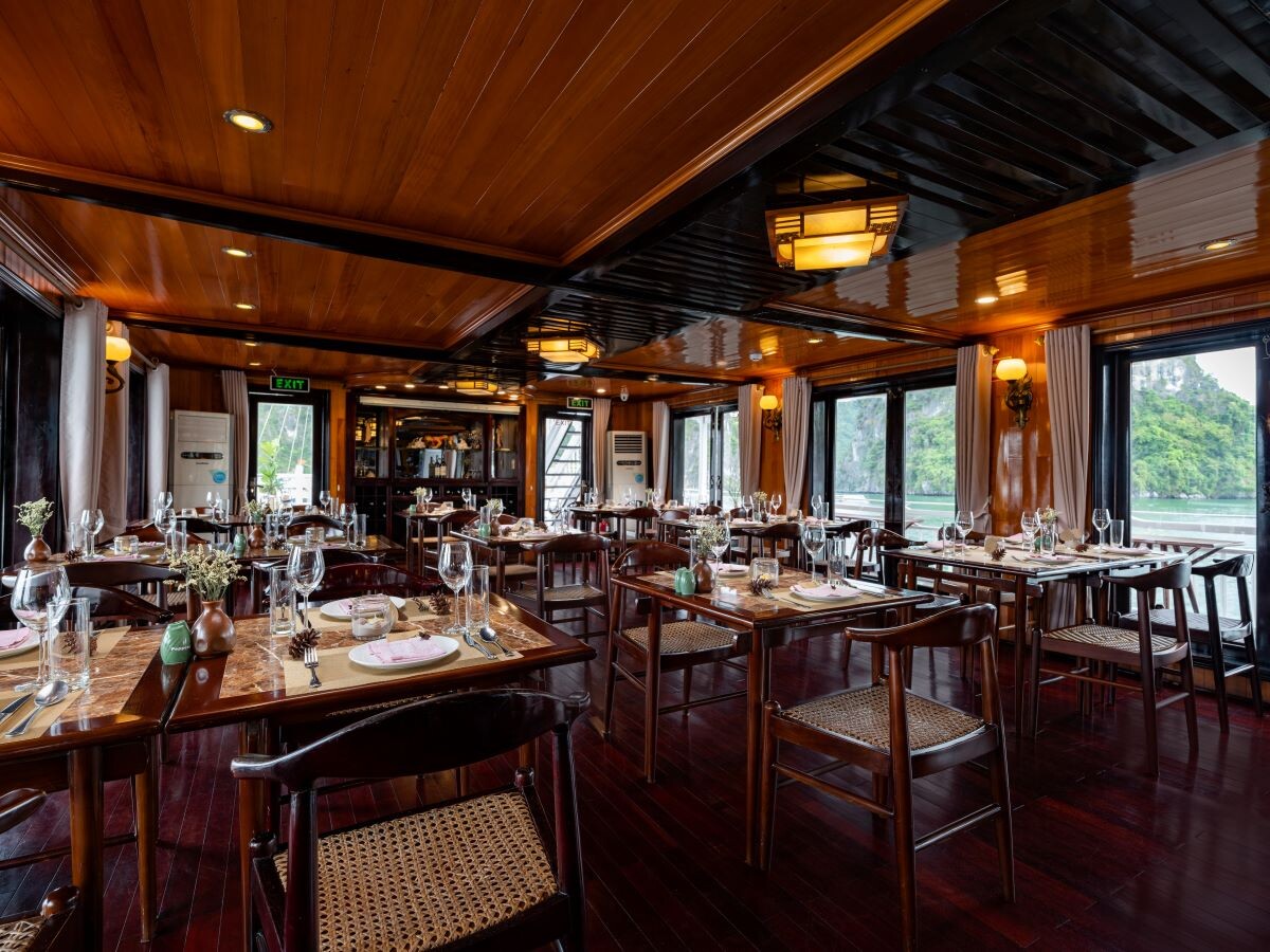 Launched in 2017, Hera Classic Boutique Cruise offers an intimate and elegant way to explore Halong Bay, perfectly suited to groups of up to 45 overnight guests. With 19 thoughtfully designed cabins ranging from 20 m² to 45 m², guests enjoy serene comfort in an elegant boutique setting. Each cabin is appointed with polished wood décor, spacious windows, and select suites featuring private terraces-all crafted for relaxation. Departing from Tuan Chau Marina, the cruise journey blends cultural touches, like traditional costume fashion shows, herbal foot baths, and floating rice cake cooking classes, with leisure activities such as sunset parties and Tai Chi on the sundeck. Meals are served in a large third-floor restaurant that frames Halong Bay views. Whether you're enjoying a Gala Dinner on deck or unwinding in your cozy cabin, Hera Classic Boutique Cruise delivers a boutique, culturally rich escape for those seeking both intimacy and discovery.