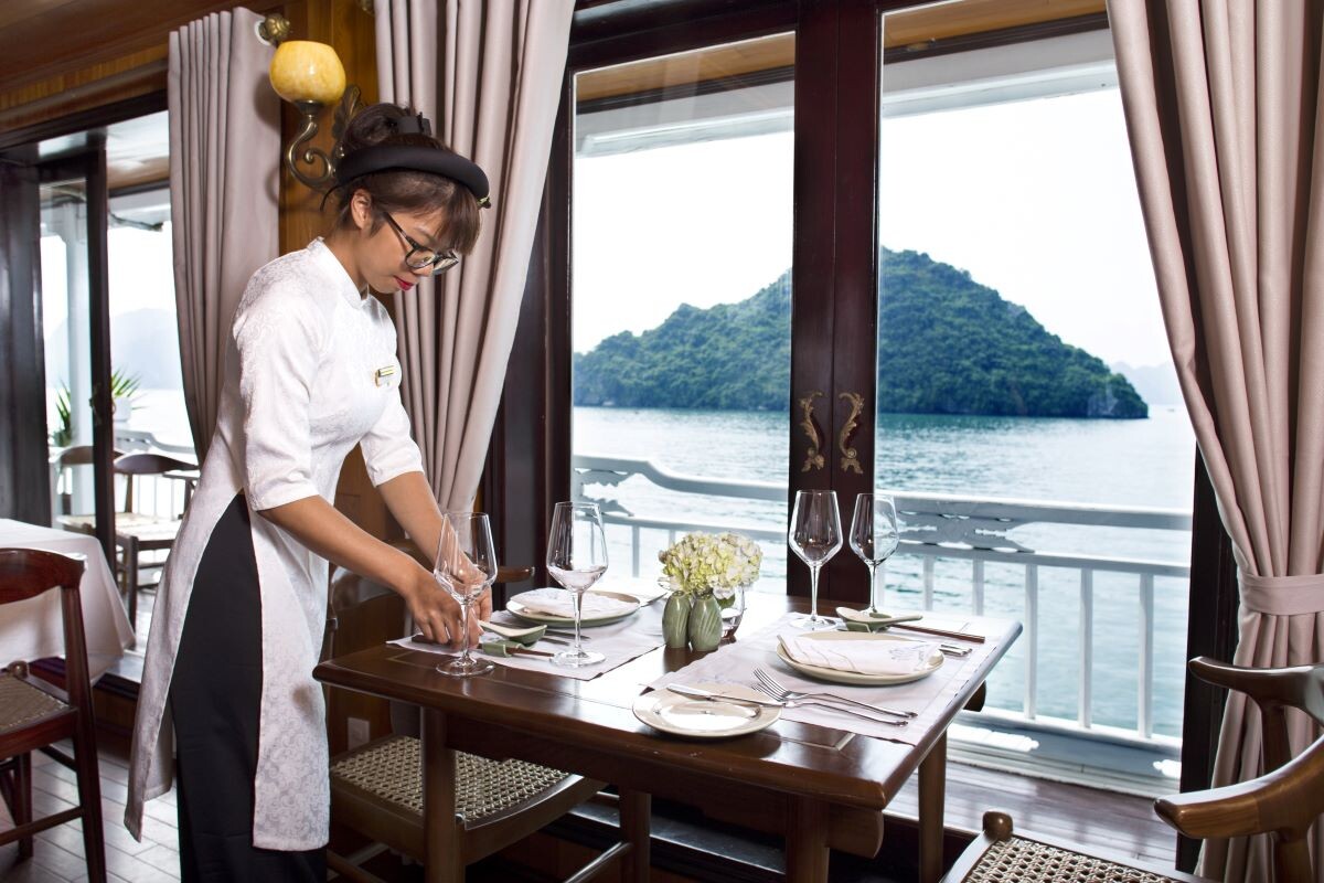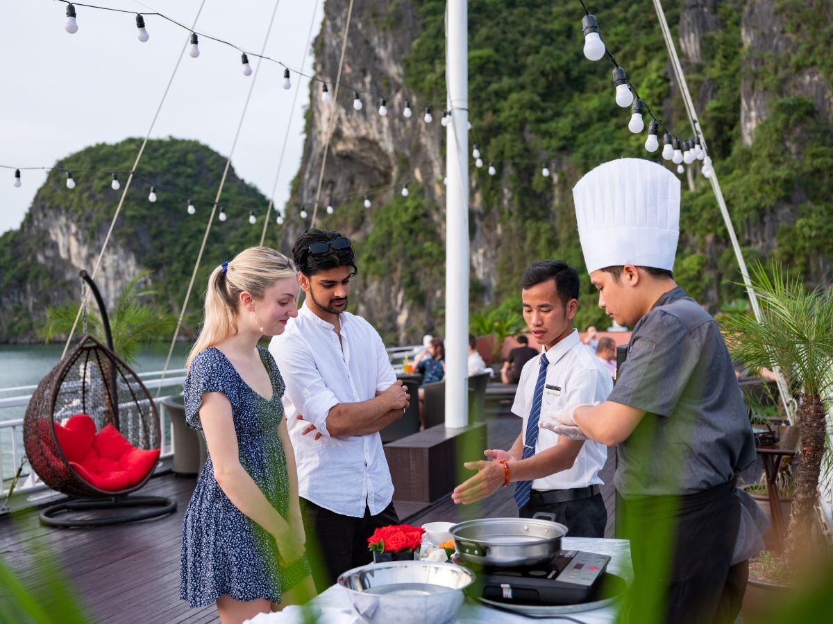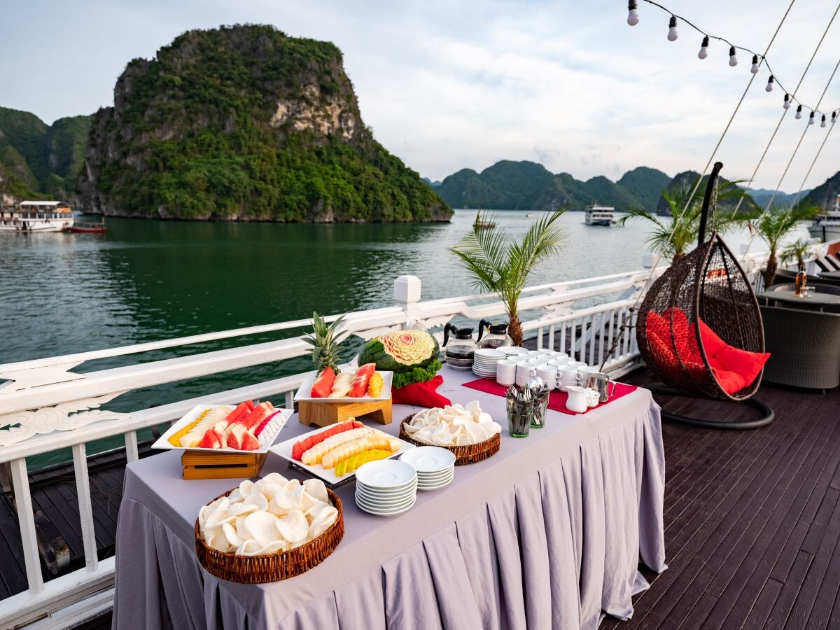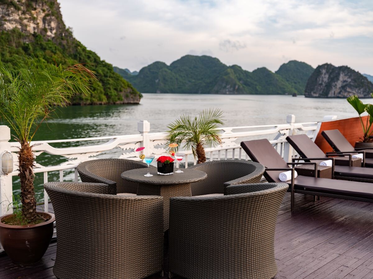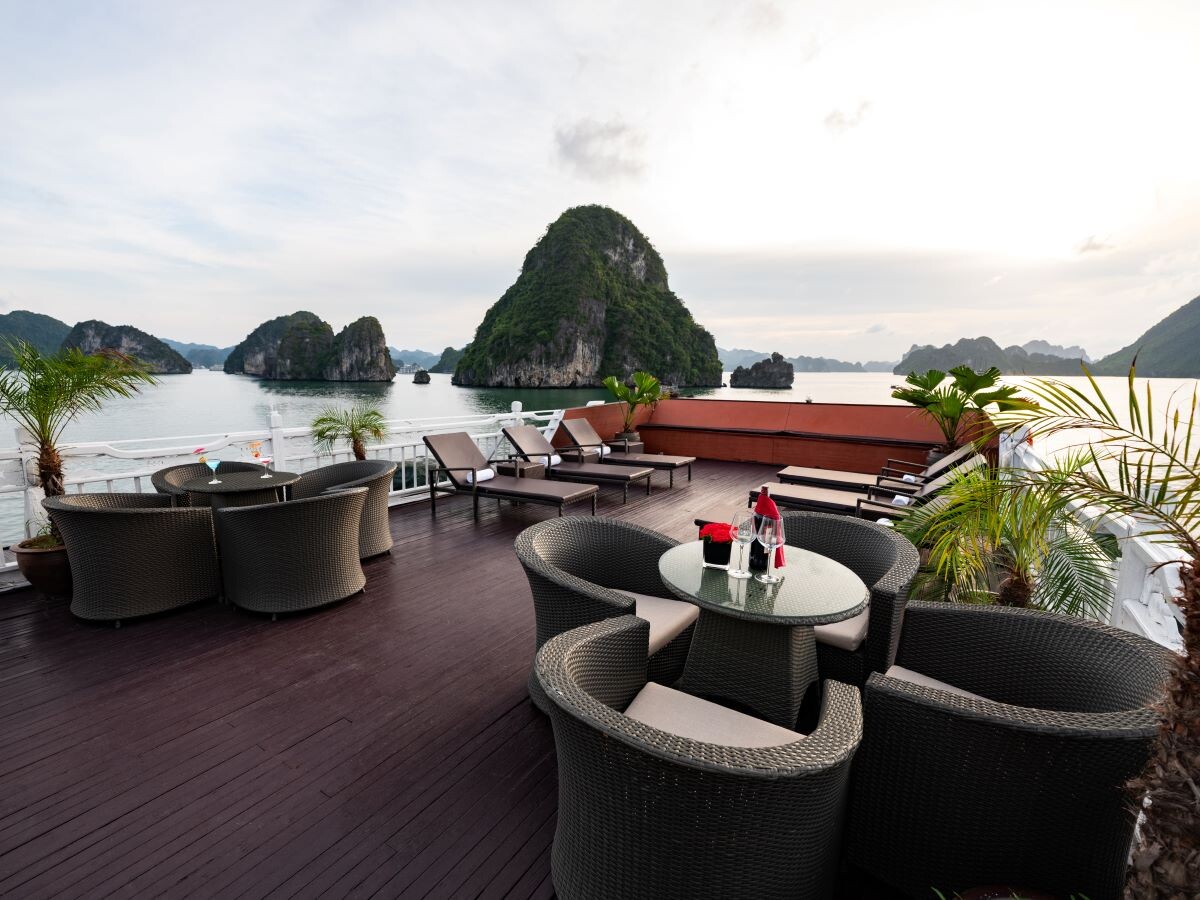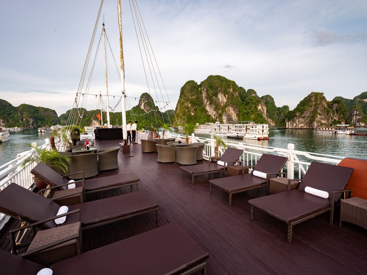 Launched in 2017, Hera Classic Boutique Cruise offers an intimate and elegant way to explore Halong Bay, perfectly suited to groups of up to 45 overnight guests. With 19 thoughtfully designed cabins ranging from 20 m² to 45 m², guests enjoy serene comfort in an elegant boutique setting. Each cabin is appointed with polished wood décor, spacious windows, and select suites featuring private terraces-all crafted for relaxation. Departing from Tuan Chau Marina, the cruise journey blends cultural touches, like traditional costume fashion shows, herbal foot baths, and floating rice cake cooking classes, with leisure activities such as sunset parties and Tai Chi on the sundeck. Meals are served in a large third-floor restaurant that frames Halong Bay views. Whether you're enjoying a Gala Dinner on deck or unwinding in your cozy cabin, Hera Classic Boutique Cruise delivers a boutique, culturally rich escape for those seeking both intimacy and discovery.