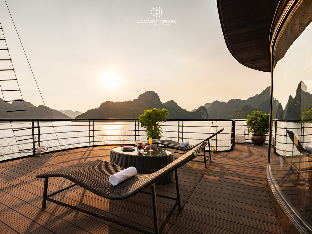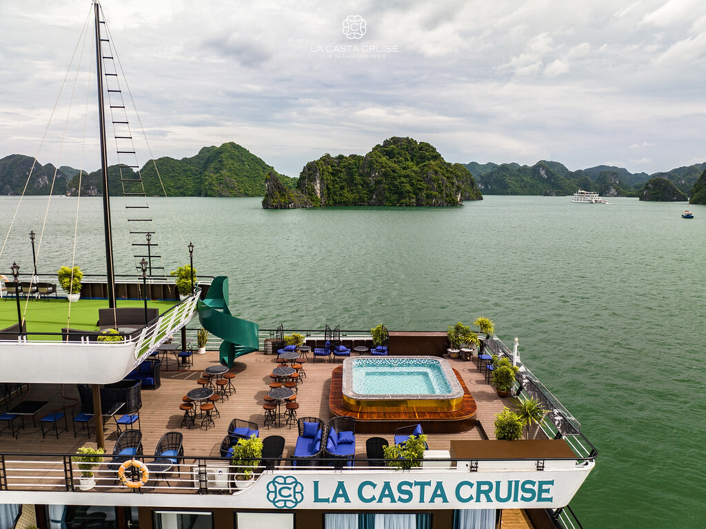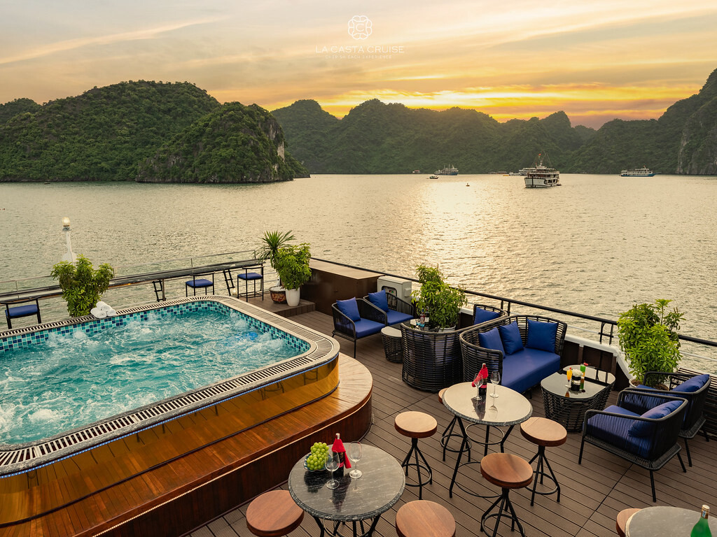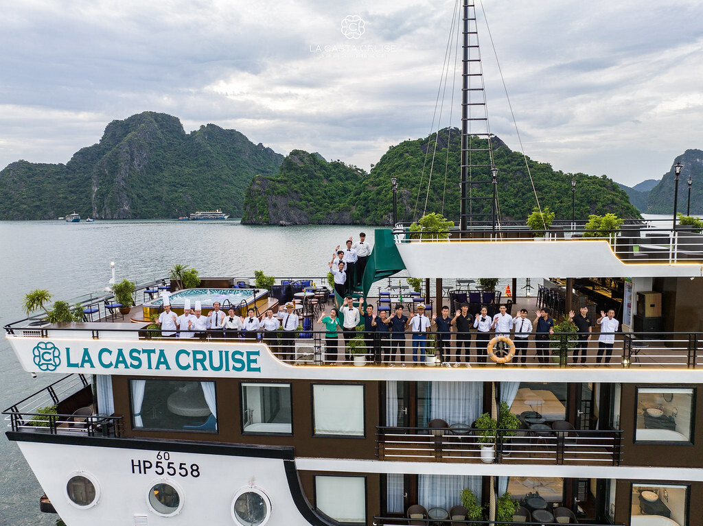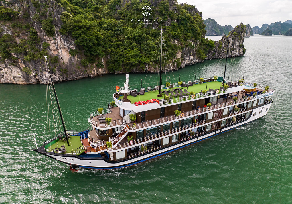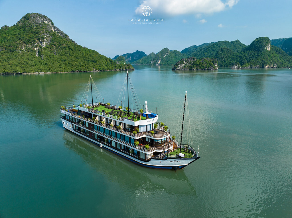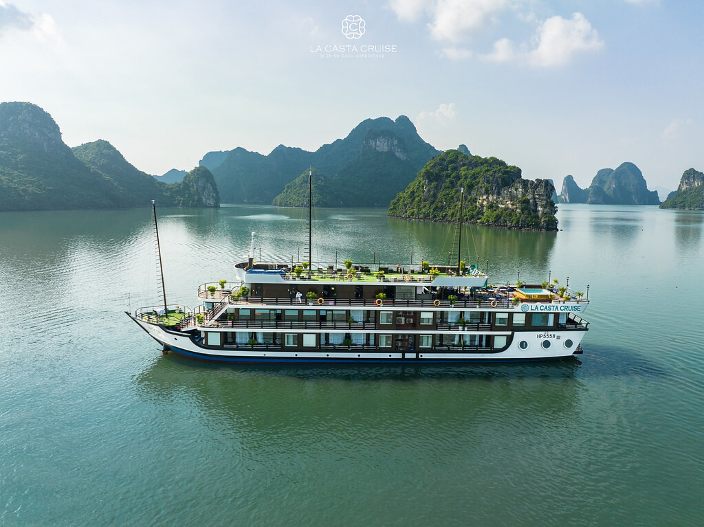 Launched in May 2020, the La Casta Cruise is a modern luxury vessel offering high-class overnight journeys through Lan Ha Bay. With 22 spacious suites ranging from 30m² to 70m², all featuring private balconies or terraces and sea-view bathtubs or jacuzzis, the ship ensures privacy and comfort for every guest. The maximum overnight capacity is 66 passengers, making it ideal for both couples and small groups seeking premium experiences without the crowds. Highlights include its elegant restaurant serving fine Vietnamese and international cuisine, a panoramic sundeck for sunset views, and an indulgent spa & massage service. With a blend of Italian-inspired luxury and Vietnamese hospitality, La Casta Cruise promises a stylish and memorable exploration of UNESCO-listed seascapes.