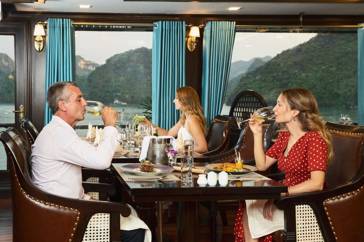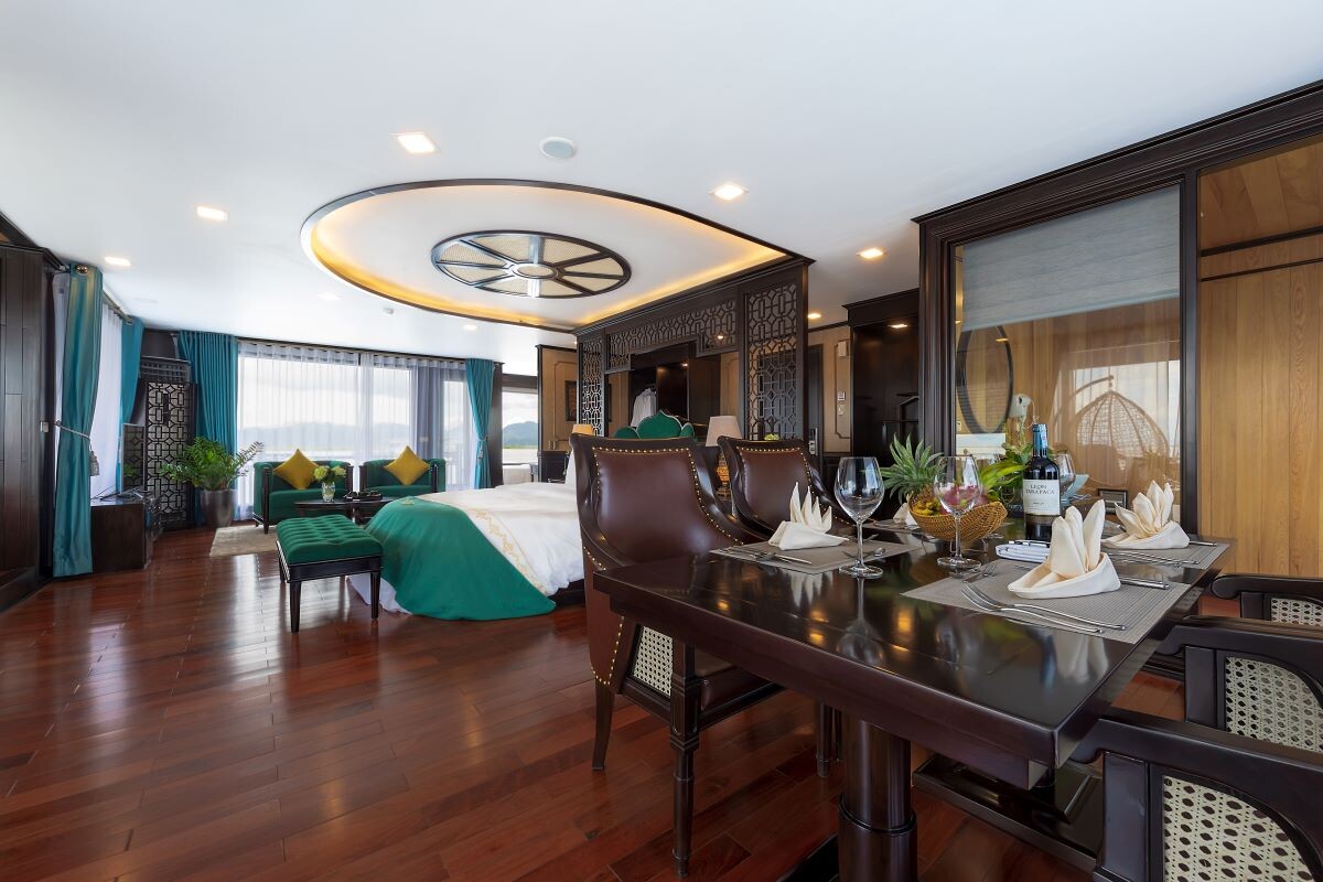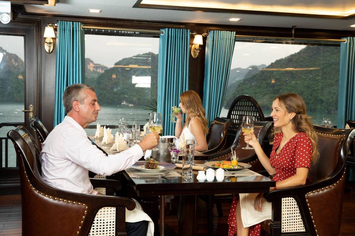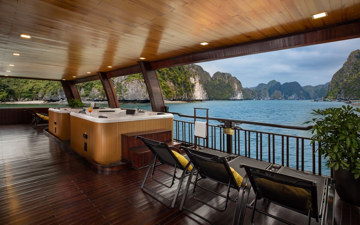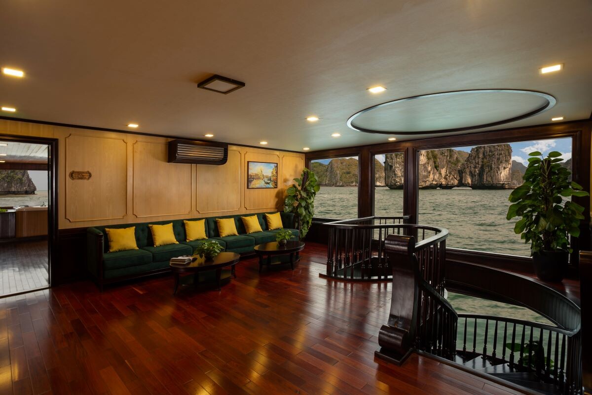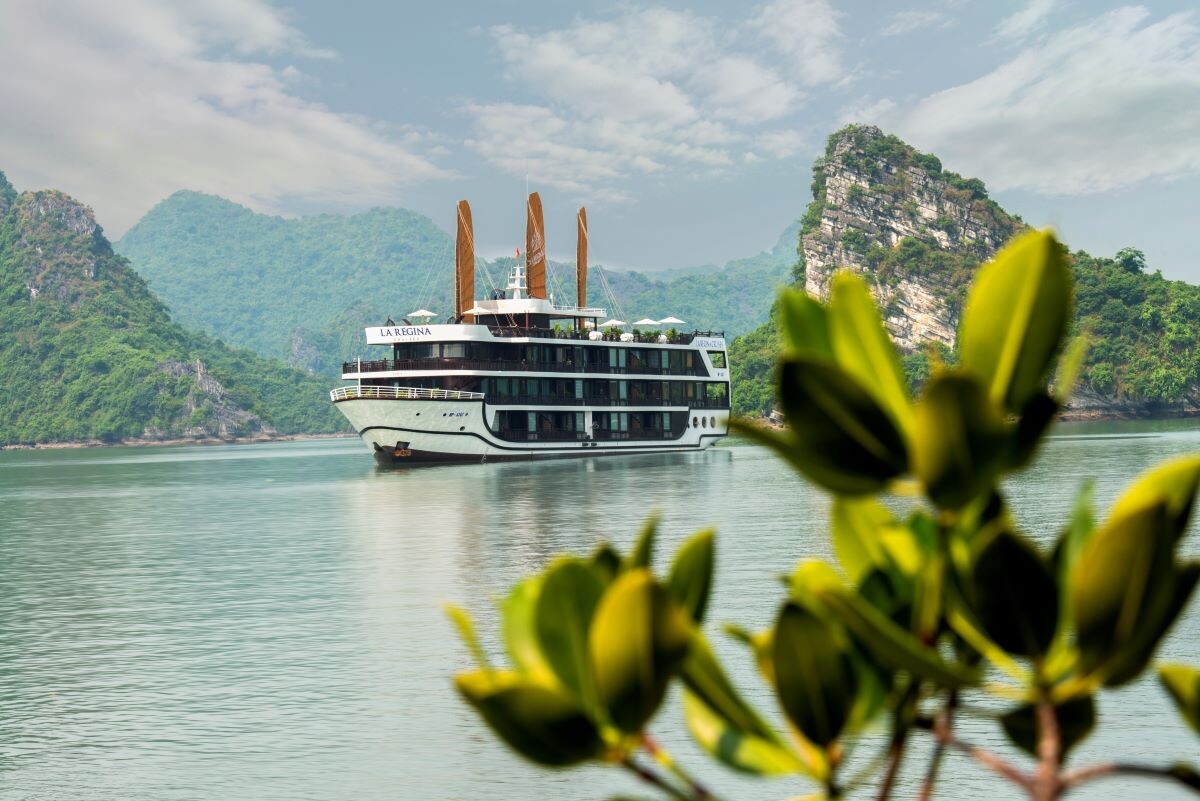 Launched in 2018, La Regina Legend Cruise, known as the “Queen of the Bays”, is one of the most stylish luxury cruises in Lan Ha Bay. With a length of over 62m and 27 lavish suites ranging from 45m² to 135m², the vessel is designed to blend the elegance of Indochine heritage with modern comforts, offering an upscale floating resort experience for up to 58 guests. All suites feature private balconies with full sea views, bathtubs, and deluxe amenities. The Queen Regent Suite (135m²) is among the largest and most luxurious cabins in Halong and Lan Ha Bay. Facilities include two restaurants, bars, spa & jacuzzi, conference rooms, sundeck, and butler service for the highest suite category. Departing from Tuan Chau Marina, La Regina Legend sails exclusive routes through Lan Ha Bay and Cat Ba Island, with highlights such as the Dark & Bright Cave, the cultural Viet Hai Village, the pristine Ba Trai Dao Beach, and the mysterious Trung Trang Cave. Guests enjoy kayaking, bamboo boat rides, cooking demonstrations, tai chi, tea ceremonies, and evening entertainment - perfectly balancing relaxation, culture, and adventure.