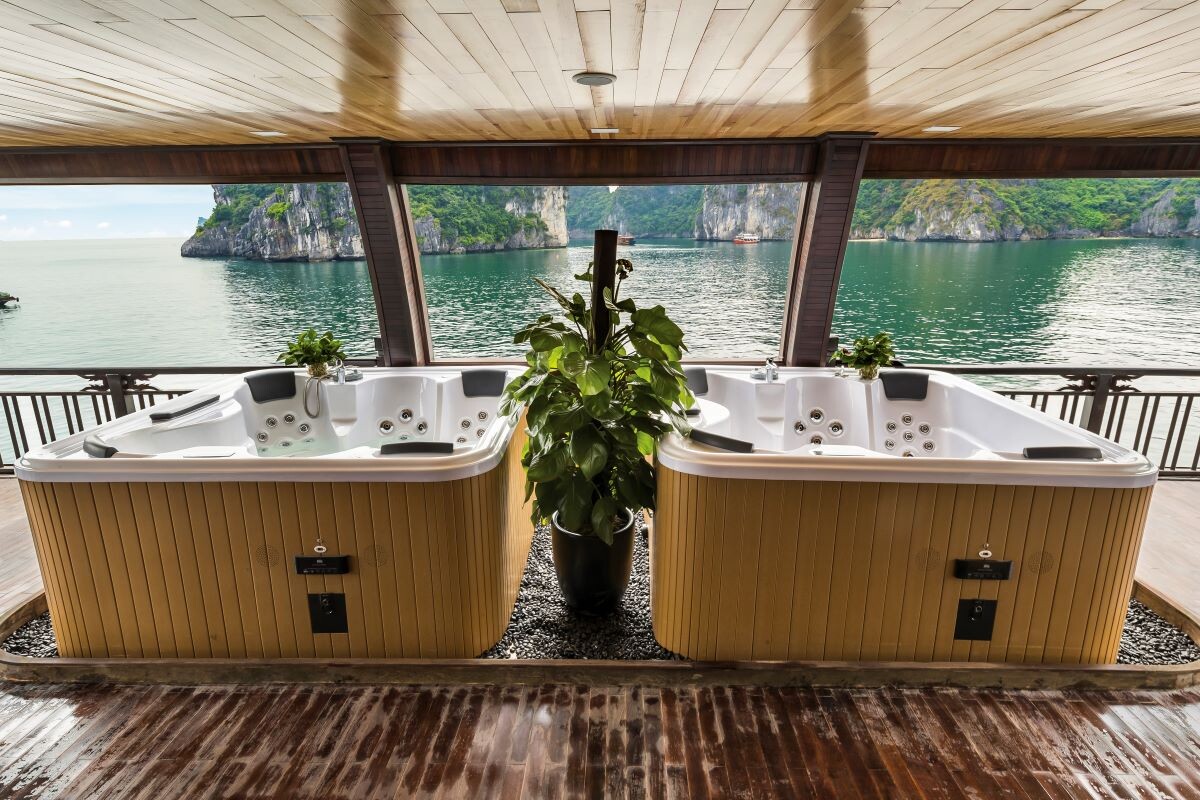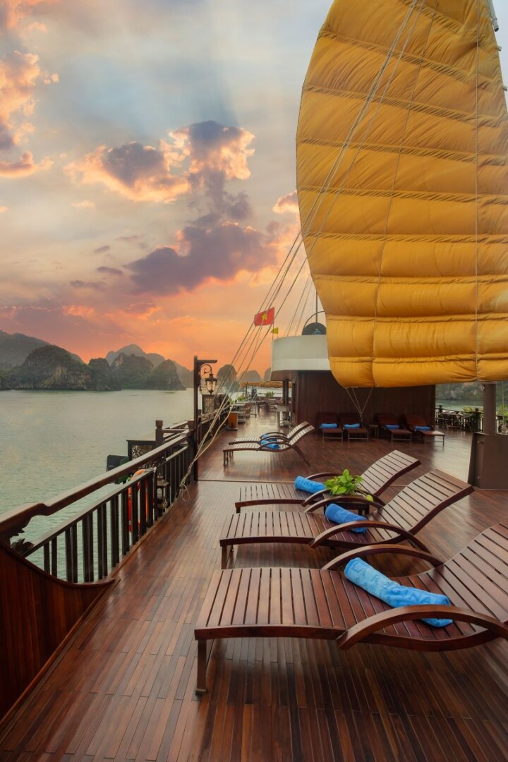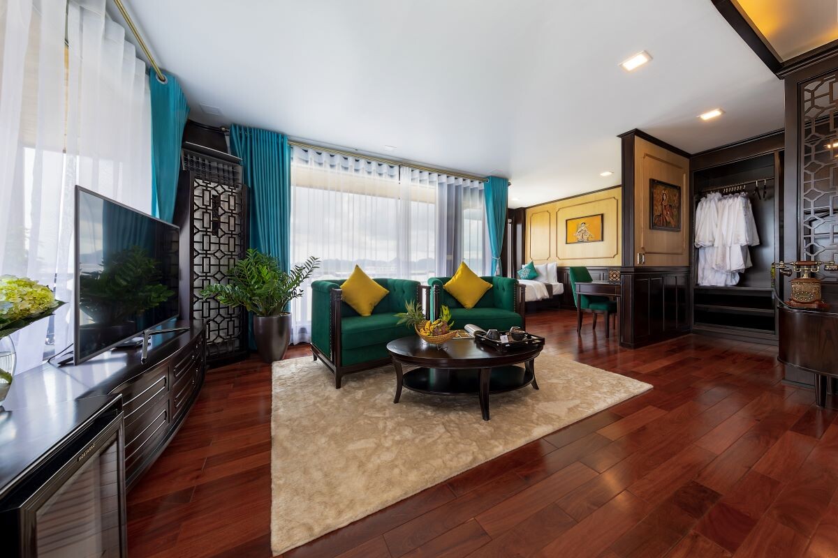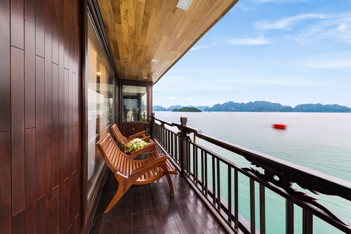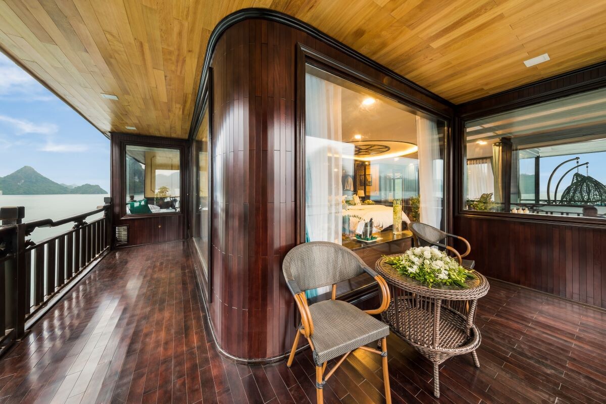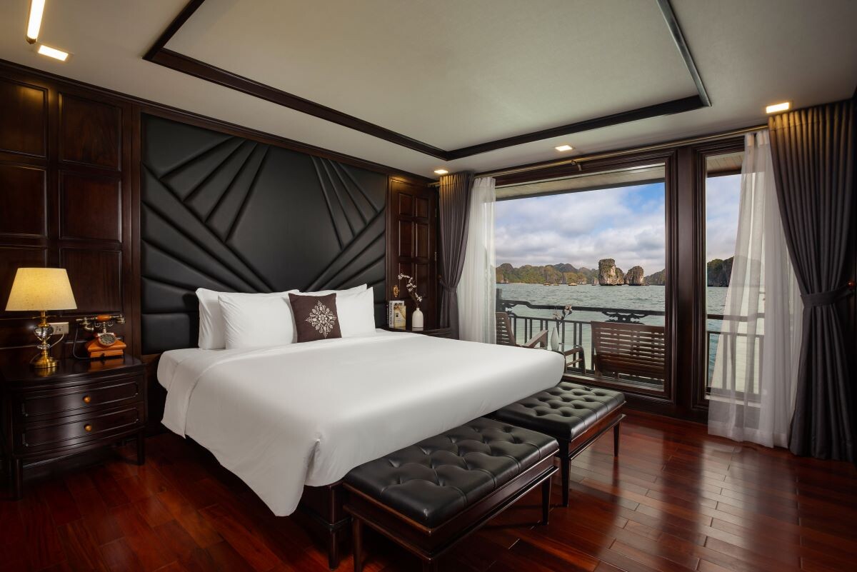 Launched in 2018, La Regina Legend Cruise, known as the “Queen of the Bays”, is one of the most stylish luxury cruises in Lan Ha Bay. With a length of over 62m and 27 lavish suites ranging from 45m² to 135m², the vessel is designed to blend the elegance of Indochine heritage with modern comforts, offering an upscale floating resort experience for up to 58 guests. All suites feature private balconies with full sea views, bathtubs, and deluxe amenities. The Queen Regent Suite (135m²) is among the largest and most luxurious cabins in Halong and Lan Ha Bay. Facilities include two restaurants, bars, spa & jacuzzi, conference rooms, sundeck, and butler service for the highest suite category. Departing from Tuan Chau Marina, La Regina Legend sails exclusive routes through Lan Ha Bay and Cat Ba Island, with highlights such as the Dark & Bright Cave, the cultural Viet Hai Village, the pristine Ba Trai Dao Beach, and the mysterious Trung Trang Cave. Guests enjoy kayaking, bamboo boat rides, cooking demonstrations, tai chi, tea ceremonies, and evening entertainment - perfectly balancing relaxation, culture, and adventure.