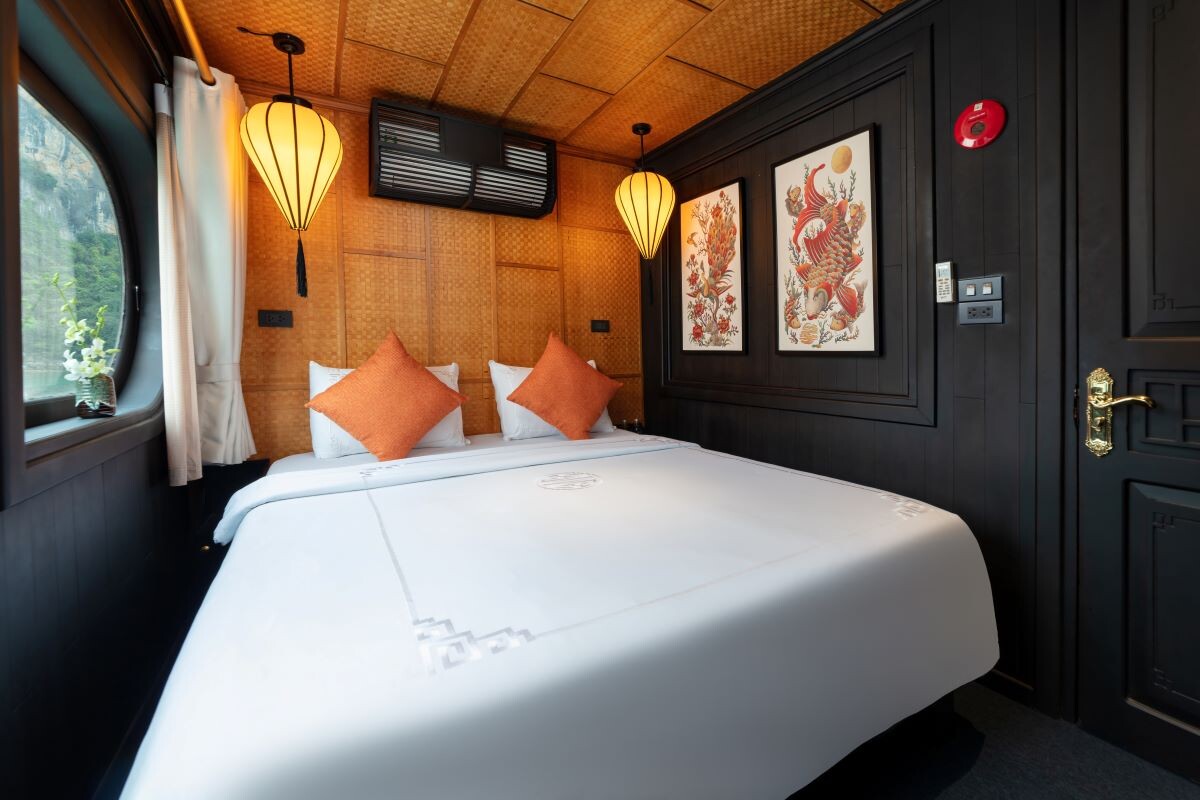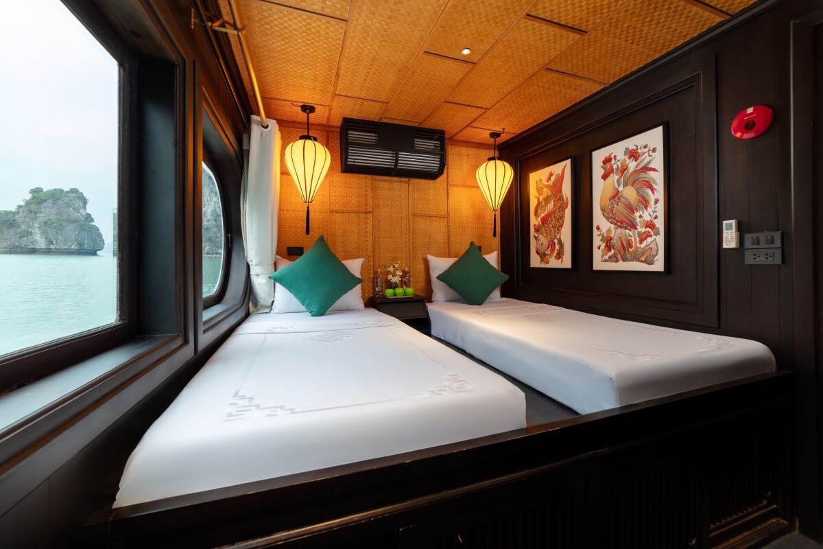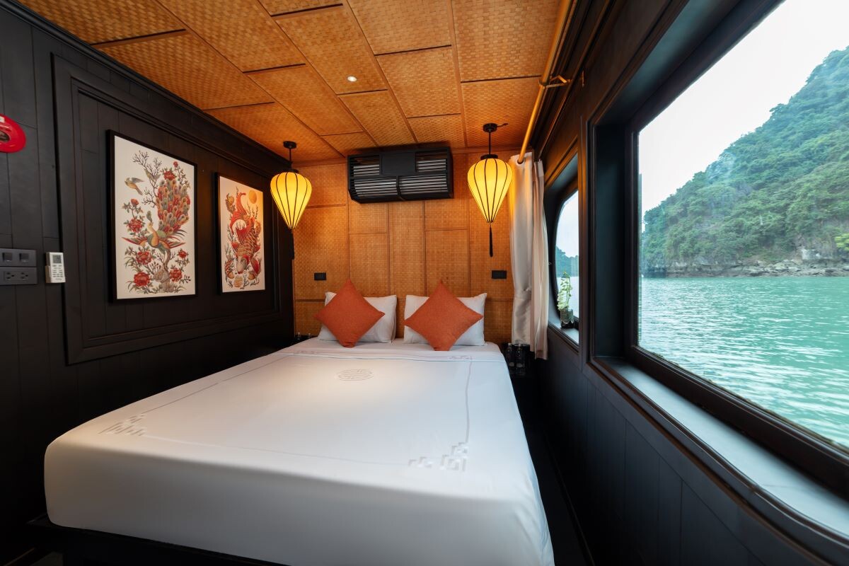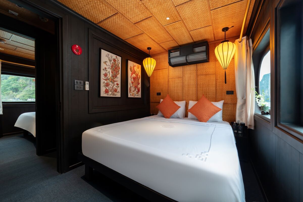 Launched in 2009 and operated by the reputable Indochina Junks, the Prince Junk is a traditional wooden junk designed with oriental details of wood, stone, and bronze. With only 4 deluxe cabins (10m² each), accommodating a maximum of 8 overnight guests, it offers an intimate and personalized experience for couples, families, and small groups. A cozy bar and dining room (15m²) at the front of the boat welcomes up to 10 guests, creating a warm, friendly atmosphere for shared meals and relaxation. Unlike the crowded routes of Halong Bay or Lan Ha Bay, Prince Junk sails through the untouched and tranquil waters of Bai Tu Long Bay. Guests explore iconic and less-visited attractions such as Thien Canh Son Cave, Vung Vieng Fishing Village, Cap La area, Hon Co Island, and Cong Dam area, with highlights including a beach BBQ and a traditional water puppet show in Yen Duc Village. Prince Junk is the perfect choice for travelers seeking an authentic, boutique journey, where traditional junk charm meets off-the-beaten-path natural beauty and cultural immersion.