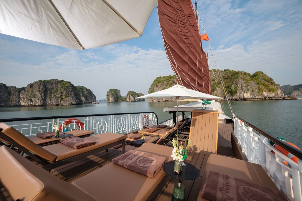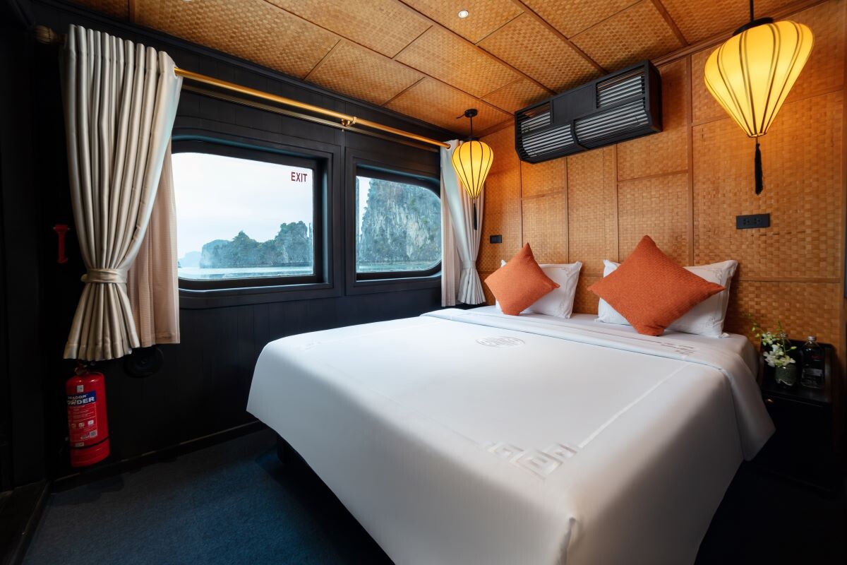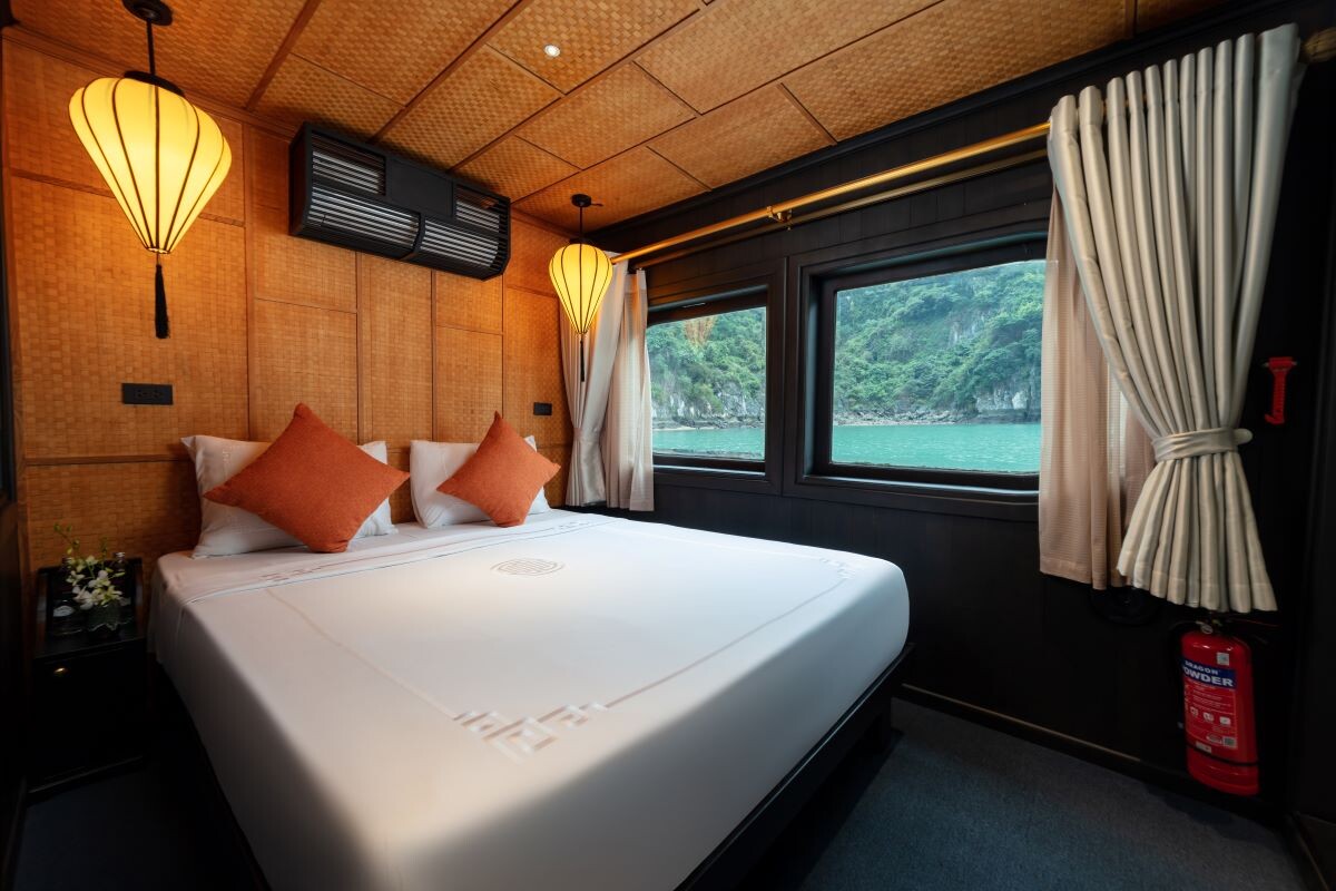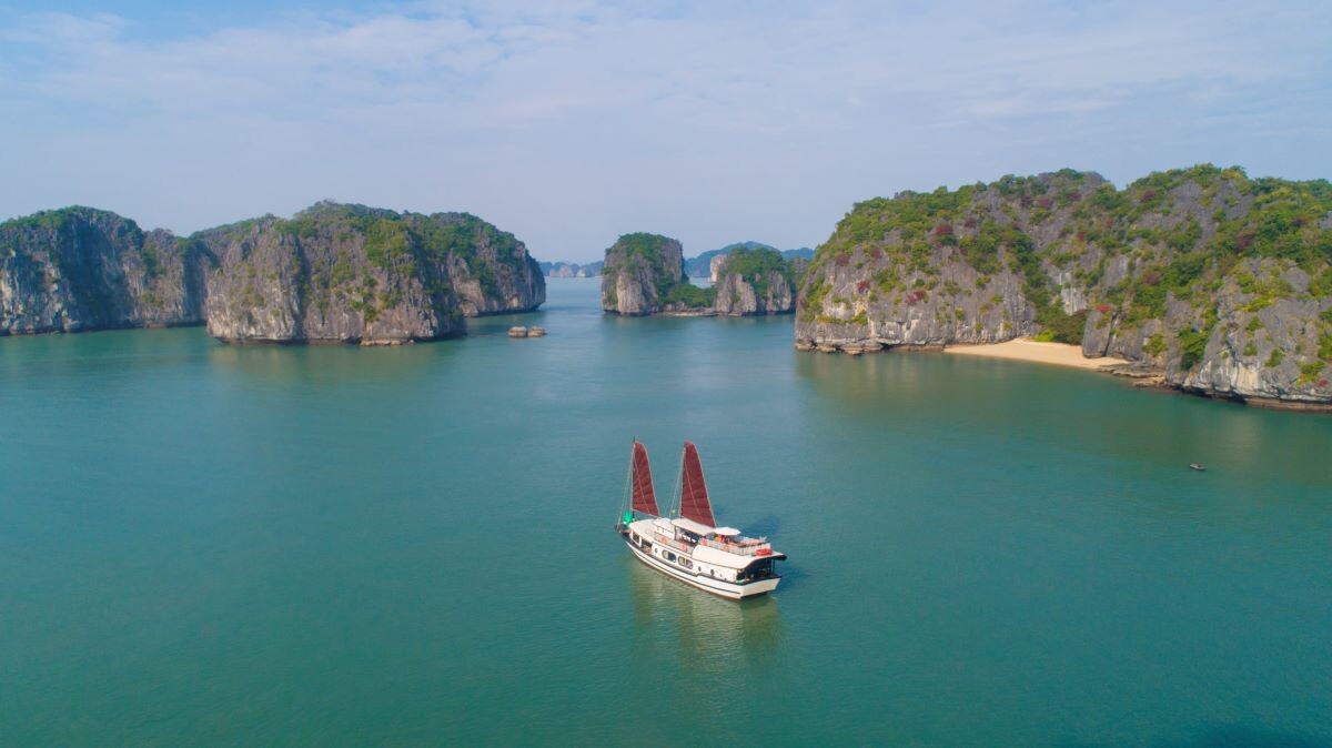 Launched in 2009 and operated by the reputable Indochina Junks, the Prince Junk is a traditional wooden junk designed with oriental details of wood, stone, and bronze. With only 4 deluxe cabins (10m² each), accommodating a maximum of 8 overnight guests, it offers an intimate and personalized experience for couples, families, and small groups. A cozy bar and dining room (15m²) at the front of the boat welcomes up to 10 guests, creating a warm, friendly atmosphere for shared meals and relaxation. Unlike the crowded routes of Halong Bay or Lan Ha Bay, Prince Junk sails through the untouched and tranquil waters of Bai Tu Long Bay. Guests explore iconic and less-visited attractions such as Thien Canh Son Cave, Vung Vieng Fishing Village, Cap La area, Hon Co Island, and Cong Dam area, with highlights including a beach BBQ and a traditional water puppet show in Yen Duc Village. Prince Junk is the perfect choice for travelers seeking an authentic, boutique journey, where traditional junk charm meets off-the-beaten-path natural beauty and cultural immersion.