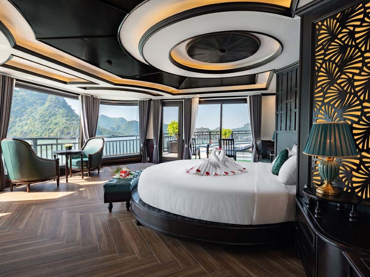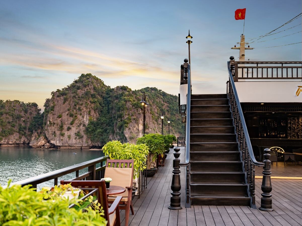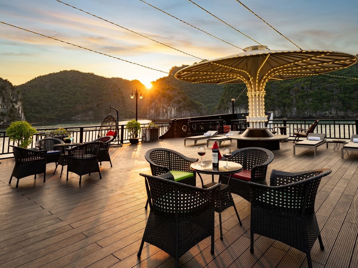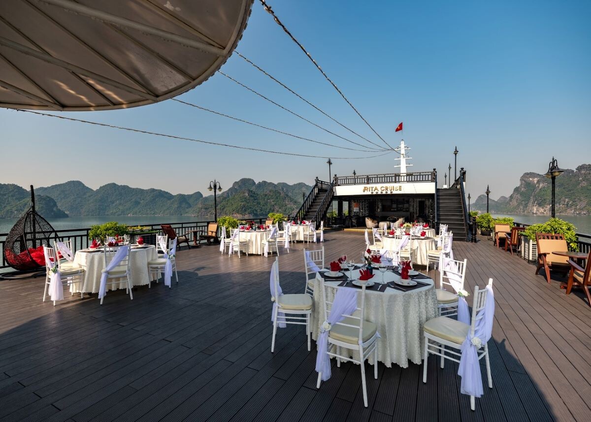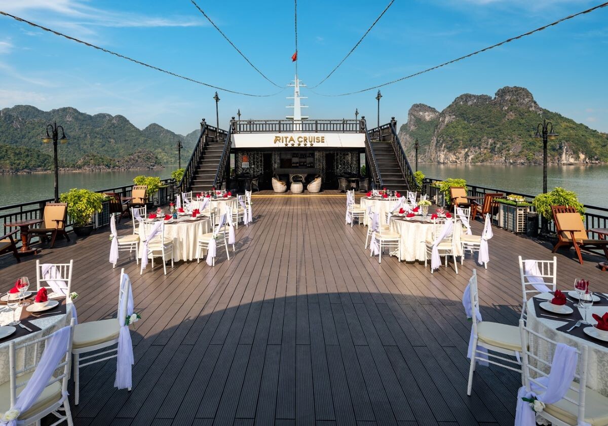 Launched in 2023, Rita Cruise is a modern steel vessel combining Indochine-inspired architecture with five-star luxury comforts. With 32 cabins and suites ranging from 28m² to 65m², each featuring private balconies, floor-to-ceiling windows, and contemporary amenities, the cruise ensures both style and relaxation. Facilities include a fine-dining restaurant, panoramic sundeck, outdoor jacuzzi pool, fitness center, spa, and lounge bar. Departing from Tuan Chau Marina, Rita Cruise sails through Lan Ha Bay and the quieter corners of Halong Bay, showcasing highlights such as Dark & Bright Cave, Viet Hai Village, Ba Trai Dao Beach, and Trung Trang Cave. With a blend of immersive activities and upscale service, it is ideal for travelers seeking cultural discovery alongside modern indulgence.