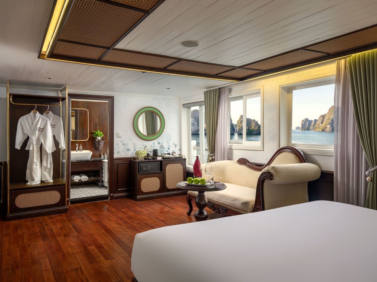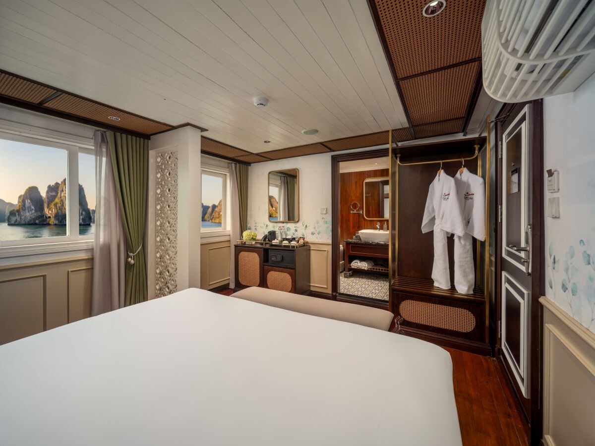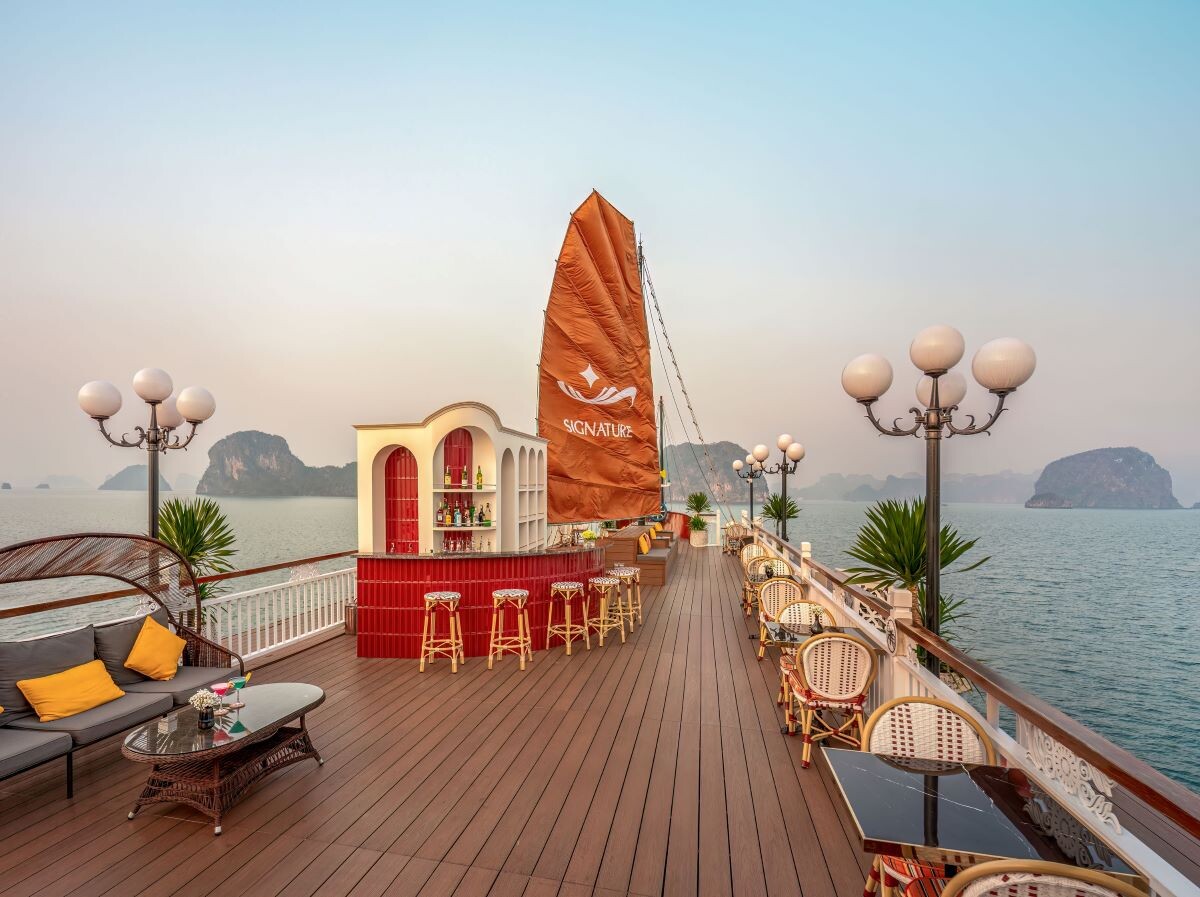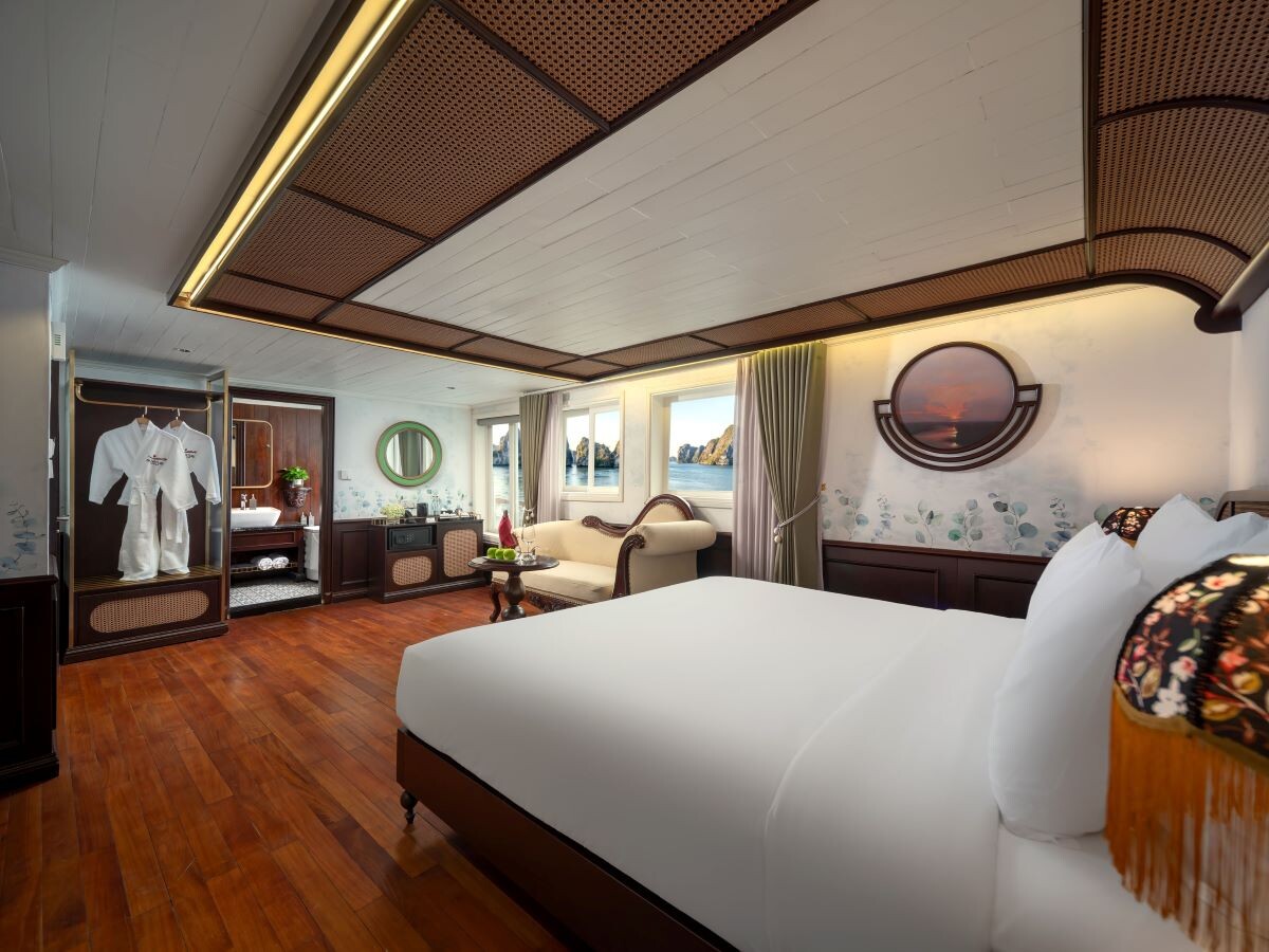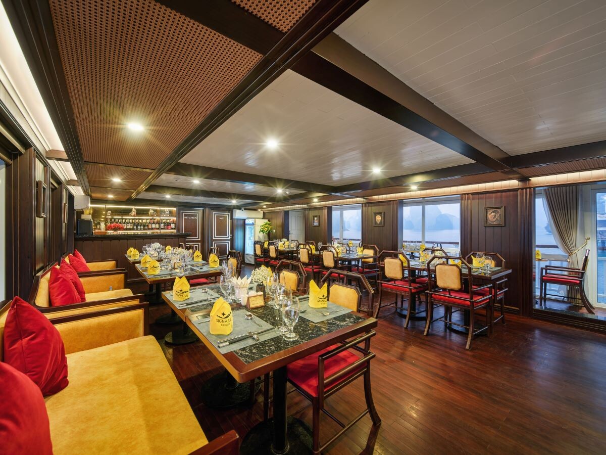 Launched in 2014, the Signature Royal Cruise is a distinguished member of the Athena Group, renowned for its professional service and luxurious voyages through the pristine Bai Tu Long Bay. Departing from Halong Cruise Port, this elegant cruise blends modern steel construction with classic Vietnamese wooden junk-inspired design, ensuring both safety and authentic charm. With only 15 spacious cabins designed for a maximum of 38 passengers, Signature Royal offers an intimate and personalized experience on the bay. Cabins range from 28 m² to 82 m², each featuring a private balcony, en-suite bathroom, and large windows framing sweeping sea views. Sailing the less-traveled route of Bai Tu Long Bay, guests explore some of Halong’s most serene and untouched destinations, including the Vung Vieng Floating Village, Cong Do Area, and the magnificent Thien Canh Son Cave. This unique itinerary allows travelers to enjoy both cultural encounters and natural beauty, away from the busy tourist routes. With its impeccable service, refined cuisine, and tranquil cruising pace, Signature Royal Cruise promises a sophisticated yet intimate journey into one of Vietnam’s most captivating UNESCO World Heritage sites.