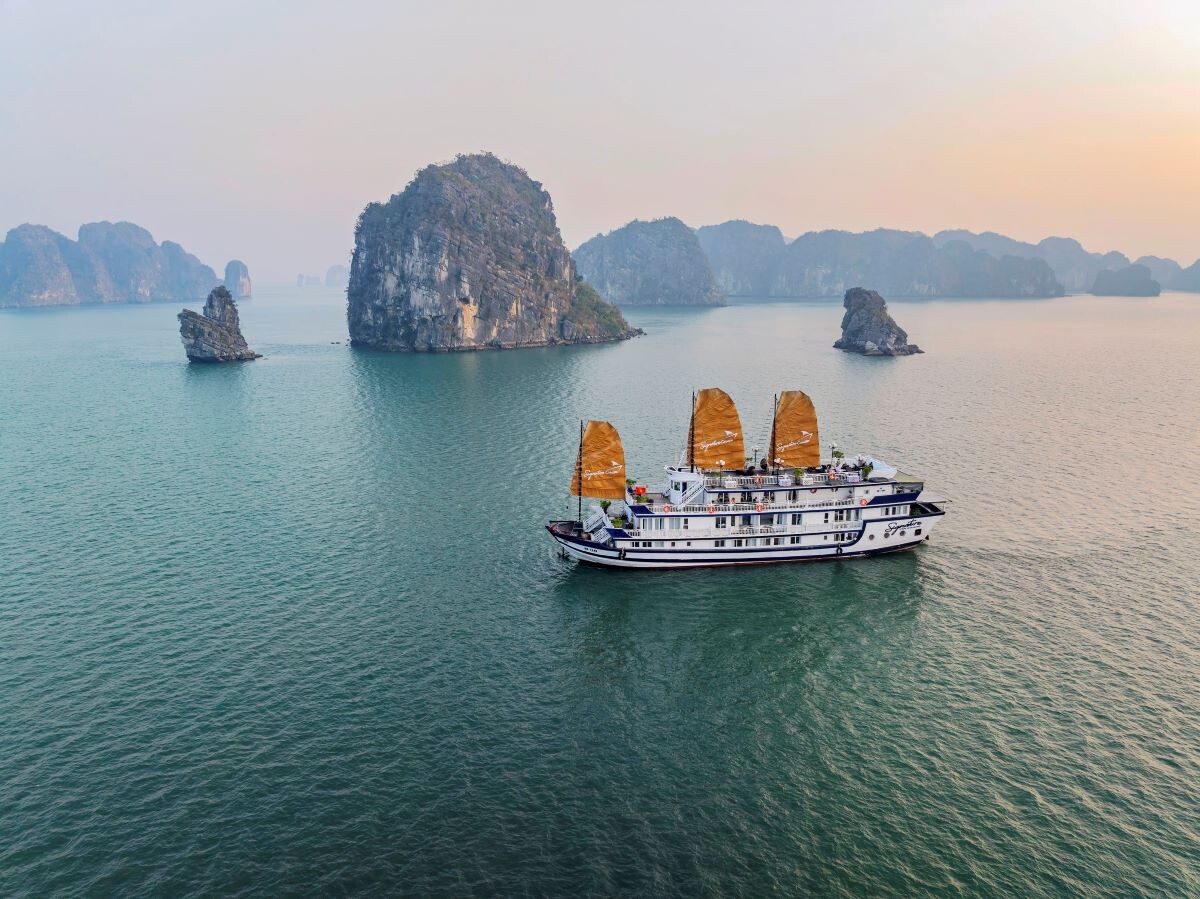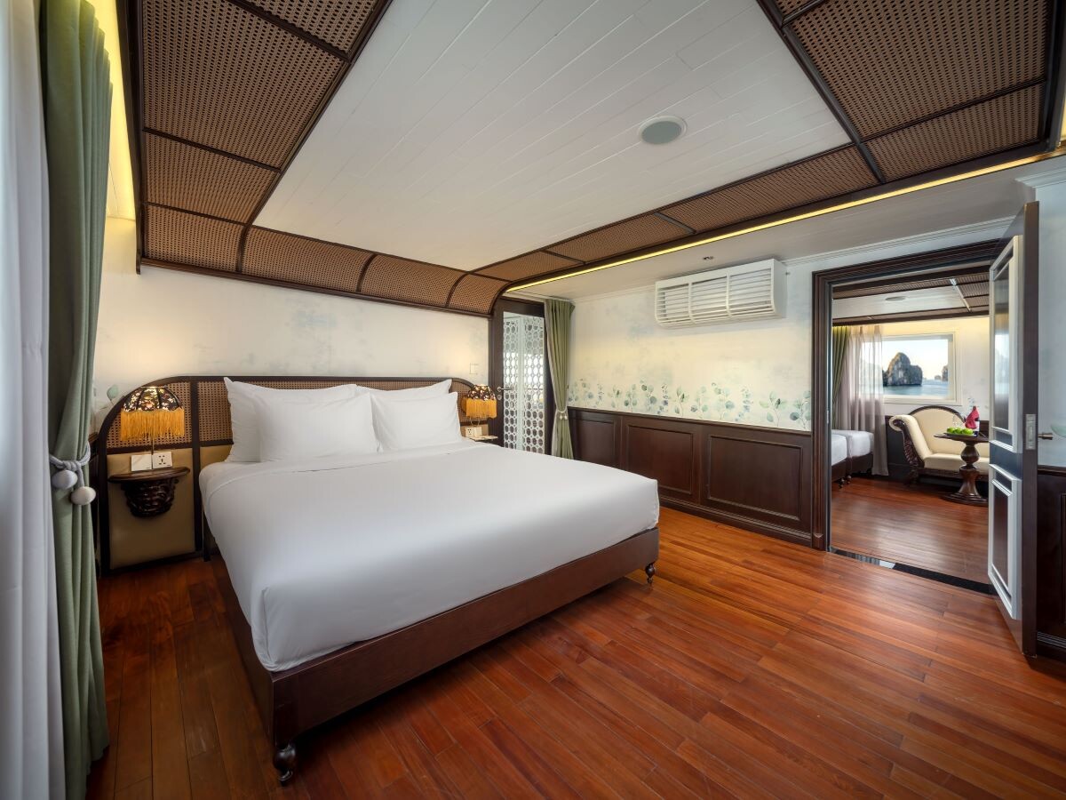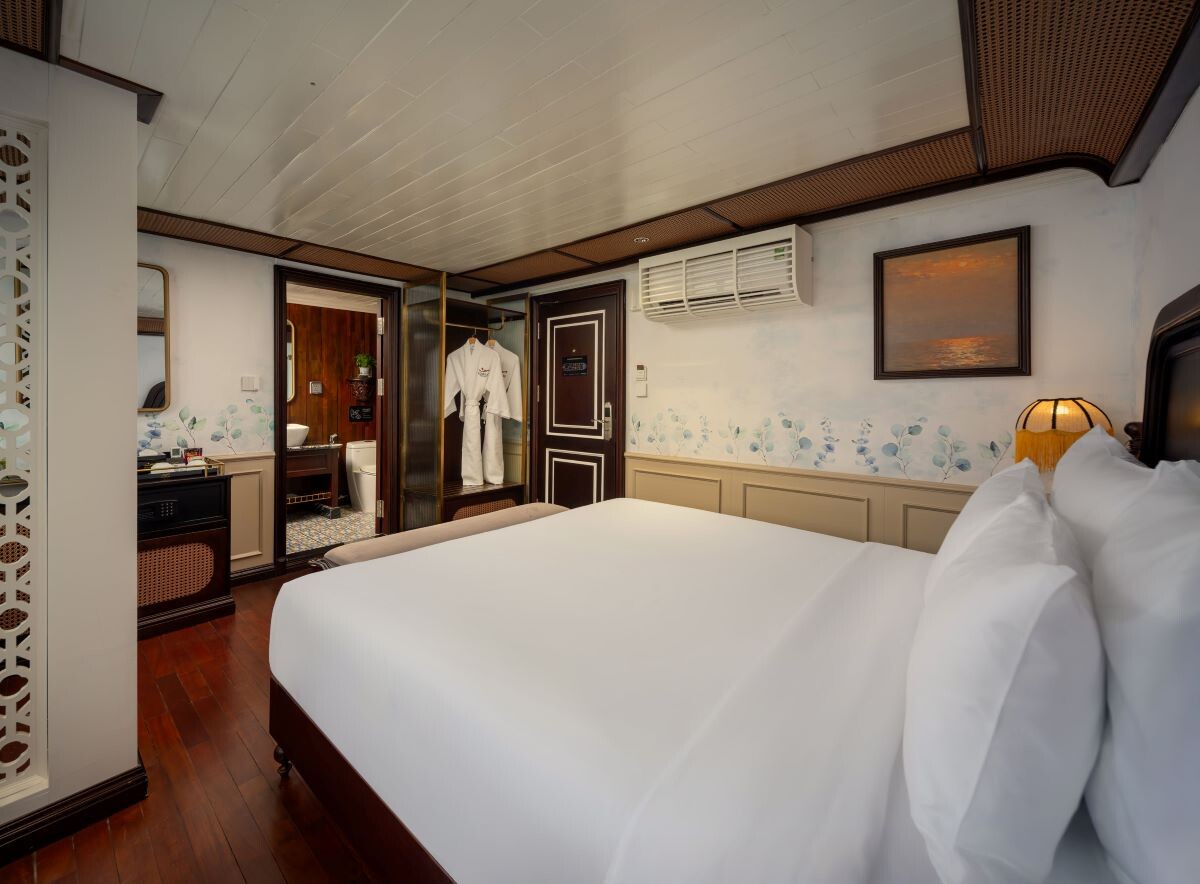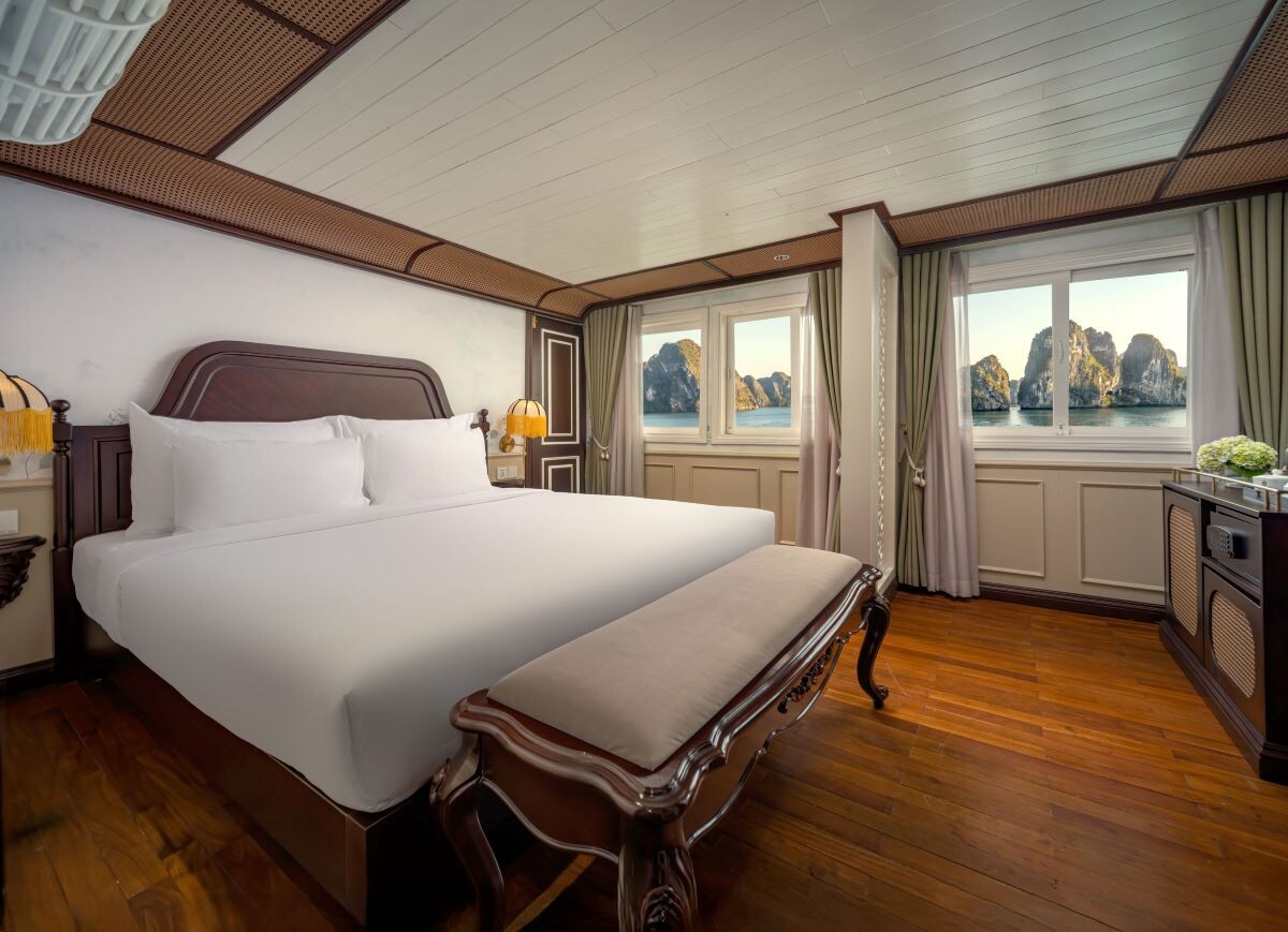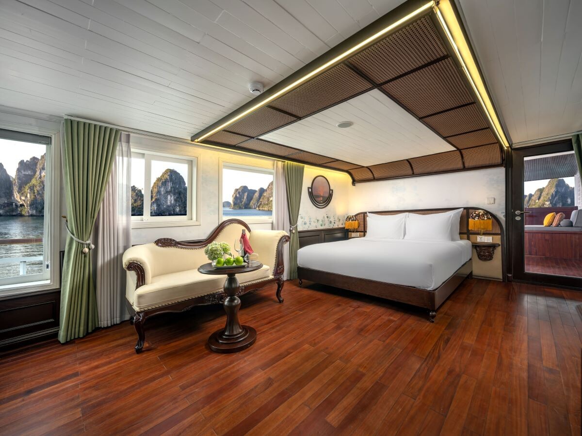 Launched in 2014, the Signature Royal Cruise is a distinguished member of the Athena Group, renowned for its professional service and luxurious voyages through the pristine Bai Tu Long Bay. Departing from Halong Cruise Port, this elegant cruise blends modern steel construction with classic Vietnamese wooden junk-inspired design, ensuring both safety and authentic charm. With only 15 spacious cabins designed for a maximum of 38 passengers, Signature Royal offers an intimate and personalized experience on the bay. Cabins range from 28 m² to 82 m², each featuring a private balcony, en-suite bathroom, and large windows framing sweeping sea views. Sailing the less-traveled route of Bai Tu Long Bay, guests explore some of Halong’s most serene and untouched destinations, including the Vung Vieng Floating Village, Cong Do Area, and the magnificent Thien Canh Son Cave. This unique itinerary allows travelers to enjoy both cultural encounters and natural beauty, away from the busy tourist routes. With its impeccable service, refined cuisine, and tranquil cruising pace, Signature Royal Cruise promises a sophisticated yet intimate journey into one of Vietnam’s most captivating UNESCO World Heritage sites.