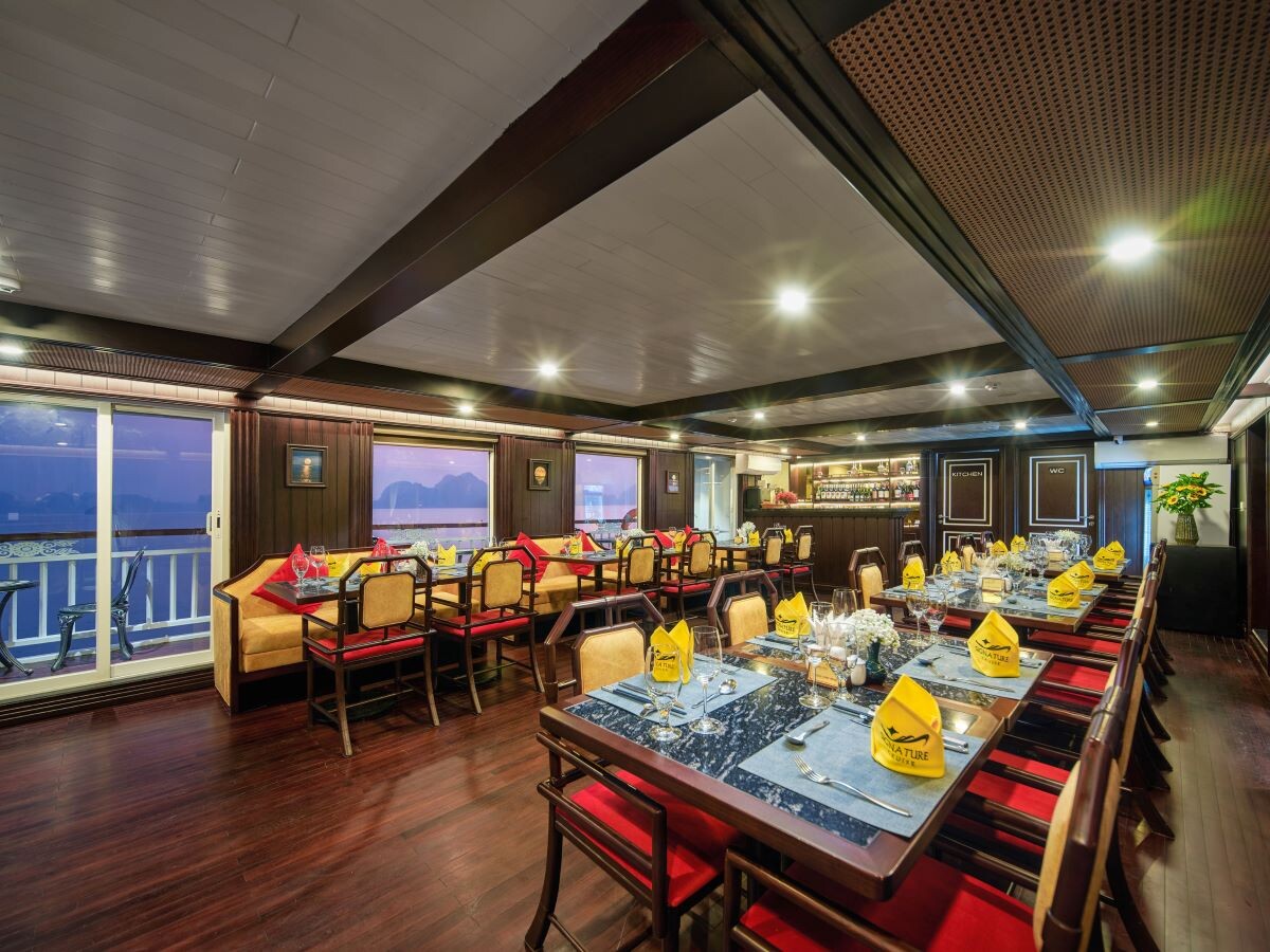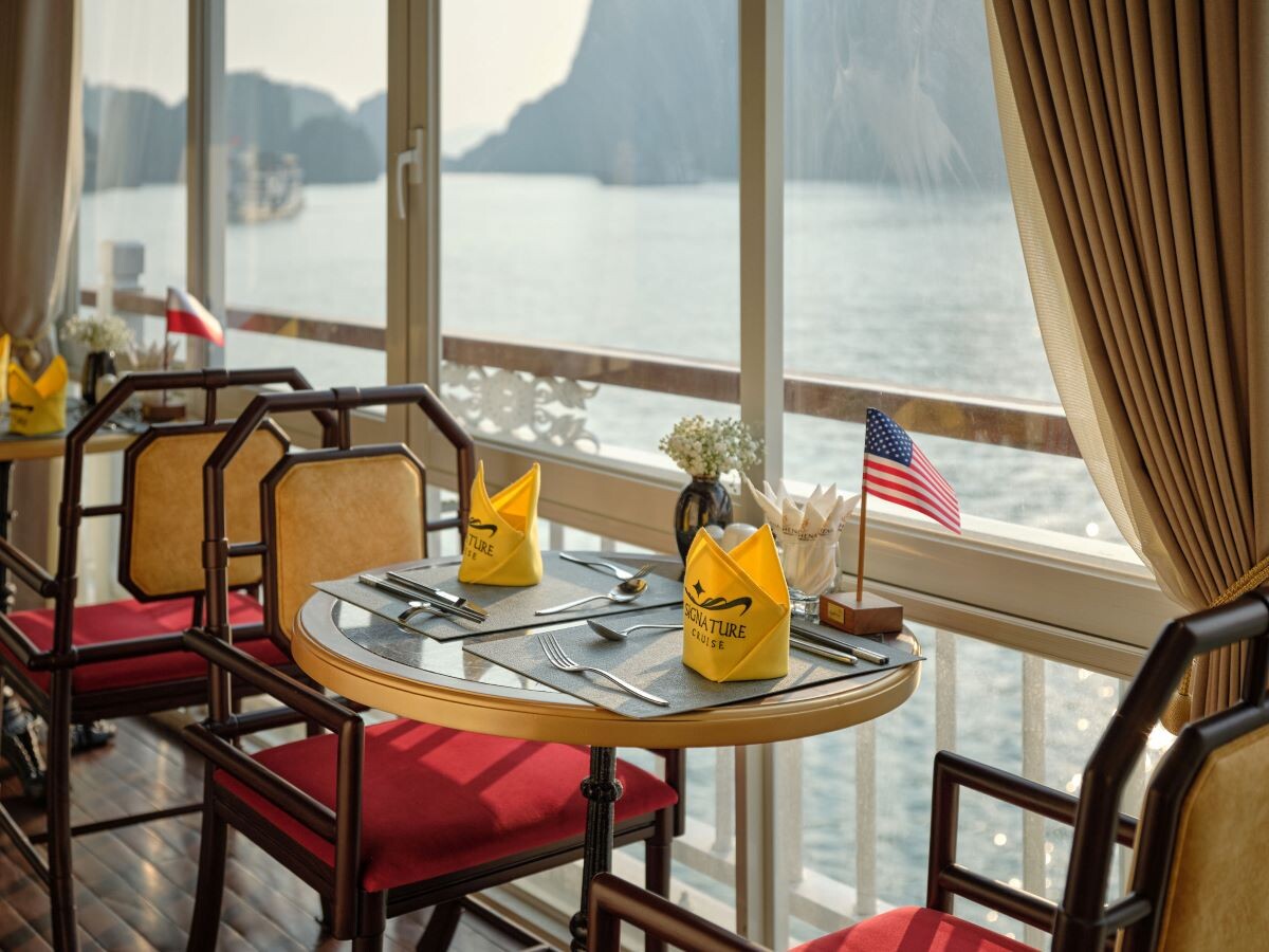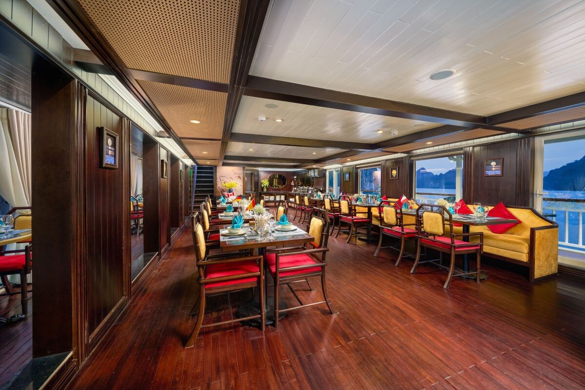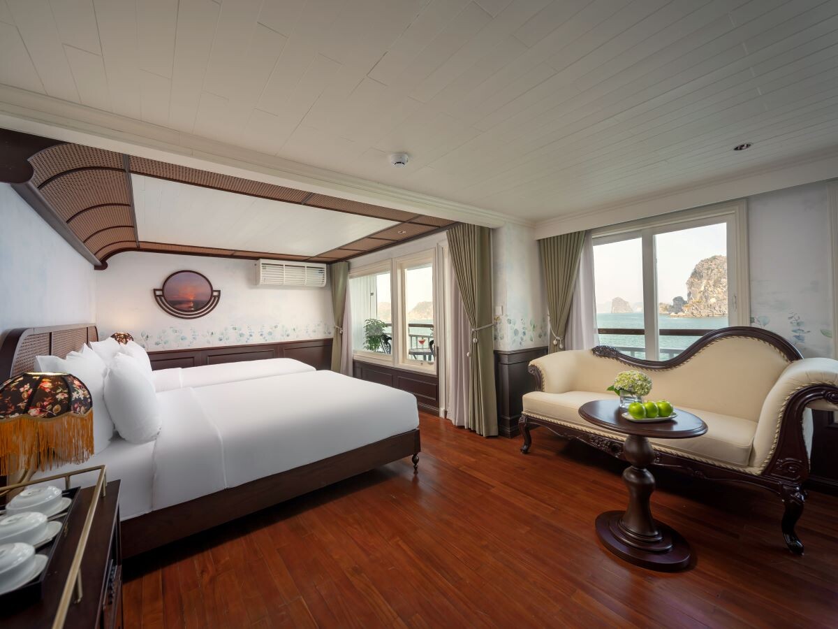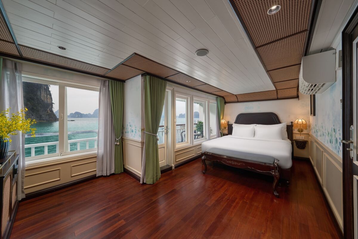 Launched in 2014, the Signature Royal Cruise is a distinguished member of the Athena Group, renowned for its professional service and luxurious voyages through the pristine Bai Tu Long Bay. Departing from Halong Cruise Port, this elegant cruise blends modern steel construction with classic Vietnamese wooden junk-inspired design, ensuring both safety and authentic charm. With only 15 spacious cabins designed for a maximum of 38 passengers, Signature Royal offers an intimate and personalized experience on the bay. Cabins range from 28 m² to 82 m², each featuring a private balcony, en-suite bathroom, and large windows framing sweeping sea views. Sailing the less-traveled route of Bai Tu Long Bay, guests explore some of Halong’s most serene and untouched destinations, including the Vung Vieng Floating Village, Cong Do Area, and the magnificent Thien Canh Son Cave. This unique itinerary allows travelers to enjoy both cultural encounters and natural beauty, away from the busy tourist routes. With its impeccable service, refined cuisine, and tranquil cruising pace, Signature Royal Cruise promises a sophisticated yet intimate journey into one of Vietnam’s most captivating UNESCO World Heritage sites.