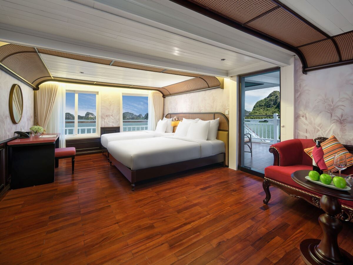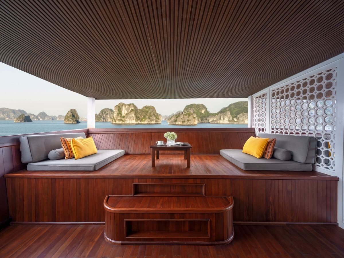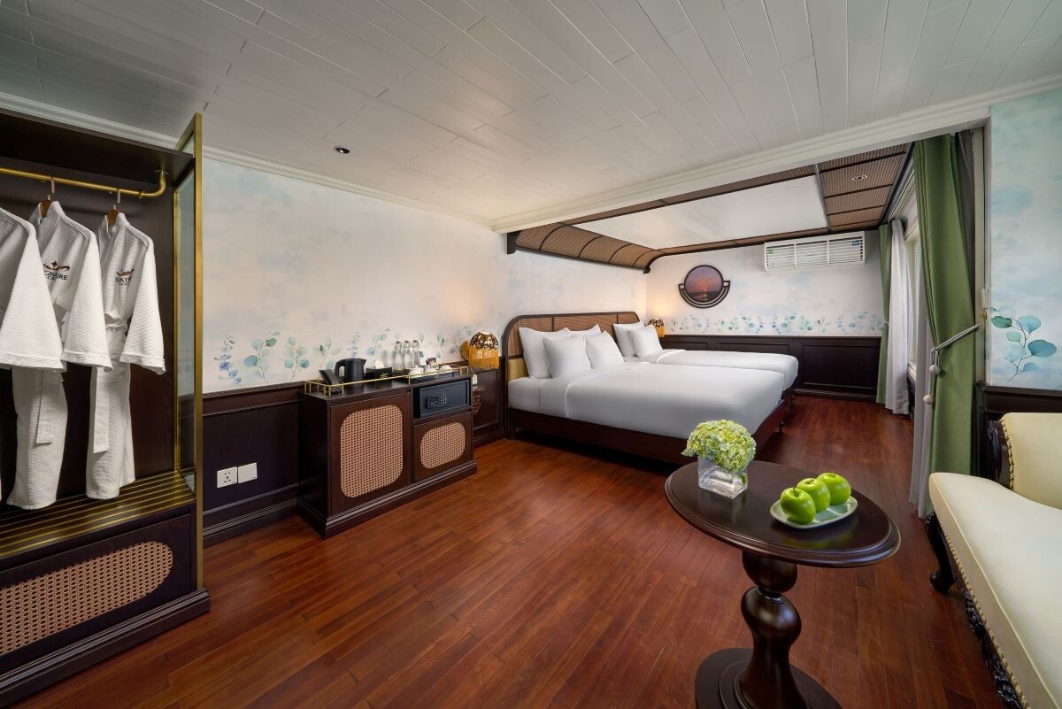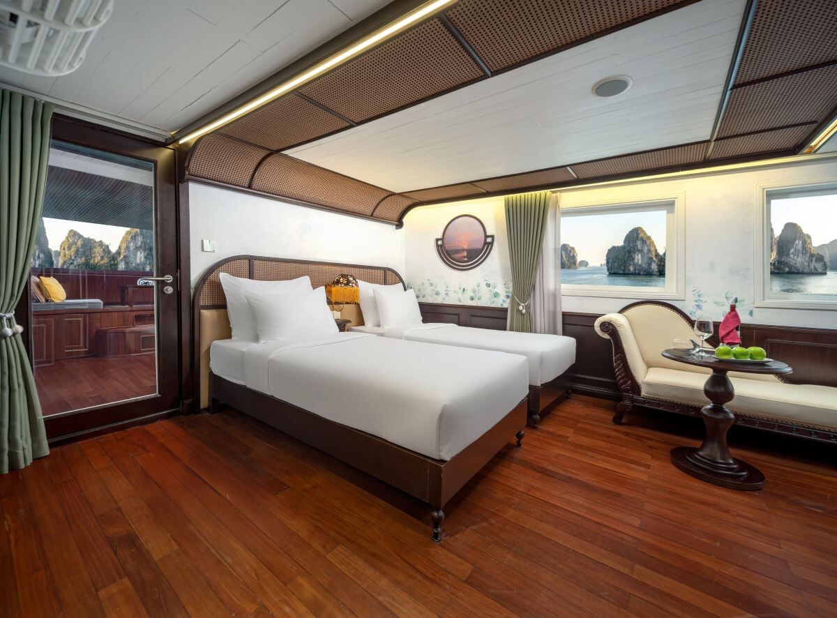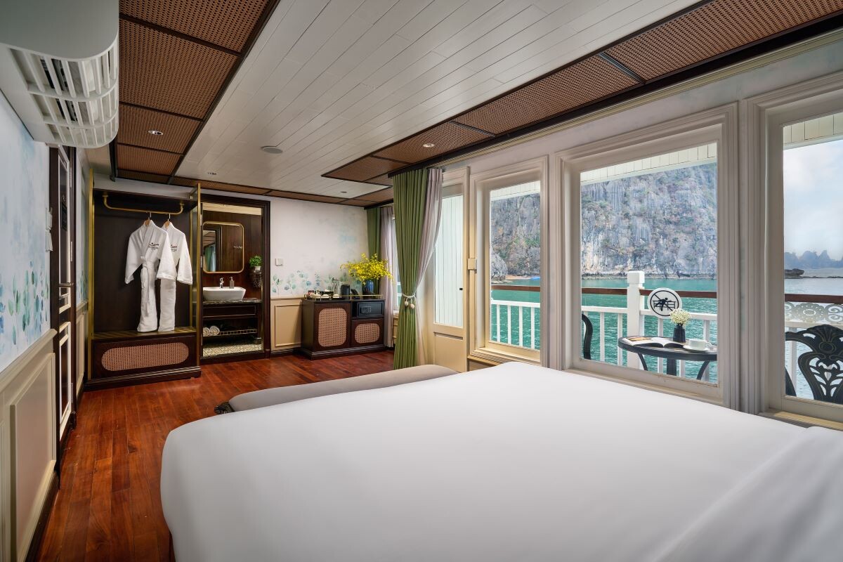Launched in 2014, the Signature Royal Cruise is a distinguished member of the Athena Group, renowned for its professional service and luxurious voyages through the pristine Bai Tu Long Bay. Departing from Halong Cruise Port, this elegant cruise blends modern steel construction with classic Vietnamese wooden junk-inspired design, ensuring both safety and authentic charm. With only 15 spacious cabins designed for a maximum of 38 passengers, Signature Royal offers an intimate and personalized experience on the bay. Cabins range from 28 m² to 82 m², each featuring a private balcony, en-suite bathroom, and large windows framing sweeping sea views. Sailing the less-traveled route of Bai Tu Long Bay, guests explore some of Halong’s most serene and untouched destinations, including the Vung Vieng Floating Village, Cong Do Area, and the magnificent Thien Canh Son Cave. This unique itinerary allows travelers to enjoy both cultural encounters and natural beauty, away from the busy tourist routes. With its impeccable service, refined cuisine, and tranquil cruising pace, Signature Royal Cruise promises a sophisticated yet intimate journey into one of Vietnam’s most captivating UNESCO World Heritage sites.
