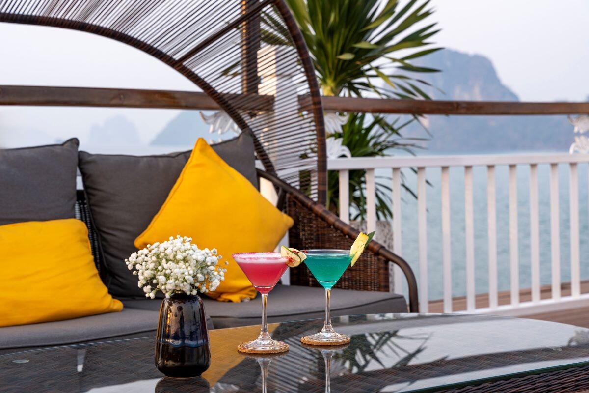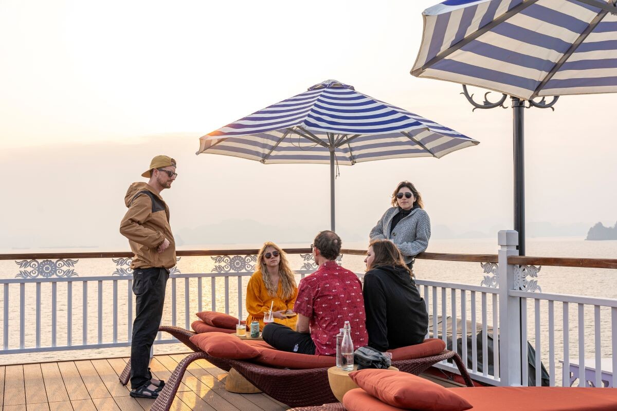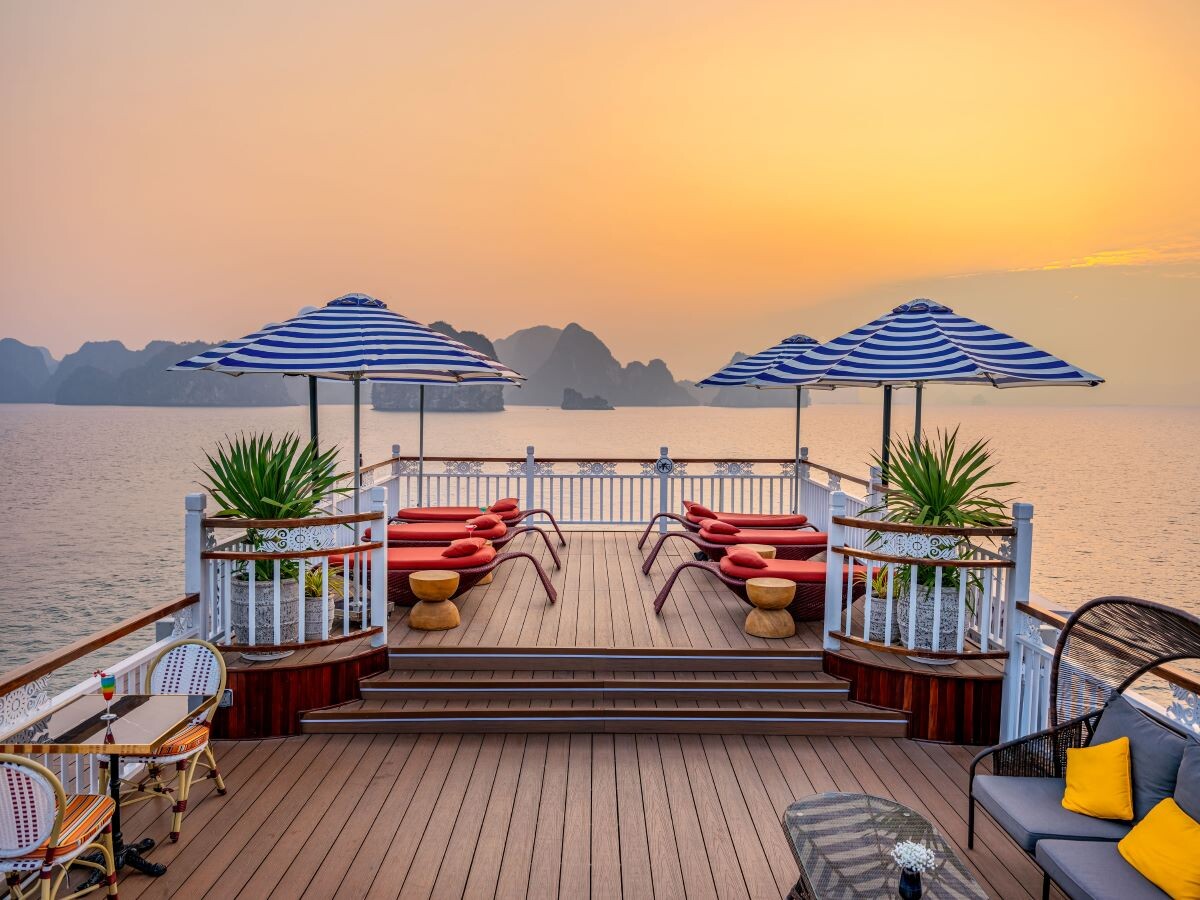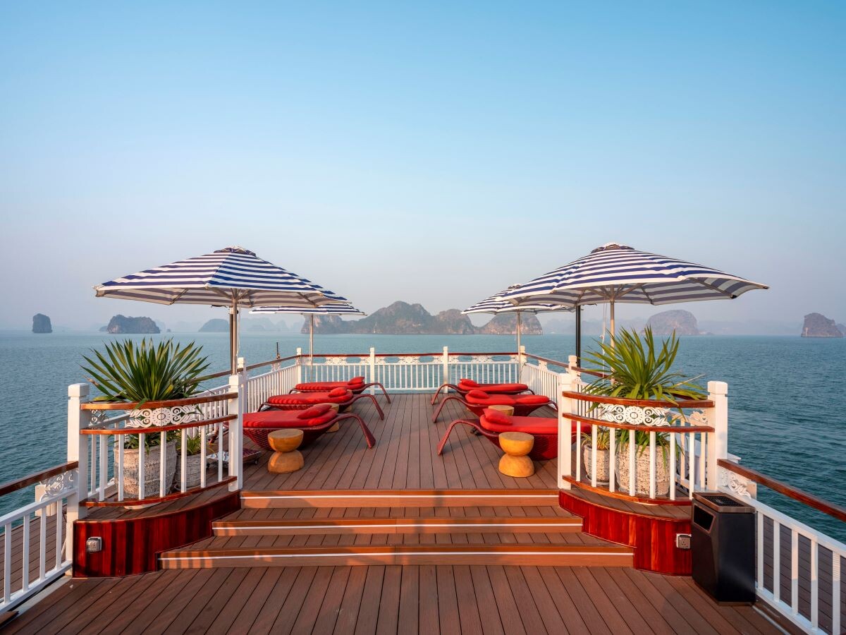 • Onboard activities: cave visit, squid fishing, Tai Chi class on the sundeck, Vietnamese cooking demonstration, and complimentary fruit tasting.