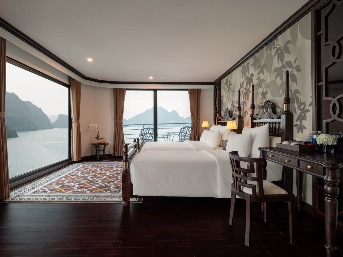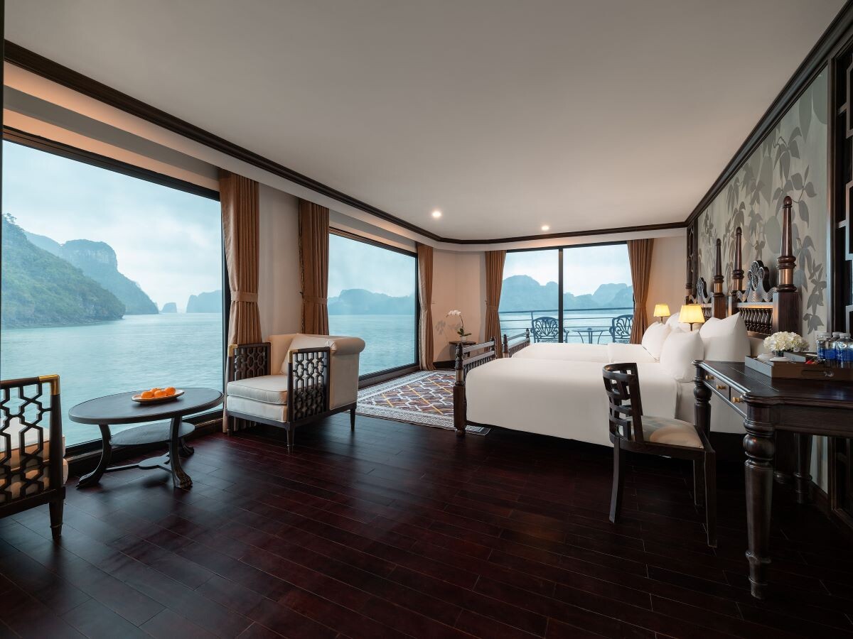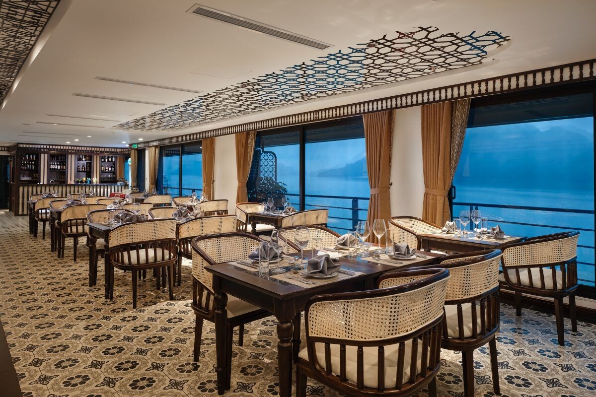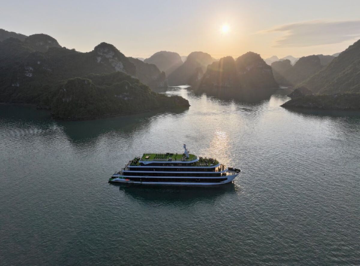 Launched in 2018 as Era Cruise and upgraded in 2023, Venus Cruise is a 5-star ultra-luxury cruise sailing through Halong Bay and Lan Ha Bay. Known for combining breathtaking scenery with impeccable service, Venus Cruise offers travelers an indulgent yet culturally enriching journey. The ship features 29 spacious cabins and suites ranging from 40m² to 210m², each with a private balcony (9m²) and Jacuzzi bathtub. The 210m² President Suite, the largest in Halong Bay, comes with a private terrace and butler service for a truly elevated experience. Onboard amenities include a 22m² outdoor pool, spa and massage facilities, a fully equipped gym, and a fine-dining restaurant with seating for 180 guests. Guests enjoy thoughtfully curated dining menus featuring Vietnamese specialties, international favorites, and authentic Indian cuisine. Its itineraries highlight the best of Lan Ha Bay with activities such as kayaking at Dark & Bright Cave, cycling to Viet Hai Village, and swimming at Ba Ham Lake, ensuring a perfect balance of relaxation and adventure.