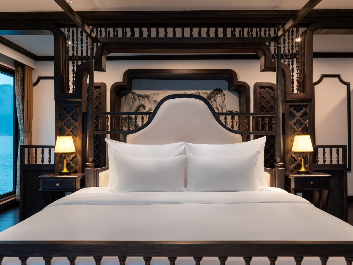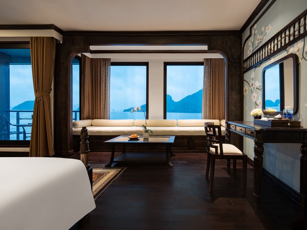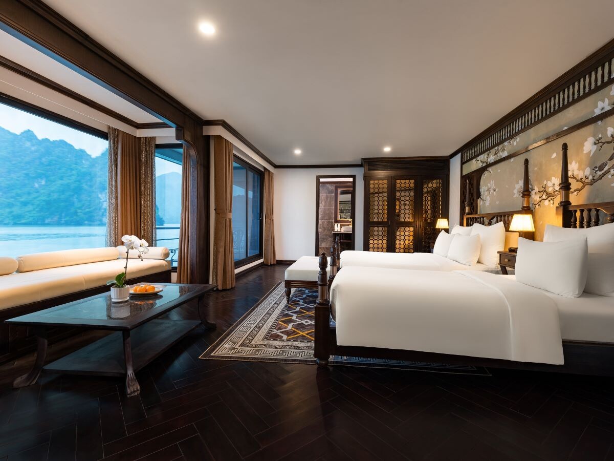 Launched in 2018 as Era Cruise and upgraded in 2023, Venus Cruise is a 5-star ultra-luxury cruise sailing through Halong Bay and Lan Ha Bay. Known for combining breathtaking scenery with impeccable service, Venus Cruise offers travelers an indulgent yet culturally enriching journey. The ship features 29 spacious cabins and suites ranging from 40m² to 210m², each with a private balcony (9m²) and Jacuzzi bathtub. The 210m² President Suite, the largest in Halong Bay, comes with a private terrace and butler service for a truly elevated experience. Onboard amenities include a 22m² outdoor pool, spa and massage facilities, a fully equipped gym, and a fine-dining restaurant with seating for 180 guests. Guests enjoy thoughtfully curated dining menus featuring Vietnamese specialties, international favorites, and authentic Indian cuisine. Its itineraries highlight the best of Lan Ha Bay with activities such as kayaking at Dark & Bright Cave, cycling to Viet Hai Village, and swimming at Ba Ham Lake, ensuring a perfect balance of relaxation and adventure.